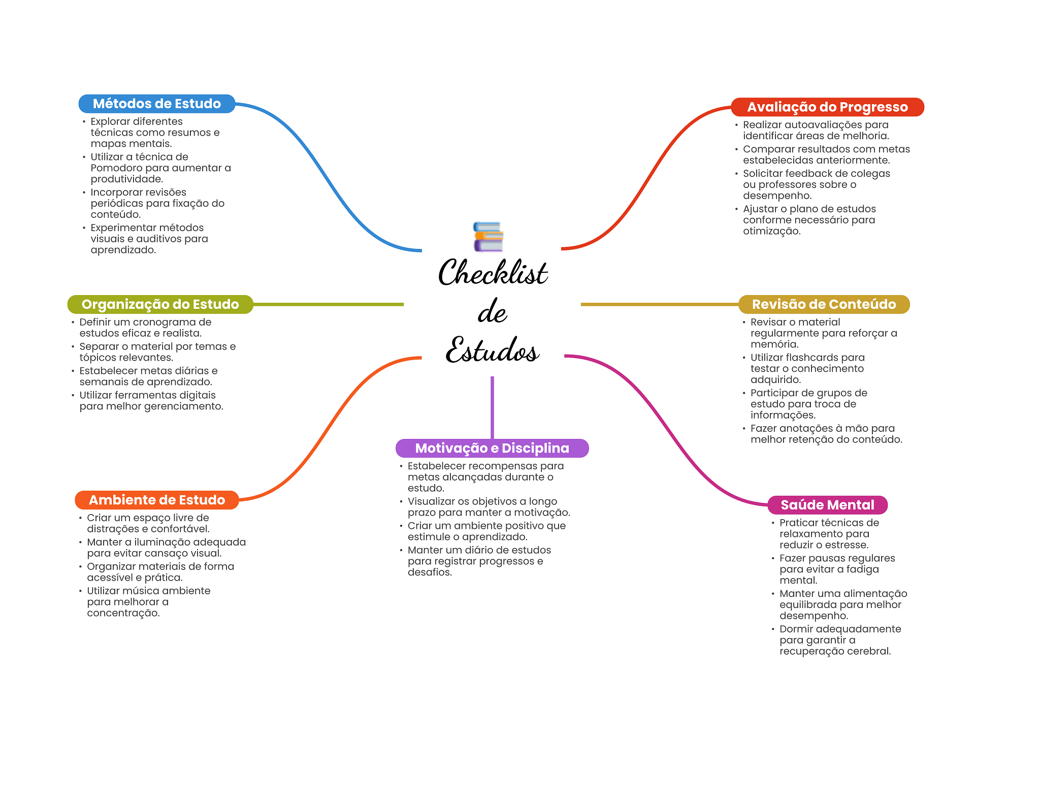 Métodos de Estudo Avaliação do Progresso Explorar diferentes Realizar autoavaliações para técnicas como resumos e identificar áreas de melhoria. mapas mentais. Comparar resultados com metas Utilizar a técnica de estabelecidas anteriormente. Pomodoro para aumentar a produtividade. Solicitar feedback de colegas ou professores sobre Incorporar revisões desempenho. periódicas para fixação do conteúdo. Ajustar plano de estudos conforme necessário para Experimentar métodos otimização. visuais e auditivos para aprendizado. Checklist Organização do Estudo de Revisão de Conteúdo Definir um cronograma de Revisar material estudos eficaz e realista. regularmente para reforçar a Separar material por temas e Estudos memória. tópicos relevantes. Utilizar flashcards para Estabelecer metas diárias e testar conhecimento semanais de aprendizado. adquirido. Utilizar ferramentas digitais Participar de grupos de para melhor gerenciamento. estudo para troca de informações. Fazer anotações à mão para melhor retenção do conteúdo. Motivação e Disciplina Estabelecer recompensas para metas alcançadas durante estudo. Ambiente de Estudo Visualizar OS objetivos a longo Saúde Mental Criar um espaço livre de prazo para manter a motivação. distrações e confortável. Criar um ambiente positivo que Praticar técnicas de Manter a iluminação adequada estimule O aprendizado. relaxamento para reduzir estresse. para evitar cansaço visual. Manter um diário de estudos para registrar progressos e Fazer pausas regulares Organizar materiais de forma desafios. para evitar a fadiga acessível e prática. mental. Utilizar música ambiente Manter uma alimentação para melhorar a equilibrada para melhor concentração. desempenho. Dormir adequadamente para garantir a recuperação cerebral.
