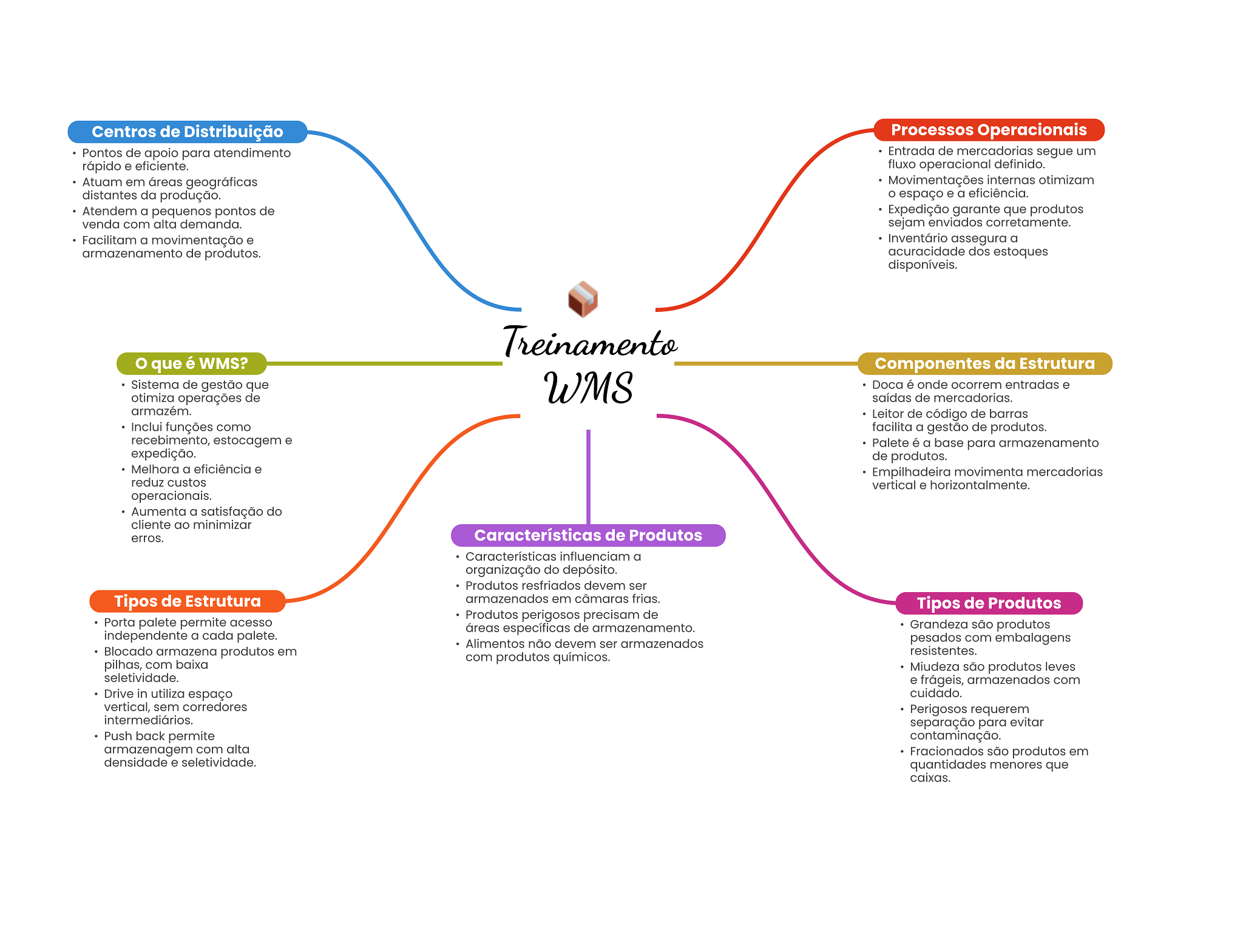 Centros de Distribuição Processos Operacionais Pontos de apoio para atendimento Entrada de mercadorias segue um rápido e eficiente. fluxo operacional definido. Atuam em áreas geográficas Movimentações internas otimizam distantes da produção. espaço e a eficiência. Atendem a pequenos pontos de Expedição garante que produtos venda com alta demanda. sejam enviados corretamente. Facilitam a movimentação e Inventário assegura a armazenamento de produtos. acuracidade dos estoques disponíveis. Treinamento que é WMS? Componentes da Estrutura Sistema de gestão que WMS Doca é onde ocorrem entradas e otimiza operações de saídas de mercadorias. armazém. Leitor de código de barras Inclui funções como facilita a gestão de produtos. recebimento, estocagem e Palete é a base para armazenamento expedição. de produtos. Melhora a eficiência e Empilhadeira movimenta mercadorias reduz custos vertical e horizontalmente. operacionais. Aumenta a satisfação do cliente ao minimizar erros. Características de Produtos Características influenciam a organização do depósito. Produtos resfriados devem ser Tipos de Estrutura armazenados em câmaras frias. Tipos de Produtos Produtos perigosos precisam de Porta palete permite acesso áreas específicas de armazenamento. Grandeza são produtos independente a cada palete. Alimentos não devem ser armazenados pesados com embalagens Blocado armazena produtos em resistentes. com produtos químicos. pilhas, com baixa Miudeza são produtos leves seletividade. e frágeis, armazenados com Drive in utiliza espaço cuidado. vertical, sem corredores Perigosos requerem intermediários. separação para evitar Push back permite contaminação. armazenagem com alta Fracionados são produtos em densidade e seletividade. quantidades menores que caixas.