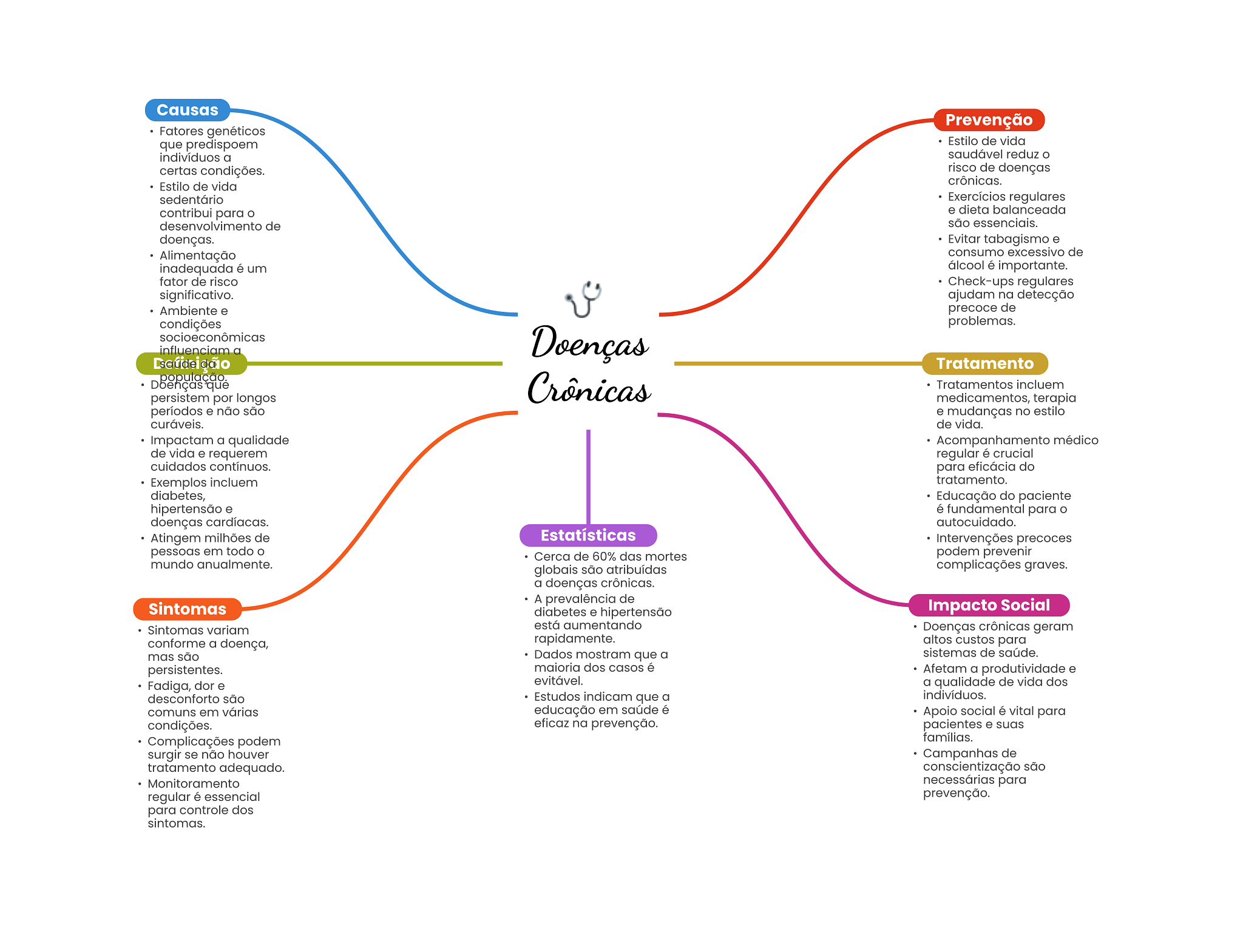 Causas Prevenção Fatores genéticos que predispoem Estilo de vida indivíduos a reduz o certas condições. risco de doenças Estilo de vida crônicas. sedentário Exercícios regulares contribui para e dieta balanceada desenvolvimento de são essenciais. doenças. Evitar tabagismo e Alimentação consumo excessivo de inadequada é um álcool é importante. fator de risco Check-ups regulares significativo. ajudam na detecção Ambiente e precoce de condições problemas. socioeconômicas influenciam a Doenças dão Tratamento Doenças que Crônicas Tratamentos incluem persistem por longos medicamentos, terapia períodos e não são e mudanças no estilo curáveis. de vida. Impactam a qualidade Acompanhamento médico de vida e requerem regular é crucial cuidados contínuos. para eficácia do Exemplos incluem tratamento. diabetes, Educação do paciente hipertensão e é fundamental para doenças cardíacas. autocuidado. Atingem milhões de Estatísticas Intervenções precoces pessoas em todo Cerca de 60% das mortes podem prevenir mundo anualmente. globais são atribuídas complicações graves. a doenças crônicas. A prevalência de Sintomas diabetes e hipertensão Impacto Social Sintomas variam está aumentando Doenças crônicas geram conforme a doença, rapidamente. altos custos para mas são Dados mostram que a sistemas de saúde. persistentes. maioria dos casos é Afetam a produtividade e Fadiga, dor e evitável. a qualidade de vida dos desconforto são Estudos indicam que a indivíduos. comuns em várias educação em saúde é Apoio social é vital para condições. eficaz na prevenção. pacientes e suas Complicações podem famílias. surgir se não houver Campanhas de tratamento adequado. conscientização são Monitoramento necessárias para regular é essencial prevenção. para controle dos sintomas.