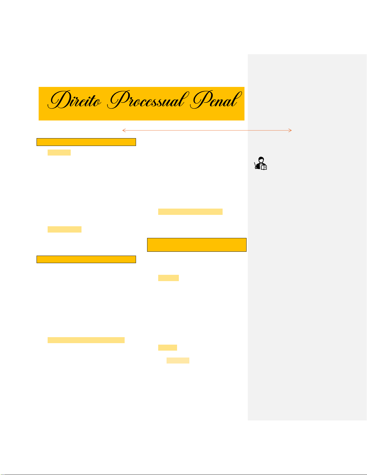 2025.1 1o bimestre Criado por: Letícia da Silva Pereira. Processo e Procedimento Processo x procedimento: → Processo: para Renato Marcão, processo é “um instrumento democrático de que se vale o Estado para dar resposta à pretensão punitiva e fazer justiça”. • Ou seja, é uma série de atos concatenados entre si. • Nulla poena sine iudicio (nenhuma pena senão em juízo). → Procedimento: é uma sequência de atos que desenvolve o processo com seus rituais do início ao fim. Princípios incidentais: → Faz-se necessário entender que alguns princípios são imperiosos p/ um processo justo. → Assim, dentro de cada procedimento processual há de ter: devido processo legal, direito à defesa, direito à forma, direito a um processo célere, direito à citação, contraditório, ampla defesa. → Princípio da ordem consecutiva: no trâmite do processo é imperioso seguir a ordem disposta em lei. Todos os atos coordenados e complexos determinados em lei devem ser atendidos, marchando de acordo com a sucessão lógica. “O juiz não pode suprimir validamente, por sua vontade, e nem mesmo com a concordância das partes, atos ou fases do procedimento tipificado; implantar procedimento não previsto em lei ou mesmo inverter a ordem de qualquer procedimento expressamente regulado”. Renato Marcão. → Pas de nullité sans grief: não se declara nulidade sem que se demonstre a existência de prejuízo que dela decorreu. Procedimento Comum e Procedimento Especial: → Art. 394, CPP subdivide os procedimentos em comum e especial. → Especial: o procedimento será especial quando for: a) Tribunal do Júri; b) Crimes praticados por funcionário público contra a administração pública (arts. 513 a 518, CPP). c) Crimes contra a honra (arts. 519 a 523, CPP). d) Lei 11.343/2006 (Lei Antidrogas). → Comum: a) Ordinário: pena máxima for igual ou superior a 4 anos. 2025.1 1o bimestre Criado por: Letícia da Silva Pereira. b) Sumário: pena máxima for inferior a 4 e maior que 2 anos (ou seja, 3). c) Sumaríssimo: pena máxima menor que 2 anos. → A escolha do procedimento depende da quantidade da pena máxima atribuída ao crime. Quando for atribuído mais de um tipo penal (crime) ao réu, as penas máximas das referidas infrações deverão ser somadas p/ a escolha do procedimento. → Tanto o procedimento ordinário, quanto o sumário estão previstos no CPP. → O procedimento sumaríssimo está previsto na lei 9099/1995. → Processos que apurem crime hediondo ou violência doméstica contra a mulher terão prioridade de tramitação em todas as instâncias, nos termos do art. 394-A do CPP. → As disposições do procedimento ordinário serão aplicadas em todos os outros ritos (especial, sumário e sumaríssimo) de modo subsidiário. Art. 394, §5, CPP. Procedimento ordinário: arts. 395 a 404 do CPP. → Rejeição da denúncia ou queixa: • Ofertada a denúncia ou queixa, o juiz deverá analisar os requisitos formais podendo receber ou rejeitar a ação penal. • Será rejeitada a inicial acusatória quando for: art. 395 do CPP. 1. Inepta: a ação será inepta quando não preencher os requisitos do art. 41, CPP. Consoante doutrina e jurisprudência majoritárias, apenas a falha na exposição do fato e suas circunstâncias, bem como a qualificação do acusado ou sinais que permitem sua individualização é que autorizam a rejeição da denúncia. Precisa ser uma inépcia manifesta porque deve estar evidente, indubitável. A exposição dos fatos com todas as circunstâncias é requisito essencial na medida em que o réu se defende dos fatos em que lhe foram atribuídos na exordial e não propriamente da capitulação jurídica (tipificação) atribuída a sua conduta. No tocante a capitulação jurídica, não há possibilidade de inépcia porquanto o réu se defende dos fatos; além do juiz poder dar definição jurídica ao fato. Art. 383, CPP. Art. 394-A, CPP: Os processos que apurem a prática de crime hediondo terão prioridade de tramitação em todas as instâncias. Art. 383, CPP: O juiz, sem modificar a descrição do fato contida na denúncia ou queixa, poderá atribuir-lhe definição jurídica diversa, ainda que, em consequência, tenha de aplicar pena mais grave. 2025.1 1o bimestre Criado por: Letícia da Silva Pereira. 2. Ausência de condição da ação e pressupostos processuais: são condições da ação: legitimidade, interesse de agir, representação e requisição. São pressupostos processuais: capacidade, juiz revestido de jurisdição, competência, litispendência, falta de suspeição, coisa julgada etc. 3. Ausência de justa causa: quando falta a certeza de materialidade e indícios de autoria. Não havendo correlação entre o acervo probatório e a acusação, a exordial deve ser rejeitada por ausência de justa causa. Súmula 696, STF: OBS: Segundo entendimento do STJ, o momento certo para o ajuste da capitulação trazida na denúncia ocorre na decisão da sentença, nos termos do art. 383, CPP. → Recebimento da denúncia ou queixa: • Se não for caso de rejeição, o juiz proferirá decisão de recebimento da denúncia ou queixa. • Para a doutrina e os Tribunais Superiores, o processo se inicia com o despacho de recebimento. • A decisão de recebimento, consoante art. 93, IX, CF, deve ser motivada, embora prescinda de robustez. • O recebimento da denúncia é imediato e marca a interrupção da prescrição. → Citação e resposta escrita: • Na decisão de recebimento o juiz determinará a citação do acusado, que poderá ser: 1. Pessoal: é a regra no CPP. Atualmente pode acontecer por meio de redes sociais como WhatsApp. Se o réu estiver preso no foro onde tramita o processo, a citação pessoal é obrigatória sob pena de nulidade. 2. Citação por hora certa: caso o oficial de justiça tente encontrar o réu por 2x e não encontre e suspeite que está se ocultando p/ não ser citado, poderá citá-lo por hora cer