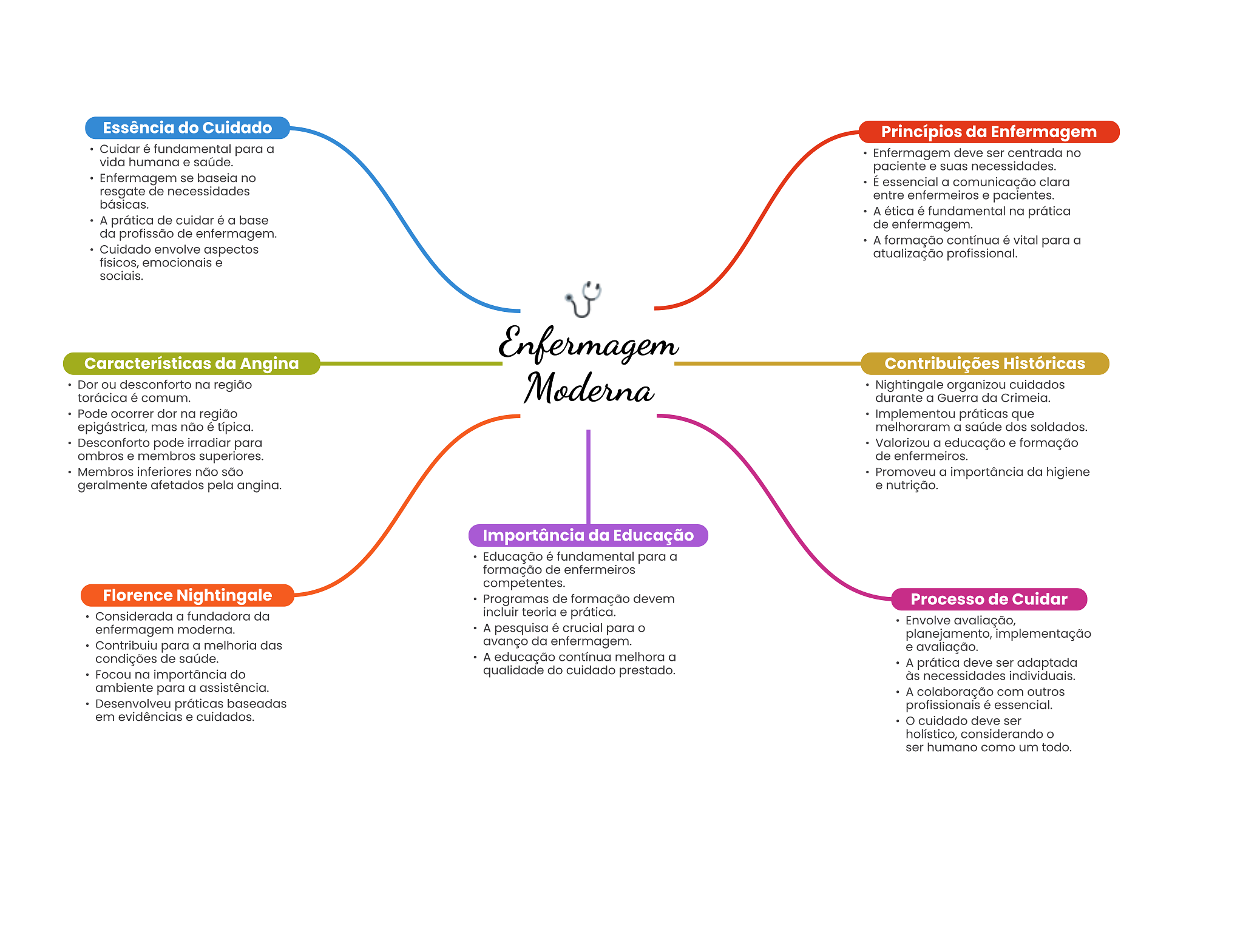 Essência do Cuidado Princípios da Enfermagem Cuidar é fundamental para a Enfermagem deve ser centrada no vida humana e saúde. paciente e suas necessidades. Enfermagem se baseia no É essencial a comunicação clara resgate de necessidades entre enfermeiros e pacientes. básicas. A ética é fundamental na prática A prática de cuidar é a base de enfermagem. da profissão de enfermagem. A formação contínua é vital para a Cuidado envolve aspectos atualização profissional. físicos, emocionais e sociais. Enfermagem Características da Angina Contribuições Históricas Dor ou desconforto na região torácica é comum. Moderna Nightingale organizou cuidados durante a Guerra da Crimeia. Pode ocorrer dor na região Implementou práticas que epigástrica, mas não é típica. melhoraram a saúde dos soldados. Desconforto pode irradiar para Valorizou a educação e formação ombros e membros superiores. de enfermeiros. Membros inferiores não são Promoveu a importância da higiene geralmente afetados pela angina. e nutrição. Importância da Educação Educação é fundamental para a formação de enfermeiros competentes. Florence Nightingale Programas de formação devem Processo de Cuidar Considerada a fundadora da incluir teoria e prática. Envolve avaliação, enfermagem moderna. A pesquisa é crucial para planejamento, implementação Contribuiu para a melhoria das avanço da enfermagem. e avaliação. condições de saúde. A educação contínua melhora a A prática deve ser adaptada Focou na importância do qualidade do cuidado prestado. às necessidades individuais. ambiente para a assistência. A colaboração com outros Desenvolveu práticas baseadas profissionais é essencial. em evidências e cuidados. O cuidado deve ser holístico, considerando ser humano como um todo.