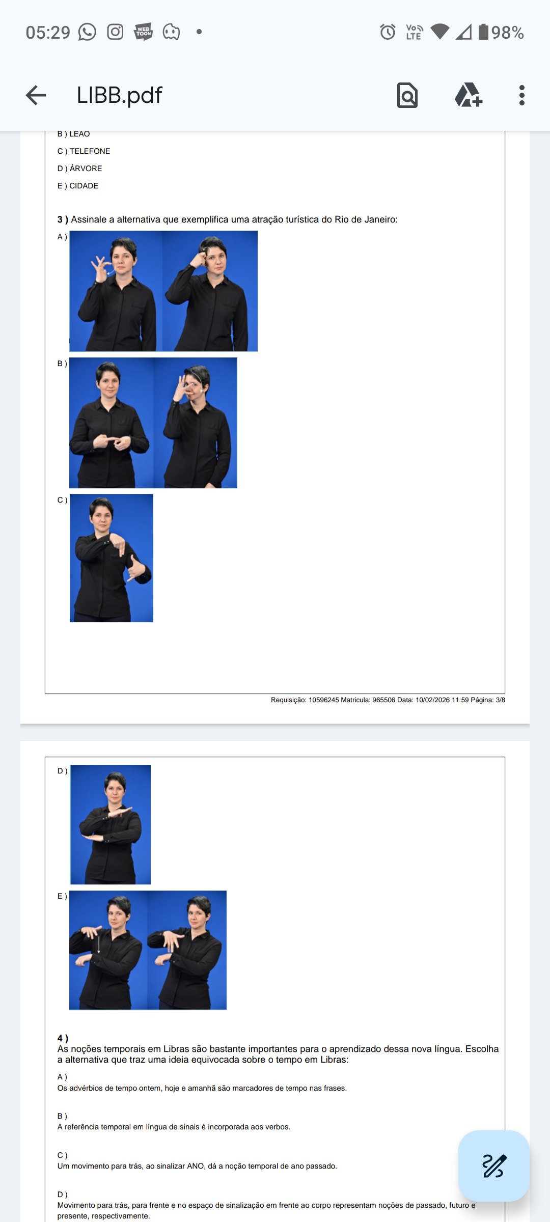 05:29 LTE 98% LIBB.pdf + B LEAO C) TELEFONE D ÁRVORE E CIDADE 3) Assinale a alternativa que exemplifica uma atração turística do Rio de Janeiro: A) B) C) Requisição: 10596245 Matricula: 965506 Data: 10/02/2026 11:59 Página: 3/8 D) E) 4) As noções temporais em Libras são bastante importantes para aprendizado dessa nova língua. Escolha a alternativa que traz uma ideia equivocada sobre tempo em Libras: A) Os advérbios de tempo ontem, hoje e amanhã são marcadores de tempo nas frases. B) A referência temporal em língua de sinais é incorporada aos verbos. C) Um movimento para trás, ao sinalizar ANO, dá a noção temporal de ano passado. D) Movimento para trás, para frente e no espaço de sinalização em frente ao corpo representam noções de passado, futuro e presente, respectivamente.