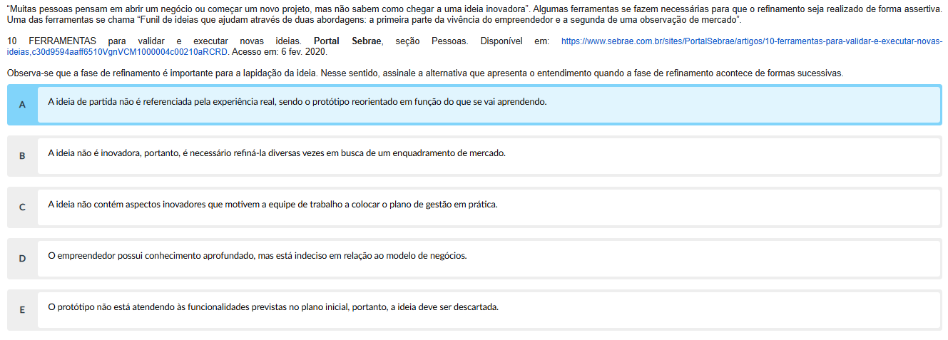 "Muitas pessoas pensam em abrir um ou começar um novo projeto, mas não sabem como chegar a uma ideia Algumas ferramentas se fazem necessárias para que 0 refinamento seja realizado de forma assertiva. Uma das ferramentas se chama "Funil de ideias que ajudam através de duas abordagens: a primeira parte da do empreendedor e a segunda de uma observação de 10 FERRAMENTAS para validar e executar novas ideias. Portal Sebrae, seção Pessoas. Disponível em: deias,c30d9594aaff6510VgnVCM1000004c00210aRCRD Acesso em: 6 fev. 2020. Observa-se que a fase de refinamento é importante para a lapidação da ideia. Nesse sentido, assinale a alternativa que apresenta 0 entendimento quando a fase de refinamento acontece de formas A A ideia de partida não é referenciada pela experiência real, sendo protótipo reorientado em função do que se vai aprendendo. B A ideia não é inovadora, portanto, é necessário refiná-la diversas vezes em busca de um enquadramento de mercado. C A ideia não contém aspectos inovadores que motivem a equipe de trabalho a colocar plano de gestão em prática. D O empreendedor possui conhecimento aprofundado, mas está indeciso em relação ao modelo de negócios. E O protótipo não está atendendo às funcionalidades previstas no plano inicial, portanto, a ideia deve ser descartada.