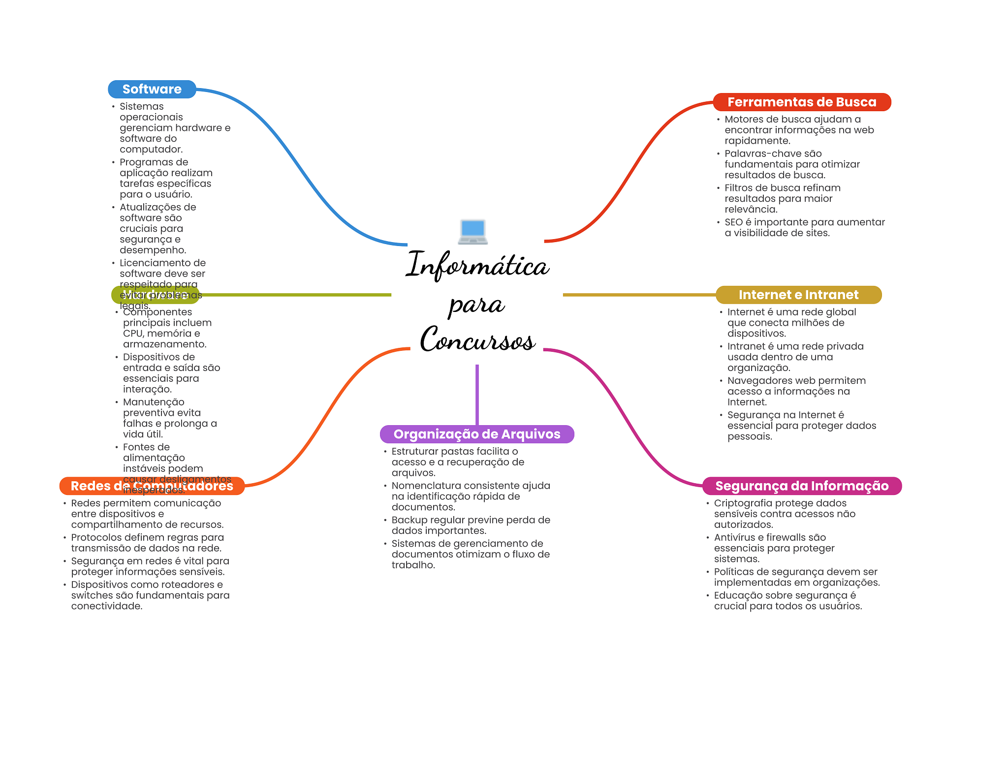 Software Sistemas Ferramentas de Busca operacionais Motores de busca ajudam a gerenciam hardware e encontrar informações na web software do rapidamente. computador. Palavras-chave são Programas de fundamentais para otimizar aplicação realizam resultados de busca. tarefas específicas Filtros de busca refinam para usuário. resultados para maior Atualizações de relevância. software são SEO é importante para aumentar cruciais para a visibilidade de sites. segurança e desempenho. Licenciamento de software deve ser Informática respeitado para evitar problem as Internet e Intranet Componentes para Internet é uma rede global principais incluem que conecta milhões de CPU, memória e armazenamento. Concursos dispositivos. Intranet é uma rede privada Dispositivos de usada dentro de uma entrada e saída são organização. essenciais para Navegadores web permitem interação. acesso a informações na Manutenção Internet. preventiva evita Segurança na Internet é falhas e prolonga a essencial para proteger dados vida útil. Organização de Arquivos pessoais. Fontes de Estruturar pastas facilita O alimentação acesso e a recuperação de instáveis podem arquivos. Redes de Computadores Nomenclatura consistente ajuda Segurança da Informação na identificação rápida de Redes permitem comunicação documentos. Criptografia protege dados entre dispositivos e sensíveis contra acessos não compartilhamento de recursos. Backup regular previne perda de autorizados. dados importantes. Protocolos definem regras para Antivírus e firewalls são transmissão de dados na rede. Sistemas de gerenciamento de documentos otimizam fluxo de essenciais para proteger Segurança em redes é vital para sistemas. trabalho. proteger informações sensíveis. Políticas de segurança devem ser Dispositivos como roteadores e implementadas em organizações. switches são fundamentais para Educação sobre segurança é conectividade. crucial para todos usuários.