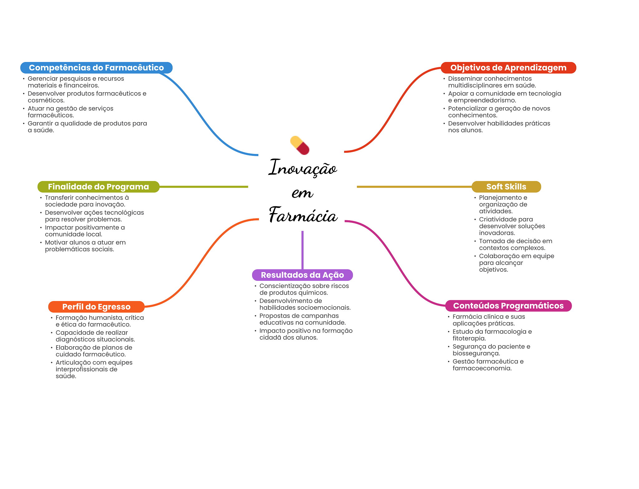 Competências do Farmacêutico Objetivos de Aprendizagem Gerenciar pesquisas e recursos Disseminar conhecimentos materiais e financeiros. multidisciplinares em saúde. Desenvolver produtos farmacêuticos e Apoiar a comunidade em tecnologia cosméticos. e empreendedorismo. Atuar na gestão de serviços Potencializar a geração de novos farmacêuticos. conhecimentos. Garantir a qualidade de produtos para Desenvolver habilidades práticas a saúde. nos alunos. Inovação Finalidade do Programa Soft Skills Transferir conhecimentos à em Planejamento e sociedade para inovação. organização de Desenvolver ações tecnológicas para resolver problemas. Farmácia atividades. Criatividade para Impactar positivamente a desenvolver soluções comunidade local. inovadoras. Motivar alunos a atuar em Tomada de decisão em problemáticas sociais. contextos complexos. Colaboração em equipe para alcançar objetivos. Resultados da Ação Conscientização sobre riscos de produtos químicos. de Perfil do Egresso habilidades socioemocionais. Conteúdos Programáticos Formação humanista, crítica Propostas de campanhas Farmácia clínica e suas e ética do farmacêutico. educativas na comunidade. aplicações práticas. Capacidade de realizar Impacto positivo na formação Estudo da farmacologia e diagnósticos situacionais. cidadã dos alunos. fitoterapia. Elaboração de planos de Segurança do paciente e cuidado farmacêutico. biossegurança. Articulação com equipes Gestão farmacêutica e interprofissionais de farmacoeconomia. saúde.