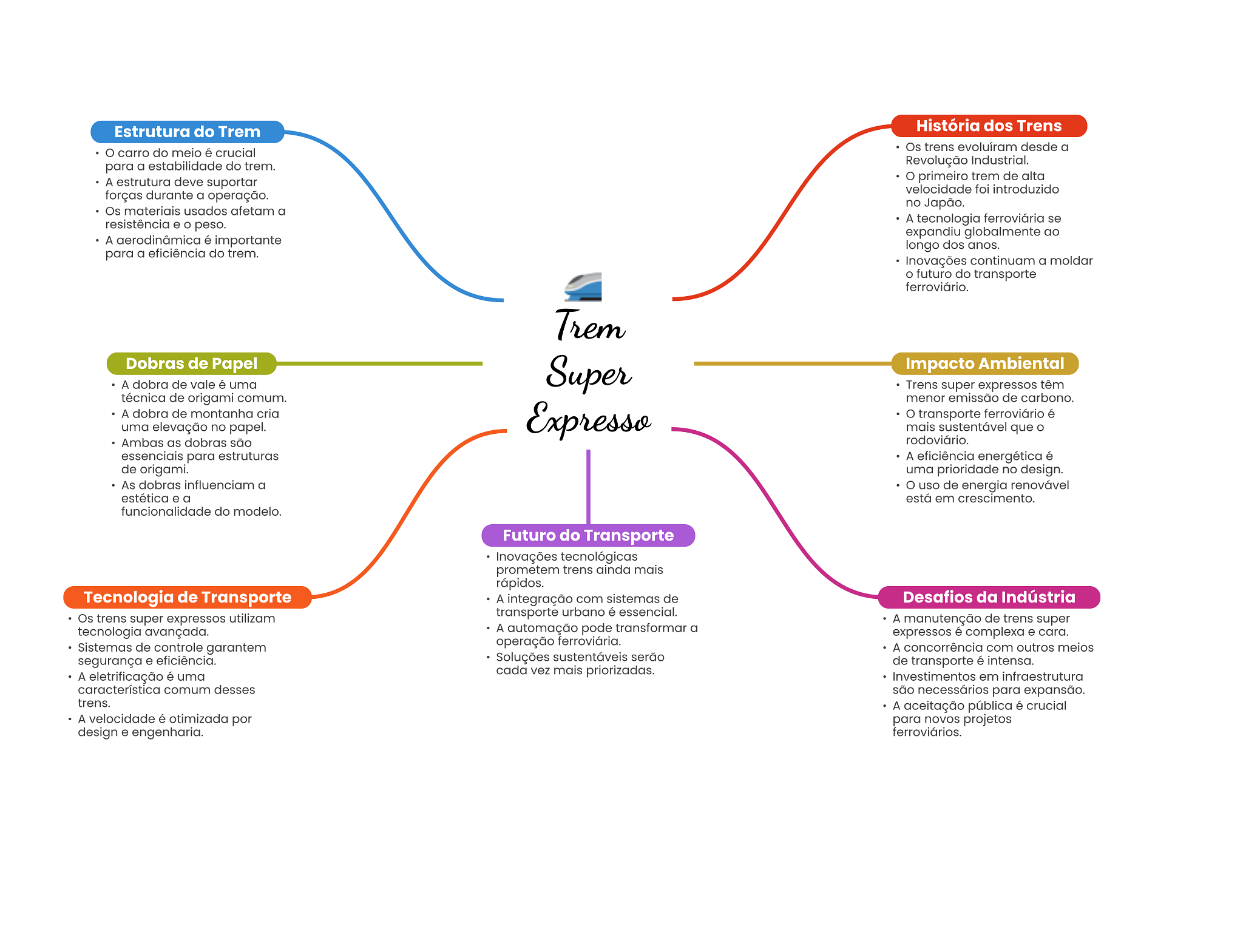 Estrutura do Trem História dos Trens Os trens evoluíram desde a carro do meio é crucial para a estabilidade do trem. Revolução Industrial. A estrutura deve suportar primeiro trem de alta velocidade foi introduzido forças durante a operação. no Japão. Os materiais usados afetam a resistência e peso. A tecnologia ferroviária se expandiu globalmente ao A aerodinâmica é importante longo dos anos. para a eficiência do trem. Inovações continuam a moldar O futuro do transporte ferroviário. Trem Dobras de Papel Super Impacto Ambiental A dobra de vale é uma Trens super expressos têm técnica de origami comum. menor emissão de carbono. A dobra de montanha cria Expresso O transporte ferroviário é uma elevação no papel. mais sustentável que Ambas as dobras são rodoviário. essenciais para estruturas A eficiência energética é de origami. uma prioridade no design. As dobras influenciam a O uso de energia renovável estética e a está em crescimento. funcionalidade do modelo. Futuro do Transporte Inovações tecnológicas prometem trens ainda mais rápidos. Tecnologia de Transporte A integração com sistemas de Desafios da Indústria Os trens super expressos utilizam transporte urbano é essencial. A manutenção de trens super tecnologia avançada. A automação pode transformar a expressos é complexa e cara. Sistemas de controle garantem operação ferroviária. A concorrência com outros meios segurança e eficiência. Soluções sustentáveis serão de transporte é intensa. A eletrificação é uma cada vez mais priorizadas. Investimentos em infraestrutura característica comum desses são necessários para expansão. trens. A aceitação pública é crucial A velocidade é otimizada por para novos projetos design e engenharia. ferroviários.