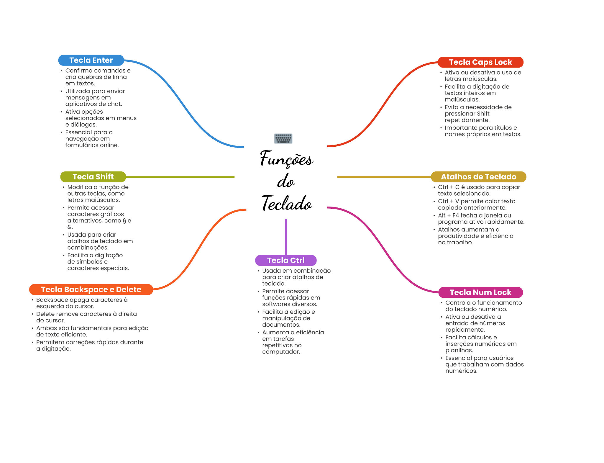 Tecla Enter Tecla Caps Lock Confirma comandos e Ativa ou desativa uso de cria quebras de linha letras maiúsculas. em textos. Facilita a digitação de Utilizada para enviar textos inteiros em mensagens em maiúsculas. aplicativos de chat. Evita a necessidade de Ativa opções pressionar Shift selecionadas em menus repetidamente. e diálogos. Importante para títulos e Essencial para a nomes próprios em textos. navegação em formulários online. Funções Tecla Shift do Atalhos de Teclado Modifica a função de Ctrl + C é usado para copiar outras teclas, como texto selecionado. letras maiúsculas. Teclado Ctrl + V permite colar texto Permite acessar copiado anteriormente. caracteres gráficos Alt + F4 fecha a janela ou alternativos, como § e programa ativo rapidamente. &. Atalhos aumentam a Usada para criar produtividade e eficiência atalhos de teclado em no trabalho. combinações. Facilita a digitação de símbolos e Tecla Ctrl caracteres especiais. Usada em combinação para criar atalhos de teclado. Tecla Backspace e Delete Permite acessar Tecla Num Lock Backspace apaga caracteres à funções rápidas em esquerda do cursor. softwares diversos. Controla O funcionamento do teclado numérico. Delete remove caracteres à direita Facilita a edição e manipulação de Ativa ou desativa a do cursor. documentos. entrada de números Ambas são fundamentais para edição de texto eficiente. Aumenta a eficiência rapidamente. em tarefas Facilita cálculos e Permitem correções rápidas durante a digitação. repetitivas no inserções numéricas em computador. planilhas. Essencial para usuários que trabalham com dados numéricos.