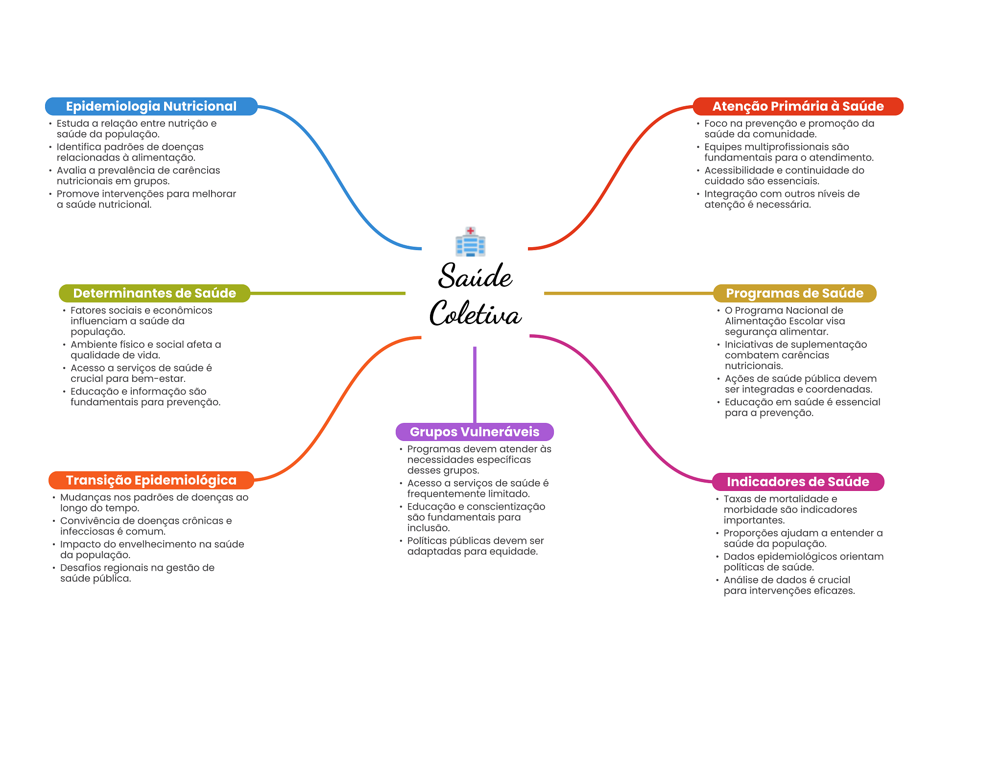 Epidemiologia Nutricional Atenção Primária à Saúde Estuda a relação entre nutrição e Foco na prevenção e promoção da saúde da população. saúde da comunidade. Identifica padrões de doenças Equipes multiprofissionais são relacionadas à alimentação. fundamentais para atendimento. Avalia a prevalência de carências Acessibilidade e continuidade do nutricionais em grupos. cuidado são essenciais. Promove intervenções para melhorar Integração com outros níveis de a saúde nutricional. atenção é necessária. Saúde Determinantes de Saúde Programas de Saúde Fatores sociais e econômicos Coletiva Programa Nacional de influenciam a saúde da Alimentação Escolar visa população. segurança alimentar. Ambiente físico e social afeta a Iniciativas de suplementação qualidade de vida. combatem carências Acesso a serviços de saúde é nutricionais. crucial para bem-estar. Ações de saúde pública devem Educação e informação são ser integradas e coordenadas. fundamentais para prevenção. Educação em saúde é essencial para a prevenção. Grupos Vulneráveis Programas devem atender às necessidades específicas desses grupos. Transição Epidemiológica Acesso a serviços de saúde é Indicadores de Saúde Mudanças nos padrões de doenças ao frequentemente limitado. Taxas de mortalidade e longo do tempo. Educação e conscientização morbidade são indicadores Convivência de doenças crônicas e são fundamentais para importantes. infecciosas é comum. inclusão. Proporções ajudam a entender a Impacto do envelhecimento na saúde Políticas públicas devem ser saúde da população. da população. adaptadas para equidade. Dados epidemiológicos orientam Desafios regionais na gestão de políticas de saúde. saúde pública. Análise de dados é crucial para intervenções eficazes.