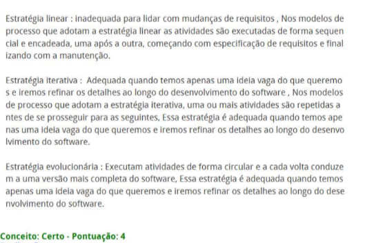 Estratégia linear : inadequada para lidar com mudanças de requisitos, Nos modelos de processo que adotam a estratégia linear as atividades são executadas de forma sequen e encadeada, uma após a outra, começando com especificação de requisitos e final izando com a manutenção. Estratégia : Adequada quando temos apenas uma vaga do que queremo e iremos refinar detalhes ao longo do desenvolvimento do software Nos modelos de processo que adotam a estratégia iterativa, uma ou mais atividades são repetidas a ntes de se prosseguir para as seguintes, Essa estratégia é adequada quando temos ape nas uma ideia vaga do que queremos e iremos refinar os detalhes ao longo do desenvo Ivimento do software. Estratégia evolucionária : Executam atividades de forma circular e a cada volta conduze m a uma versão mais completa do software, Essa estratégia é quando temos apenas uma vaga do que queremos e iremos refinar os detalhes ao longo do dese nvolvimento do software. Conceito: Certo Pontuação: 4