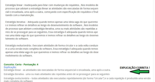 Estratégia linear inadequada para lidar com mudanças de requisitos Nos modelos de processo que adotam a estratégia linear as atividades são executadas de forma sequen cial e encadeada, uma após a outra, começando com especificação de requisitos e final izando com a manutenção. Estratégia iterativa Adequada quando temos apenas uma vaga do que queremo $ e refinar ao longo do desenvolvimento do software Nos modelos de processo que adotam a estratégia iterativa, uma ou mais atividades são repetidas a de se prosseguir para as seguintes, Essa estratégia é adequada quando temos ape nas uma vaga do que queremos e iremos refinar detalhes ao longo do desenvo do software. Estratégia : Executam atividades de forma circular e a cada volta conduze m a uma versão mais completa do software, Essa adequada quando temos apenas uma vaga do que queremos e iremos refinar detalhes ao longo do dese do software. Conceito: Certo Pontuação: 4 Explicação: EXPLICAÇÃO CORRETA I Estratégia linear as atividades são executadas de forma sequencial e encadeada, uma a outra. Estratégia Iterativa uma ou mais atividades são repetidas antes de se prosseguir para as seguintes Estratégia todas atividades são executadas repetidamente (de forma "circular") e a cada repetição é produzida uma versão mais completa do software