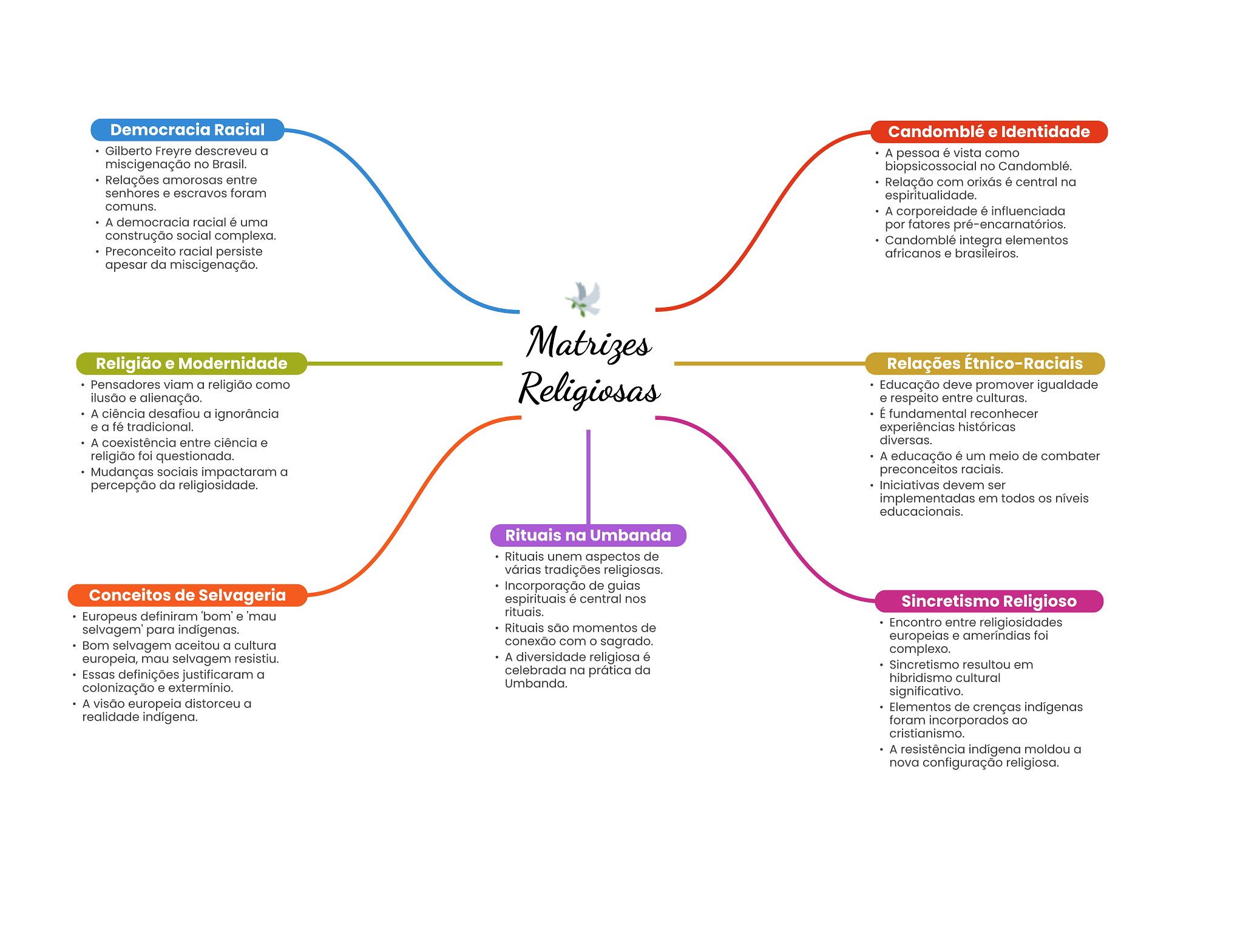 Democracia Racial Candomblé e Identidade Gilberto Freyre descreveu a A pessoa é vista como miscigenação no Brasil. biopsicossocial no Candomblé. Relações amorosas entre Relação com orixás é central na senhores e escravos foram espiritualidade. comuns. A corporeidade é influenciada A democracia racial é uma por fatores pré-encarnatórios. construção social complexa. Candomblé integra elementos Preconceito racial persiste africanos e brasileiros. apesar da miscigenação. Matrizes Religião e Modernidade Relações Étnico-Raciais Pensadores viam a religião como Religiosas Educação deve promover igualdade ilusão e alienação. e respeito entre culturas. A ciência desafiou a ignorância É fundamental reconhecer e a fé tradicional. experiências históricas A coexistência entre ciência e diversas. religião foi questionada. A educação é um meio de combater Mudanças sociais impactaram a preconceitos raciais. percepção da religiosidade. Iniciativas devem ser implementadas em todos níveis educacionais. Rituais na Umbanda Rituais unem aspectos de várias tradições religiosas. Incorporação de guias Conceitos de Selvageria espirituais é central nos Sincretismo Religioso Europeus definiram 'bom' e 'mau rituais. selvagem para indígenas. Rituais são momentos de Encontro entre religiosidades Bom selvagem aceitou a cultura conexão com O sagrado. europeias e ameríndias foi complexo. europeia, mau selvagem resistiu. A diversidade religiosa é Sincretismo resultou em Essas definições justificaram a celebrada na prática da Umbanda. hibridismo cultural colonização e extermínio. significativo. A visão europeia distorceu a Elementos de crenças indígenas realidade indígena. foram incorporados ao cristianismo. A resistência indígena moldou a nova configuração religiosa.