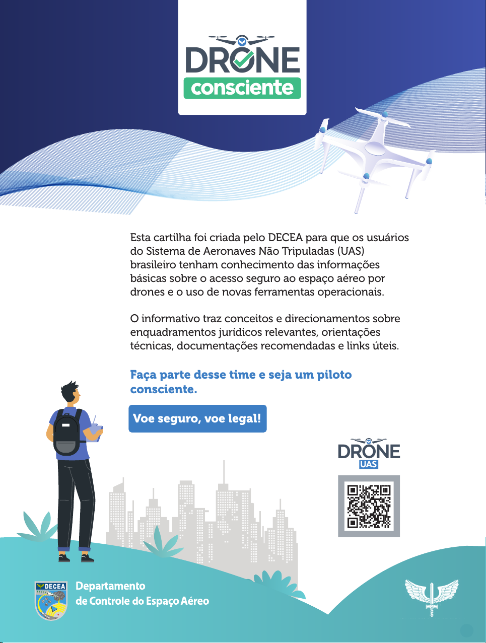 Esta cartilha foi criada pelo DECEA para que os usuários do Sistema de Aeronaves Não Tripuladas (UAS) brasileiro tenham conhecimento das informações básicas sobre o acesso seguro ao espaço aéreo por drones e o uso de novas ferramentas operacionais. O informativo traz conceitos e direcionamentos sobre enquadramentos jurídicos relevantes, orientações técnicas, documentações recomendadas e links úteis. Faça parte desse time e seja um piloto consciente. Voe seguro, voe legal! DRONE DRONE UAS Sistema desenvolvido pelo DECEA para solicitação de acesso ao Espaço Aéreo Brasileiro por Aeronaves Não Tripuladas. Serviço de Atendimento ao Cidadão. Lei nº 7.565/86 (Código Brasileiro de Aeronáutica) Art. 13 - Poderá a autoridade aeronáutica deter a aeronave em voo no espaço aéreo ou em pouso no território brasileiro, quando, em caso de flagrante desrespeito às normas de direito aeronáutico, de tráfego aéreo, ou às condições estabelecidas nas respectivas autorizações, coloque em risco a segurança da navegação aérea ou de tráfego aéreo, a ordem pública, a paz interna ou externa. Art. 20 - Salvo permissão especial, nenhuma aeronave poderá voar no espaço aéreo brasileiro, aterrissar no território subjacente ou dele decolar, a não ser que tenha: I - marcas de nacionalidade e matrícula e esteja munida dos respectivos certificados de matrícula e aeronavegabilidade. Art. 106 - Considera-se aeronave todo aparelho manobrável em voo, que possa sustentar-se e circular no espaço aéreo, mediante reações aerodinâmicas, apto a transportar pessoas ou coisas. Art. 268 - O explorador responde pelos danos a terceiros na superfície, causados, diretamente, por aeronave em voo, ou manobra, assim como por pessoa ou coisa dela caída ou projetada. Art. 289 - Na infração aos preceitos deste Código ou da legislação complementar, a autoridade aeronáutica poderá tomar as seguintes providências administrativas: I - multa; II - suspensão de certificados, de licenças ou de autorizações; III - cassação de certificados, de licenças ou de autorizações; e IV - detenção, interdição ou apreensão de aeronave, ou do material transportado. Art. 290 - A autoridade aeronáutica poderá requisitar o auxílio da força policial para obter a detenção dos presumidos infratores ou da aeronave que ponha em perigo a segurança pública, pessoas ou coisas, nos limites do que dispõe este Código. Além desse rol exemplificativo de enquadramentos, é de suma importância observar o preconizado pelo Art. 302 do Código Brasileiro de Aeronáutica que, para efeitos de subsídios às sanções administrativas, lista algumas possibilidades de Infrações de Tráfego Aéreo. Decreto-Lei 3.688/41 (Lei das Contravenções Penais) Art. 35 - Entregar-se na prática da aviação, a acrobacias ou a voos baixos, fora da zona em que a lei o permite, ou fazer descer a aeronave fora dos lugares destinados a esse fim. Decreto-Lei 2.848/40 (Código Penal) Art. 132 - Expor a vida ou a saúde de outrem a perigo direto e iminente. Art. 129 - Ofender a integridade corporal ou a saúde de outrem. Art. 261 - Expor a perigo embarcação ou aeronave, própria ou alheia, ou praticar qualquer ato tendente a impedir ou dificultar navegação marítima, fluvial ou aérea. Lei 10.406/02 (Código Civil) Art. 186 - Aquele que, por ação ou omissão voluntária, negligência ou imprudência, violar direito e causar dano a outrem, ainda que exclusivamente moral, comete ato ilícito. Constituição Federal/88 Art. 5º, inciso X - são invioláveis a intimidade, a vida privada, a honra e a imagem das pessoas, assegurado o direito a indenização pelo dano material ou moral decorrente de sua violação. ENQUADRAMENTOS JURÍDICOS RELEVANTES DOCUMENTAÇÃO Documentos obrigatórios para a operação: Selo da Anatel ou Declaração/Certificação de Conformidade Certidão de Cadastro, Certificado de Aeronavegabilidade ou Autorização Especial Autorização de Voo emitida pelo SARPAS Manual da Aeronave Avaliação de Risco Operacional para voos não recreativos Seguro Aeronáutico (RETA) para voos não recreativos * Outras exigências documentais poderão ser impostas pelos entes que regulam o setor. MEDIDAS PARA CASOS DE AVISTAMENTOS Em caso de avistamento de drones sobrevoando áreas sensíveis, de segurança, nas proximi- dades de aeródromos ou sob suspeita de prática irregular, recomenda-se que o caso seja levado à autoridade policial para que sejam apurados os indícios de autoria e materialidade. Esses dados servirão para que o DECEA inicie os procedimentos previstos para os casos de Infração de Tráfego Aéreo e a Junta de Julgamento da Aeronáutica (JJAER) proceda com os trâmites relativos às sanções administrativas cabíveis. INFORMAÇÕES ADICIONAIS: Operações VLOS (Visual Line-Of-Sight) com drones que possuem peso máximo de decola- gem de até 250 g, que sejam realizadas fora de zona de restrição de voo e até 200 ft (apro- ximadamente 60 metros), estão dispensadas de solicitação no SARPAS. Contudo, devem seguir as regras e procedimentos previstos em legislação, bem como os requisitos postos por outras agências e órgãos pertinentes. As operações no entorno de estrutura, que não cumprem as condicionantes de distanciamento de aeródromos, conforme a Instrução do Comando da Aeronáutica (ICA) 100-40, devem ser solicitadas com o mínimo de 4 dias de antecedência. Os voos próximos a sítios aeroportuários (aeródromos e helipontos) devem obter a autorização de voo por meio do Termo de Coordenação junto aos seus administradores. Análise de Impacto sobre a Segurança Operacional (AISO), Registro Preliminar de Segurança Operacional (RAPSO) e Acordo Operacional (AOp), além de outras condicionantes impostas pelo Órgão Regional, são os documentos que devem ser anexados à solicitação. O não cumprimento dessa recomendação poderá acarretar a não aprovação do voo