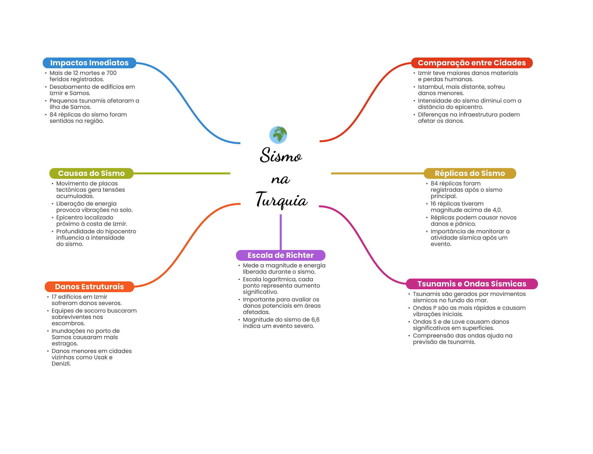 Impactos Imediatos Comparação entre Cidades Mais de 12 mortes e 700 Izmir teve maiores danos materiais feridos registrados. e perdas humanas. Desabamento de edifícios em Istambul, mais distante, sofreu Izmir e Samos. danos menores. Pequenos tsunamis afetaram a Intensidade do sismo diminui com a ilha de Samos. distância do epicentro. 84 réplicas do sismo foram Diferenças na infraestrutura podem sentidas na região. afetar danos. Sismo Causas do Sismo Réplicas do Sismo Movimento de placas na 84 réplicas foram tectônicas gera tensões registradas após sismo acumuladas. Liberação de energia Turquia principal. 16 réplicas tiveram provoca vibrações no solo. magnitude acima de 4,0. Epicentro localizado Réplicas podem causar novos próximo à costa de Izmir. danos e pânico. Profundidade do hipocentro Importância de monitorar a influencia a intensidade atividade sísmica após um do sismo. evento. Escala de Richter Mede a magnitude e energia liberada durante sismo. Escala logarítmica, cada Danos Estruturais ponto representa aumento Tsunamis e Ondas Sísmicas significativo. 17 edifícios em Izmir Tsunamis são gerados por movimentos sofreram danos severos. Importante para avaliar OS sísmicos no fundo do mar. danos potenciais em áreas Equipes de socorro buscaram Ondas P são as mais rápidas e causam afetadas. sobreviventes nos vibrações iniciais. Magnitude do sismo de 6,6 escombros. Ondas S e de Love causam danos indica um evento severo. Inundações no porto de significativos em superfícies. Samos causaram mais Compreensão das ondas ajuda na estragos. previsão de tsunamis. Danos menores em cidades vizinhas como Usak e Denizli.