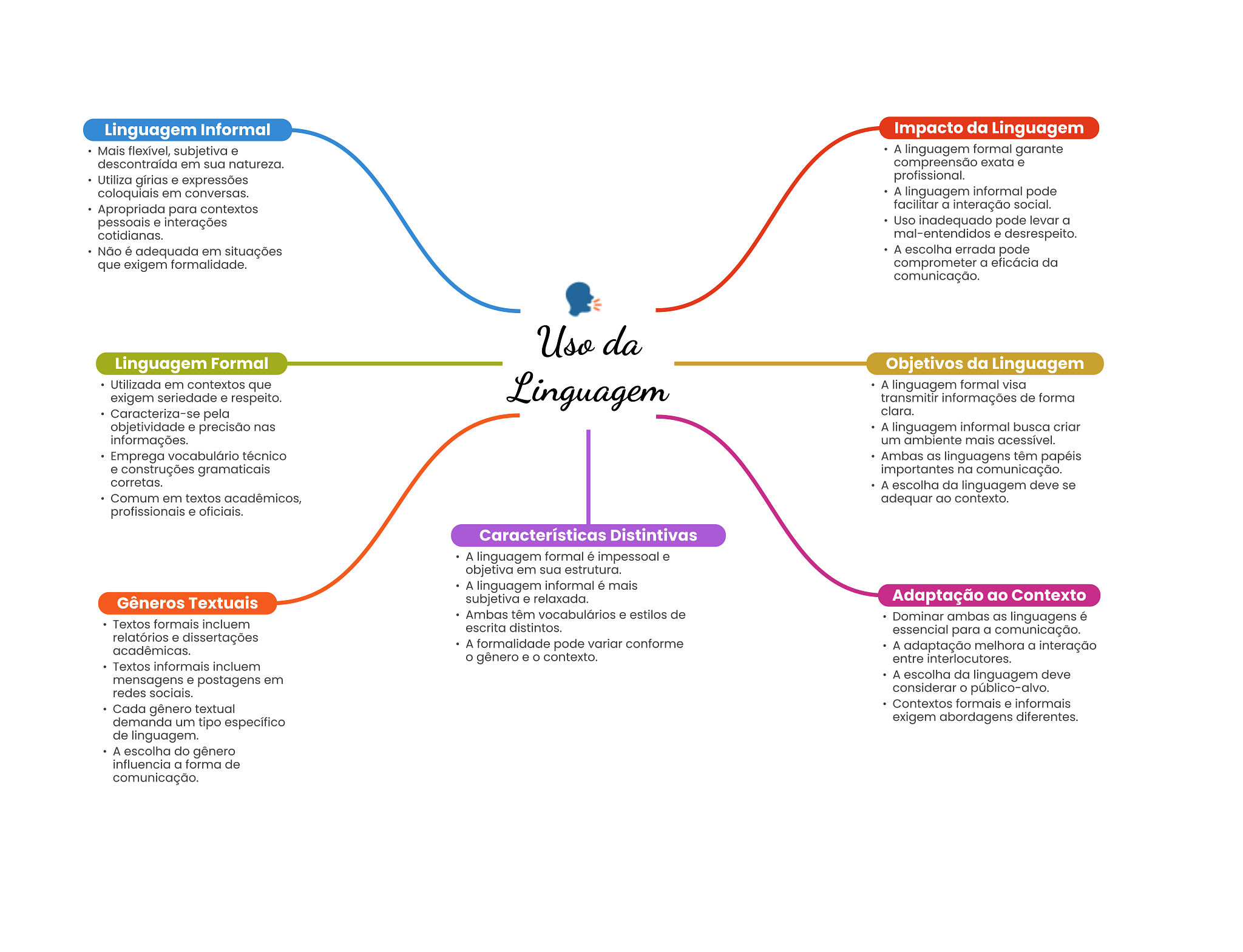 Linguagem Informal Impacto da Linguagem Mais flexível, subjetiva e A linguagem formal garante descontraída em sua natureza. compreensão exata e Utiliza gírias e expressões profissional. coloquiais em conversas. A linguagem informal pode Apropriada para contextos facilitar a interação social. pessoais e interações Uso inadequado pode levar a cotidianas. mal-entendidos e desrespeito. Não é adequada em situações A escolha errada pode que exigem formalidade. comprometer a eficácia da comunicação. Uso da Linguagem Formal Objetivos da Linguagem Utilizada em contextos que exigem seriedade e respeito. Linguagem A linguagem formal visa transmitir informações de forma Caracteriza-se pela clara. objetividade e precisão nas A linguagem informal busca criar informações. um ambiente mais acessível. Emprega vocabulário técnico Ambas as linguagens têm papéis e construções gramaticais importantes na comunicação. corretas. A escolha da linguagem deve se Comum em textos acadêmicos, adequar ao contexto. profissionais e oficiais. Características Distintivas A linguagem formal é impessoal e objetiva em sua estrutura. A linguagem informal é mais Gêneros Textuais subjetiva e relaxada. Adaptação ao Contexto Ambas têm vocabulários e estilos de Dominar ambas as linguagens é Textos formais incluem escrita distintos. essencial para a comunicação. relatórios e dissertações acadêmicas. A formalidade pode variar conforme A adaptação melhora a interação gênero e O contexto. entre interlocutores. Textos informais incluem mensagens e postagens em A escolha da linguagem deve redes sociais. considerar público-alvo. Contextos formais e informais Cada gênero textual demanda um tipo específico exigem abordagens diferentes. de linguagem. A escolha do gênero influencia a forma de comunicação.