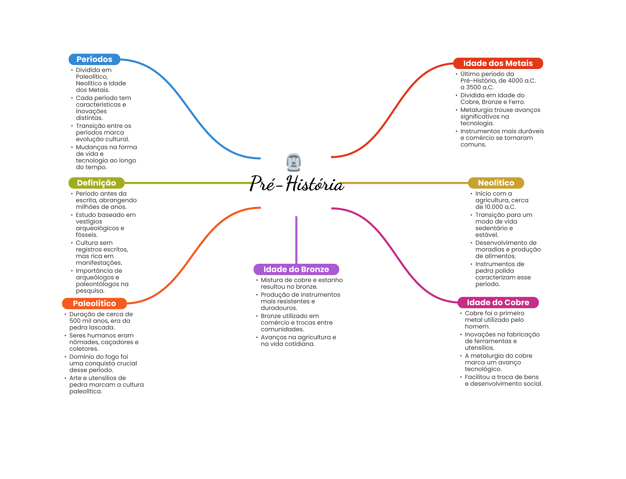 Períodos Idade dos Metais Dividida em Paleolítico, Último período da Neolítico e Idade Pré-História, de 4000 a.C. dos Metais. a 3500 a.C. Dividida em Idade do Cada período tem características e Cobre, Bronze e Ferro. inovações Metalurgia trouxe avanços distintas. significativos na Transição entre tecnologia. períodos marca Instrumentos mais duráveis evolução cultural. e comércio se tornaram Mudanças na forma comuns. de vida e tecnologia ao longo do tempo. Definição Pré- História Neolítico Período antes da Início com a escrita, abrangendo agricultura, cerca milhões de anos. de 10.000 a.C. Estudo baseado em Transição para um modo de vida arqueológicos e sedentário e fósseis. estável. Cultura sem Desenvolvimento de registros escritos, moradias e produção mas rica em de alimentos. manifestações. Instrumentos de Importância de Idade do Bronze pedra polida e Mistura de cobre e estanho caracterizam esse paleontólogos na resultou no bronze. período. pesquisa. Produção de instrumentos Paleolítico mais resistentes e Idade do Cobre duradouros. Duração de cerca de Bronze utilizado em Cobre foi O primeiro 500 mil anos, era da comércio e trocas entre metal utilizado pelo pedra lascada. comunidades. homem. Seres humanos eram Avanços na agricultura e Inovações na fabricação nômades, caçadores e na vida cotidiana. de ferramentas e coletores. utensílios. Domínio do fogo foi A metalurgia do cobre uma conquista crucial marca um avanço desse período. tecnológico. Arte e utensílios de Facilitou a troca de bens pedra marcam a cultura e desenvolvimento social. paleolítica.