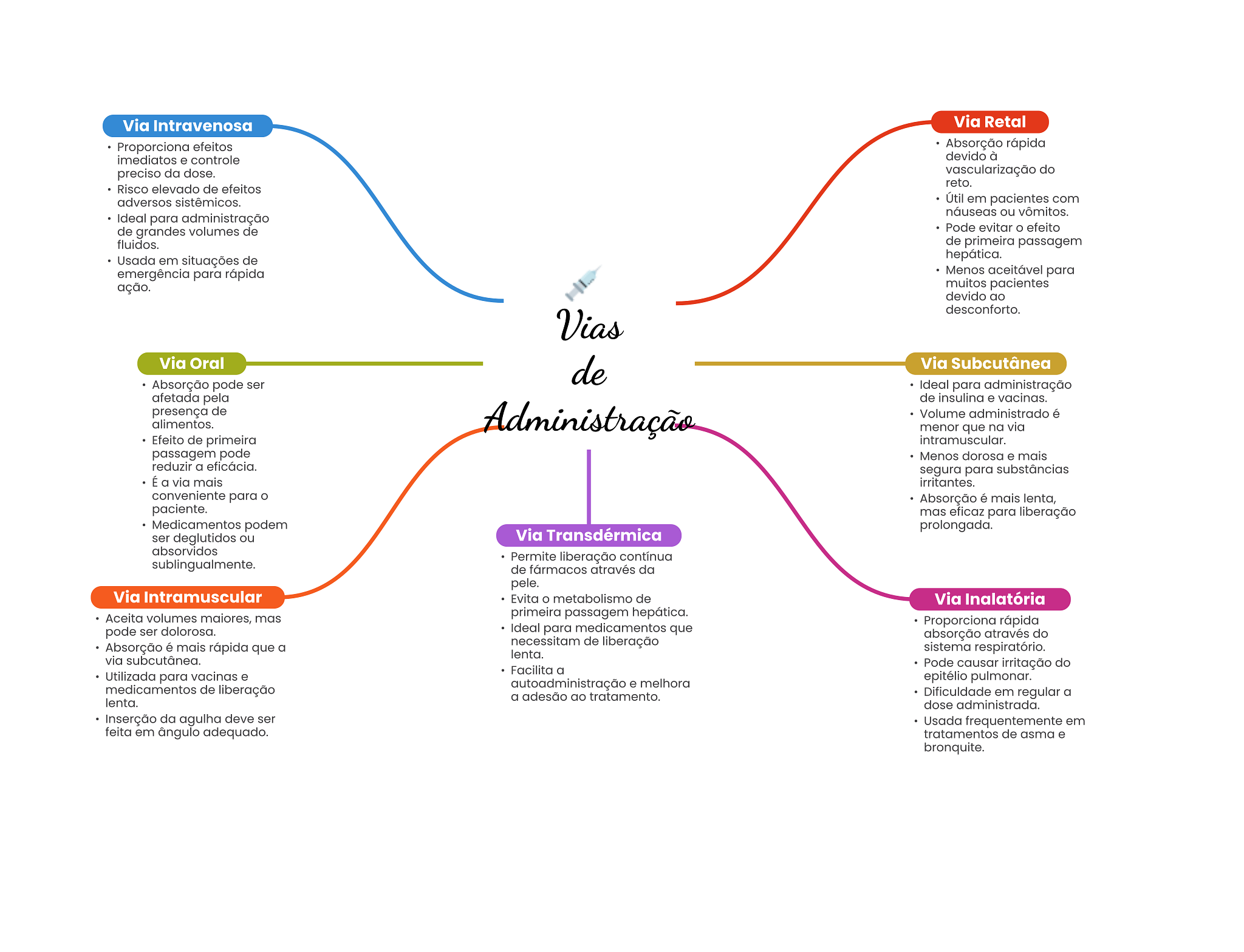 Via Intravenosa Via Retal Proporciona efeitos Absorção rápida imediatos e controle devido à preciso da dose. vascularização do reto. Risco elevado de efeitos adversos sistêmicos. Útil em pacientes com náuseas ou vômitos. Ideal para administração de grandes volumes de Pode evitar efeito fluidos. de primeira passagem Usada em situações de hepática. emergência para rápida Menos aceitável para ação. muitos pacientes devido ao desconforto. Vias Via Oral de Via Subcutânea Absorção pode ser Ideal para administração afetada pela de insulina e vacinas. presença de alimentos. Administração Volume administrado é menor que na via Efeito de primeira intramuscular. passagem pode Menos dorosa e mais reduzir a eficácia. segura para substâncias É a via mais irritantes. conveniente para Absorção é mais lenta, paciente. mas eficaz para liberação Medicamentos podem prolongada. ser deglutidos ou Via Transdérmica absorvidos Permite liberação contínua sublingualmente. de fármacos através da pele. Via Intramuscular Evita metabolismo de Via Inalatória Aceita volumes maiores, mas primeira passagem hepática. Proporciona rápida pode ser dolorosa. Ideal para medicamentos que absorção através do Absorção é mais rápida que a necessitam de liberação lenta. sistema respiratório. via subcutânea. Facilita a Pode causar irritação do Utilizada para vacinas e epitélio pulmonar. medicamentos de liberação autoadministração e melhora a adesão ao tratamento. Dificuldade em regular a lenta. dose administrada. Inserção da agulha deve ser Usada frequentemente em feita em ângulo adequado. tratamentos de asma e bronquite.