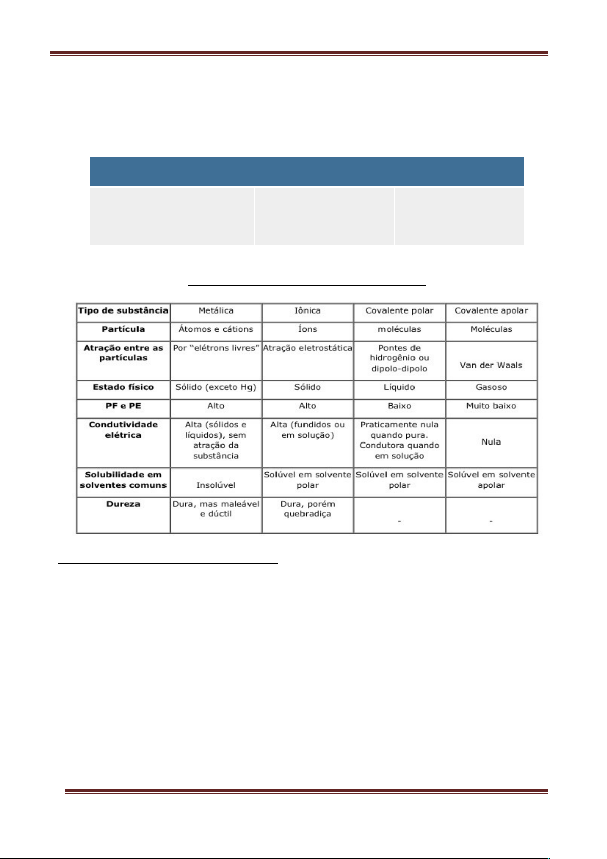 Ligações químicas As diferentes substâncias que existem no universo são compostas de átomos, íons ou moléculas. Os elementos químicos se combinam por meio de ligações químicas, para atingir a Regra do octeto. Essas ligações podem ser: · Ligações interatômicas (intramolecular): ocorre entre átomos, mantendo-os unidos. Ligação covalente Ligação iônica Ligação metálica Compartilhamento de elétrons (compostos moleculares) Transferência de elétrons (compostos iônicos) Entre átomos de metais (ligas metálicas) Ex: CO2 NaCl Fe Propriedades das ligações interatômicas · Ligações ou Forças Intermoleculares: Quando duas moléculas se aproximam há uma interação de seus campos magnéticos o que faz surgir uma força entre elas. É o que chamamos de força intermolecular. Essas forças variam de intensidade, dependendo do tipo da molécula (polar ou apolar) e, no caso das polares, de quão polares elas são. · Ligações entre Molécula apolar x molécula apolar: O movimento dos elétrons permite que, em determinado momento, moléculas apolares consigam induzir um dipolo em sua molécula vizinha e esta, uma vez polarizada, dê sequência ao efeito. Essas forças foram percebidas pelo físico polonês Fritz London, que sugeriu que moléculas apolares poderiam se tornar dipolos temporários. Essas forças ficaram conhecidas como forças de dispersão ou forças de London. Ex: CO2 Assim, as moléculas que eram apolares passam a ter um dipolo que foi induzido. · Ligação entre molécula polar e molécula polar: Ocorre entre moléculas polares da mesma substância ou de substâncias diferentes, ambas polares. Como as moléculas são polares (apresentam polos positivo e negativo), elas interagem de forma que o polo negativo de uma una-se ao polo positivo da outra e assim sucessivamente. Esta força é muito conhecida como dipolo x dipolo ou dipolo-permanente. Ex: HCl · Ligações de hidrogênio: Quando ligado a um átomo pequeno e de forte eletronegatividade (F, O ou N), o hidrogênio forma ligações polares muito fortes. Seus pólos interagirão fortemente com outras moléculas polares, formando uma forte rede de ligações intermoleculares. Ex: NH3 Exercícios 1. (FGV-SP) O conhecimento das estruturas das moléculas é um assunto bastante relevante, já que as formas das moléculas determinam propriedades das substâncias como odor, sabor, coloração e solubilidade. As figuras apresentam as estruturas das moléculas de CO2, H2O, NH3, CH4, H2S e PH3. Estruturas de moléculas em exercícios sobre interações intermoleculares Quanto às forças intermoleculares, a molécula que forma ligações de hidrogênio (pontes de hidrogênio) com a água é: a) H2S. b) CH4. c) NH3. d) PH3. e) CO2. 2. (Fameca–SP) Os compostos HF, NH3 e H2O apresentam elevados pontos de fusão e de ebulição quando comparados a H2S e HCl, por exemplo, devido: a) às forças de van der Waals; b) às forças de London; c) às ligações de hidrogênio; d) às interações eletrostáticas; e) às ligações iônicas. 3. Considere as seguintes substâncias: Cl2(g), CS2(l), NH3(g), HBr(l), H2S(g). Marque a alternativa que contém a(s) que apresenta(m) boa solubilidade em água: a) Cl2(g) d) Br2(l) e HBr b) CS2(l) e) NH3(g) e H2S(g) c) NH3(g) e Br2(l) 4. Marque a alternativa que apresenta a sequência correta do tipo de força intermolecular que une as moléculas destas substâncias: H2O, PCl3, HF e F2: a) dipolo dipolo, dipolo dipolo, ligação de hidrogênio e dipolo induzido-dipolo induzido. b) dipolo instantâneo-dipolo induzido, dipolo dipolo, ligação de hidrogênio, dipolo dipolo. c) dipolo dipolo, ligação de hidrogênio, ligação de hidrogênio e dipolo dipolo d) forças de London, dipolo dipolo, ligação de hidrogênio e dipolo induzido-dipolo induzido. 5. (UEMG) As propriedades exibidas por um certo material podem ser explicadas pelo tipo de ligação química presente entre suas unidades formadoras. Em uma análise laboratorial, um químico identificou para um certo material as seguintes propriedades: · Alta temperatura de fusão e ebulição · Boa condutividade elétrica em solução aquosa · Mau condutor de eletricidade no estado sólido A partir das propriedades exibidas por esse material, assinale a alternativa que indica o tipo de ligação predominante no mesmo: a) Metálica b) covalente c) dipolo induzido d) iônica 6. (PUC-SP) Analise as propriedades físicas na tabela abaixo: Amostra Ponto de fusão Ponto de ebulição Condutividade elétrica a 25 ºC Condutividade elétrica a 1000 ºC A 801 ºC 1413 ºC isolante condutor B 43 ºC 182 ºC isolante ------------- C 1535 ºC 2760 ºC condutor condutor D 1248 ºC 2250 ºC isolante isolante Segundo os modelos de ligação química, A, B, C e D podem ser classificados, respectivamente, como: a) composto iônico, metal, substância molecular, metal. b) metal, composto iônico, composto iônico, substância molecular. c) composto iônico, substância molecular, metal, metal. d) substância molecular, composto iônico, composto iônico, metal. e) composto iônico, substância molecular, metal, composto iônico. 7. (Fuvest-1999) Em um laboratório, três frascos com líquidos incolores estão sem os devidos rótulos. Ao lado deles, estão os três rótulos com as seguintes identificações: ácido etanóico, pentano e 1-butanol. Para poder rotular corretamente os frascos, determina-se, para esses líquidos, o ponto de ebulição (P.E.) sob 1atm e a solubilidade em água (S) a 25 °C. Com base nessas propriedades, conclui-se que os líquidos X, Y e Z são, respectivamente: a) pentano, 1-butanol e ácido etanóico. b) pentano, ácido etanóico e 1-butanol. c) ácido etanóico, pentano e 1-butanol. d) 1-butanol , ácido etanóico e pentano. e) 1-butanol, pentano e ácido etanóico. 8. (Fuvest-2002) Alguns alimentos são enriquecidos pela adição de vitaminas, que podem ser solúveis em gordura ou em água. As vitaminas solúv
