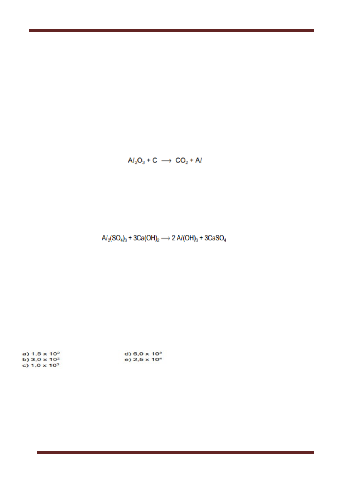 Cálculos estequiométricos 1. (Fuvest) Nas CNTP, o volume ocupado por 10 g de monóxido de carbono (CO) é: (Massas molares: C = 12 g/mol e O = 16 g/mol; Volume molar dos gases nas CNTP = 22,4 L/mol). a) 6,0 L. b) 8,0 L. c) 9,0 L. d) 10 L. e) 12 L. 2. (Fuvest) O minério usado na fabricação de ferro em algumas siderúrgicas brasileiras contém cerca de 80% de óxido de ferro (III). Quantas toneladas de ferro podem ser obtidas pela redução de 20 toneladas desse minério? (massas atômicas: Fe = 56 u; O = 16 u). Fe2O3 + 3 CO → 2 Fe + 3 CO2 3. (Fuvest 91) O alumínio é obtido pela eletrólise da bauxita. Nessa eletrólise, ocorre a formação de oxigênio que reage com um dos eletrodos de carbono utilizados no processo. A equação não balanceada que representa o processo global é: Para dois mols de Al2O3, quantos mols de CO2 e de Al, respectivamente, são produzidos esse processo? a) 3 e 2 b) 1 e 4 c) 2 e 3 d) 2 e 1 e) 3 e 4. 4. (Fuvest 93) Nas estações de tratamento de água, eliminam-se as impurezas sólidas em suspensão através do arraste por flóculos de hidróxido de alumínio, produzidos na reação representada por: Para tratar 1,0x106m3 de água foram adicionadas 17 ton de Al2(SO4)3. Qual a massa de Ca(OH)2‚ necessária para reagir completamente com esse sal? Dados: massas molares Al2(SO4)3= 342 g/mol, Ca(OH)2= 74 g/mol. a) 150 kg. b) 300 kg. c) 1,0 ton. d) 11 ton. e) 30 ton. 5. (Fuvest 94) Uma das maneiras de impedir que o SO2, um dos responsáveis pela "chuva ácida", seja liberado para a atmosfera é tratá-lo previamente com óxido de magnésio, em presença de ar, como equacionado a seguir: Dados: massas molares em g/mol MgO = 40 e SO2 = 64 Quantas toneladas de óxido de magnésio são consumidas no tratamento de 9,6x103 toneladas de SO2? 6. (Fuvest 95) A oxidação da amônia (NH3) com oxigênio, a alta temperatura e na presença de catalisador, é completa, produzindo óxido nítrico (NO) e vapor d'água. Partindo de amônia e oxigênio, em proporção estequiométrica, qual a porcentagem (em volume) de NO na mistura gasosa final? a) 10 %. b) 20 %. c) 30 %. d) 40 %. e) 50 %. 7. (Fuvest 96) Um composto submetido à decomposição produziu hidrogênio (H‚) e silício (Si) na proporção, respectivamente, de 3,0g para 28,0g. No composto original, quantos átomos de H estão combinados com um átomo de silício? Massas molares: H2 = 2,0 g/mol, Si = 28,0 g/mol. a) 1 b) 2 c) 3 d) 4 e) 6 8. (Fuvest 97) Em um acidente, um caminhão carregado de solução aquosa de ácido fosfórico tombou derramando cerca de 24,5 toneladas dessa solução no asfalto. Quantas toneladas de óxido de cálcio seriam necessárias para reagir totalmente com essa quantidade de ácido? Porcentagem em massa do H3PO4 na solução = 80% Massas molares (g/mol): H3PO4 = 98 CaO = 56 a) 7,5 b) 11,2 c) 16,8 d) 21,0 e) 22,9 9. (Fuvest 99) Uma instalação petrolífera produz 12,8kg de SO2 por hora. A liberação desse gás poluente pode ser evitada usando-se calcário, o qual por decomposição fornece cal, que reage com o SO2 formando CaSO3, de acordo com as equações: Qual a massa mínima de calcário (em kg), por dia, necessária para eliminar todo SO2 formado? Suponha 100% de rendimento para as reações. Massas molares (g/mol) CaCO3.....100 SO2..........64 a) 128 b) 240 c) 480 d) 720 e) 1200 10. (Fuvest 2000) Misturando-se soluções aquosas de nitrato de prata (AgNO3) e de cromato de potássio (K2CrO4), forma-se um precipitado de cromato de prata (Ag2CrO4), de cor vermelho-tijolo, em uma reação completa. A solução sobrenadante pode se apresentar incolor ou amarela, dependendo de o excesso ser do primeiro ou do segundo reagente. Na mistura de 20mL de solução 0,1 mol/L de AgNO3 com 10mL de solução 0,2 mol/L de K2CrO4, a quantidade em mol do sólido que se forma e a cor da solução sobrenadante, ao final da reação, são respectivamente: a) 1 × 10-3 e amarela. d) 1 × 10-3 e incolor. b) 1 e amarela. e) 2 × 10-3 e amarela. c) 2 × 10-3 e incolor. 11. (Fuvest 2001) Para se determinar o conteúdo de ácido acetilsalicílico (C9H8O4) num comprimido analgésico, isento de outras substâncias ácidas, 1,0g do comprimido foi dissolvido numa mistura de etanol e água. Essa solução consumiu 20mL de solução aquosa de NaOH, de concentração 0,10mol/L, para reação completa. Ocorreu a seguinte transformação química: Logo, a porcentagem em massa de ácido acetilsalicílico no comprimido é de, aproximadamente, dados: massa molar do C9H8O4= 180 g/mol. 12. (Fuvest 2002) Para determinar a composição de uma mistura sólida de carbonato de sódio e hidróxido de sódio, esta mistura foi tratada com ácido clorídrico de concentração 0,50mol/L. Gastaram-se 500mL dessa solução para obter, após ligeiro aquecimento, uma solução neutra. No processo, houve liberação de gás carbônico que, após secagem, apresentou o volume de 1,23L, medido à temperatura de 25°C e à pressão de 1,0 bar. Logo, as quantidades, em mols, de carbonato de sódio e hidróxido de sódio, na mistura sólida, eram, respectivamente: Dado: Volume molar do gás carbônico a 25°C e 1 bar: 24,6L/mol. a) 0,050 e 0,10 b) 0,050 e 0,15 c) 0,10 e 0,10 d) 0,10 e 0,20 e) 0,10 e 0,30 13. (Fuvest 2005) Uma solução aquosa de penicilina sofre degradação com o tempo, perdendo sua atividade antibiótica. Para determinar o prazo de validade dessa solução, sua capacidade antibiótica foi medida em unidades de penicilina G.* Os resultados das medidas, obtidos durante sete semanas, estão no gráfico. * Uma unidade de penicilina G corresponde a 0,6 g dessa substância. Supondo-se como aceitável uma atividade de 90% da inicial, o prazo de validade da solução seria de: a) 4 dias b) 10 dias c) 24 dias d) 35 dias e) 49 dias 14. (FUVEST) O equipamento de proteção conhecido como “air bag”, usado em automóveis, contém substâncias que se transformam, sob determinadas condições, liberando N2 que infla um recipiente de p