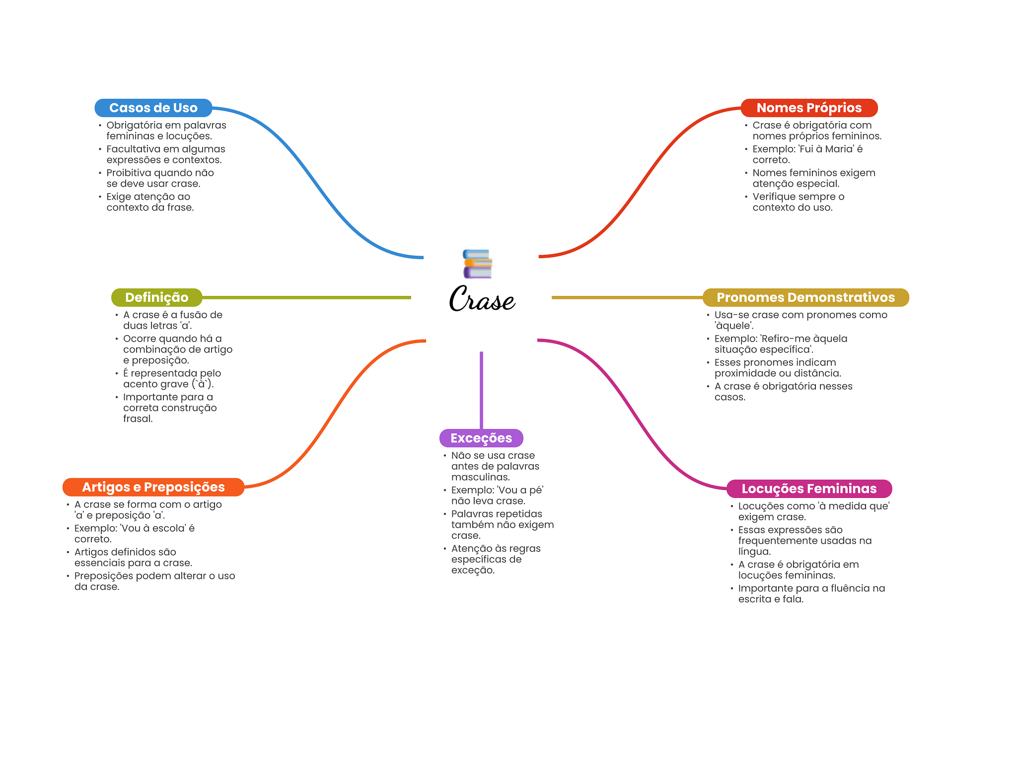 Casos de Uso Nomes Próprios Obrigatória em palavras Crase é obrigatória com femininas e locuções. nomes próprios femininos. Facultativa em algumas Exemplo: à Maria' é expressões e contextos. correto. Proibitiva quando não Nomes femininos exigem se deve usar crase. atenção especial. Exige atenção ao Verifique sempre contexto da frase. contexto do uso. Definição Crase Pronomes Demonstrativos A crase é a fusão de Usa-se crase com pronomes como duas letras 'a'. Ocorre quando há a Exemplo: àquela combinação de artigo situação específica'. e preposição. Esses pronomes indicam É representada pelo proximidade ou distância. acento grave A crase é obrigatória nesses Importante para a casos. correta construção frasal. Exceções Não se usa crase antes de palavras masculinas. Artigos e Preposições Exemplo: a pé' Locuções Femininas A crase se forma com artigo não leva crase. Locuções como 'à medida 'a'e preposição 'a'. Palavras repetidas exigem crase. Exemplo: 'Vou à escola' é também não exigem Essas expressões são correto. crase. frequentemente usadas na Artigos definidos são Atenção às regras língua. essenciais para a crase. específicas de Preposições podem alterar uso exceção. locuções femininas. da crase. Importante para a fluência na escrita e fala.