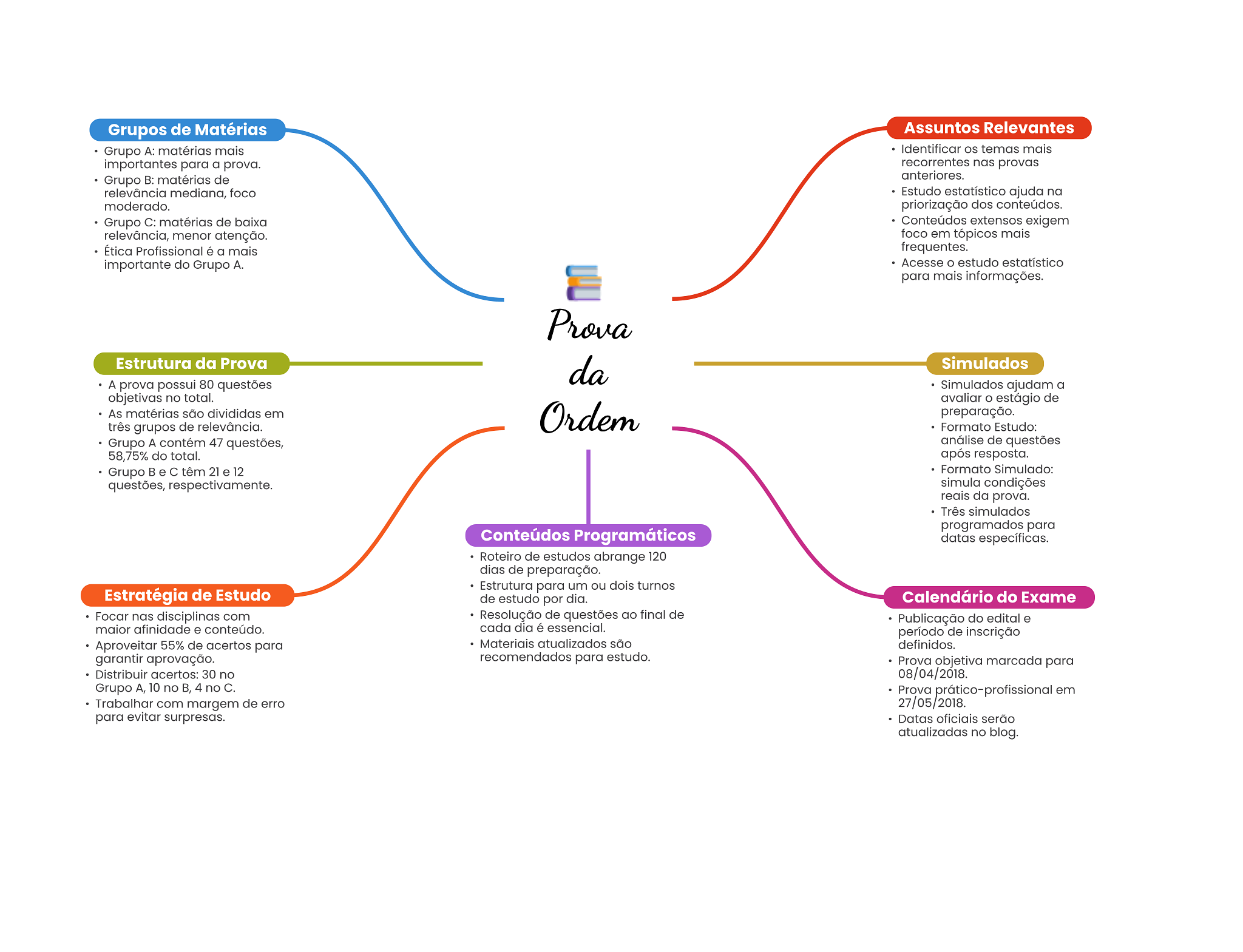 Grupos de Matérias Assuntos Relevantes Grupo A: matérias mais Identificar temas mais importantes para a prova. recorrentes nas provas Grupo B: matérias de anteriores. relevância mediana, foco Estudo estatístico ajuda na moderado. priorização dos conteúdos. Grupo C: matérias de baixa Conteúdos extensos exigem relevância, menor atenção. foco em tópicos mais Ética Profissional é a mais frequentes. importante do Grupo Acesse O estudo estatístico para mais informações. Prova Estrutura da Prova da Simulados A prova possui 80 questões Simulados ajudam a objetivas no total. avaliar estágio de As matérias são divididas em três grupos de relevância. Ordem preparação. Formato Estudo: Grupo A contém 47 questões, análise de questões 58,75% do total. após resposta. Grupo e têm 21 e 12 Formato Simulado: questões, respectivamente. simula condições reais da prova. Três simulados programados para Conteúdos Programáticos datas específicas. Roteiro de estudos abrange 120 dias de preparação. Estrutura para um ou dois turnos Estratégia de Estudo de estudo por dia. Calendário do Exame Focar nas disciplinas com Resolução de questões ao final de Publicação do edital e maior afinidade e conteúdo. cada dia é essencial. período de inscrição Aproveitar 55% de acertos para Materiais atualizados são definidos. garantir aprovação. recomendados para estudo. Prova objetiva marcada para Distribuir acertos: 30 no 08/04/2018. Grupo A, 10 no B, 4 no C. Prova prático-profissional em Trabalhar com margem de erro 27/05/2018. para evitar surpresas. Datas oficiais serão atualizadas no blog.