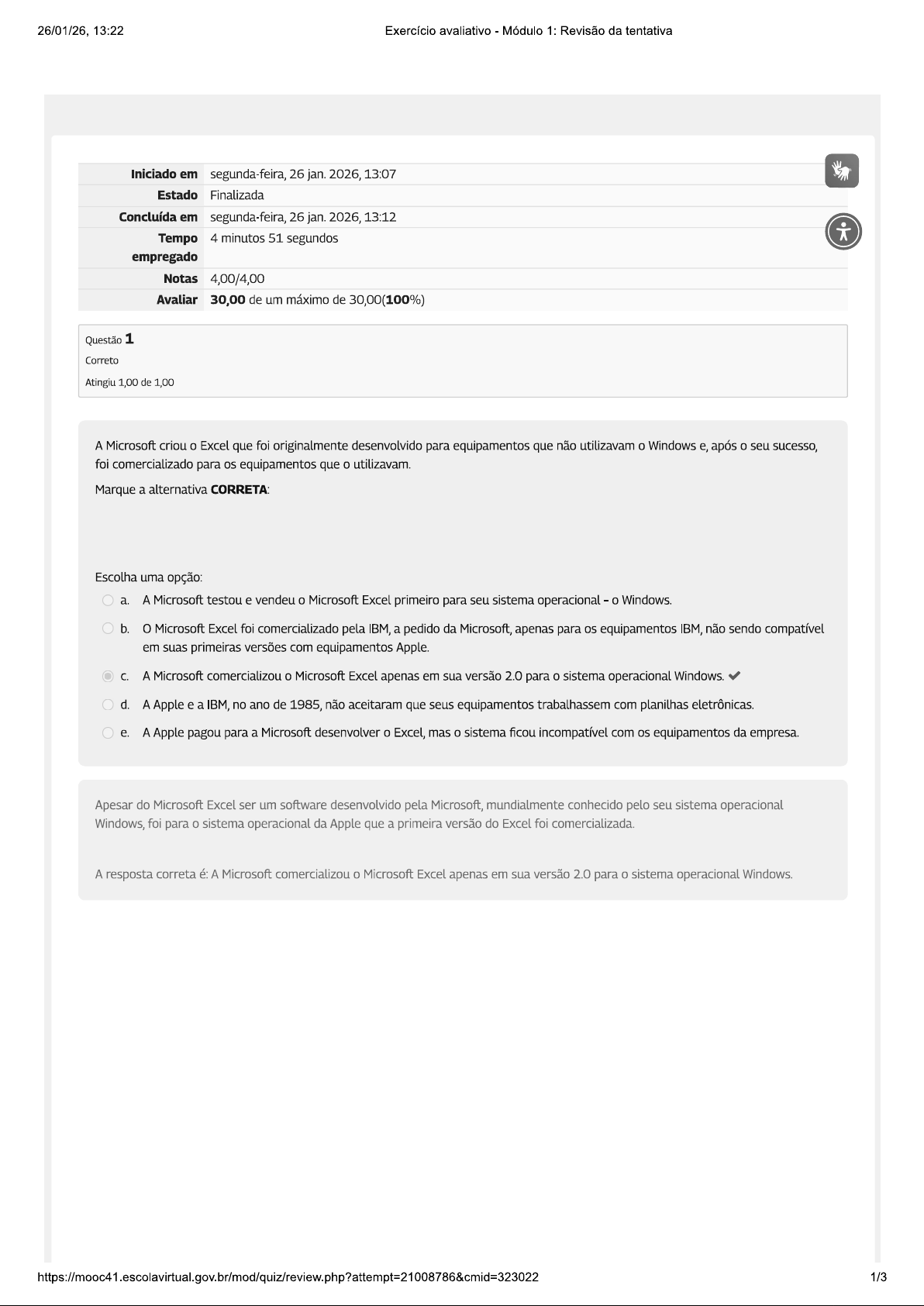 26/01/26, 13:22 Exercício avaliativo Módulo 1: Revisão da tentativa Iniciado em segunda-feira, 26 jan. 2026, 13:07 Estado Finalizada Concluída em segunda-feira, 26 jan. 2026, 13:12 Tempo 4 minutos 51 segundos empregado Notas 4,00/4,00 Avaliar 30,00 de um máximo de 30,00(100%) Questão 1 Correto Atingiu 1,00 de 1,00 A Microsoft criou 0 Excel que foi originalmente desenvolvido para equipamentos que não utilizavam 0 Windows e, após seu sucesso, foi comercializado para os equipamentos que utilizavam. Marque a alternativa CORRETA: Escolha uma opção: a. A Microsoft testou e vendeu 0 Microsoft Excel primeiro para seu sistema operacional 0 Windows. b. 0 Microsoft Excel foi comercializado pela IBM, a pedido da Microsoft, apenas para os equipamentos IBM, não sendo compatível em suas primeiras versões com equipamentos Apple. C. A Microsoft comercializou 0 Microsoft Excel apenas em sua versão 2.0 para 0 sistema operacional Windows. d. A Apple e a IBM, no ano de 1985, não aceitaram que seus equipamentos trabalhassem com planilhas eletrônicas. e. A Apple pagou para a Microsoft desenvolver 0 Excel, mas 0 sistema ficou incompatível com equipamentos da empresa. Apesar do Microsoft Excel ser um software desenvolvido pela Microsoft, mundialmente conhecido pelo seu sistema operacional Windows, foi para 0 sistema operacional da Apple que a primeira versão do Excel foi comercializada. A resposta correta é: A Microsoft comercializou 0 Microsoft Excel apenas em sua versão 2.0 para 0 sistema operacional Windows. 1/326/01/26, 13:22 Exercício avaliativo Módulo 1: Revisão da tentativa Questão 2 Correto Atingiu 1,00 de 1,00 IBGE precisa compilar dados do Censo que aplicará em 2022 e, para esse projeto, está em dúvida se compra a licença do Excel. Se você fosse técnico responsável por assessorar IBGE nesse quesito, você recomendaria a aquisição do Excel? Censo é responsável por construir uma base de dados robusta sobre os mais de 210 milhões de brasileiros. Marque a alternativa CORRETA: Escolha uma opção: a. Usaria Excel, pois ele é ótimo para trabalhar com esse tipo e volume de dados. b. Excel não é indicado para tratar volume imenso de dados que se originarão no censo. C. Não poderíamos usar esse sistema, pois é necessário conhecer bem a ferramenta, e Excel foi recentemente lançado no mercado. d. Usaria Excel, pois poderemos contratar estagiários que fizeram curso de introdução à informática para trabalhar no sistema. e. Não usaria Excel, apesar de ser uma ferramenta adequada para grandes volumes de dados, ele não contém fórmulas possíveis de utilização nesse objetivo. Apesar do Excel ser uma ferramenta adequada para tratar dados estatísticos, 0 volume de dados originados no Censo é um impeditivo para 0 sistema. Quando tratamos com grandes bases de dados, 0 melhor é usar outras ferramentas, como 0 SPSS, Sistema r, entre outras. A resposta correta é: 0 Excel não é indicado para tratar 0 volume imenso de dados que se originarão no censo. Questão 3 Correto Atingiu 1,00 de 1,00 Excel apresenta atalhos de navegação, em muitos casos, iguais aos do Microsoft Windows. Marque a resposta CORRETA: Escolha uma opção: a. Não há nenhum atalho igual entre Excel e 0 Windows. b. Visto que 0 Excel foi projetado para máquinas seus atalhos são com origem na Apple e nunca mais mudaram. C. Por ser um software da Microsoft, 0 Excel apresenta muita proximidade entre os atalhos do Microsoft Windows. d. Excel não apresenta atalhos de navegação, portanto não há semelhança com Windows. e. Excel é 0 único software da Microsoft que só apresenta atalhos para cálculos, portanto, não tem semelhança com demais comandos de atalho do Windows. Um usuário acostumado aos atalhos do Windows terá facilidade no uso do Excel, visto que muitos atalhos são mesmos. A resposta correta é: Por ser um software da Microsoft, 0 Excel apresenta muita proximidade entre os atalhos do Microsoft Windows. 2/326/01/26, 13:22 Exercício avaliativo Módulo 1: Revisão da tentativa Questão 4 Correto Atingiu 1,00 de 1,00 Excel apresenta diferentes possibilidades de colar especial, assim, podemos citar que: Marque a resposta CORRETA: Escolha uma opção: a. Dentre as opções de colar especial, a opção: apenas formatação pode ser utilizada para igualar a formatação da célula destino conforme era a formatação da célula origem. b. Não há como colar especial executando a operação de subtração. C. Há a opção de colar especial: apenas números pares. d. Não há como colar especial onde já há uma célula preenchida com caracteres de texto. e. colar especial só serve para colar a marca d'agua e bordas das células de origem. Apenas a opção "A" é verdadeira. As demais opções apresentam situações diferentes da ferramenta colar especial. A resposta correta é: Dentre as opções de colar especial, a opção: apenas formatação pode ser utilizada para igualar a formatação da célula destino conforme era a formatação da célula origem. 3/3