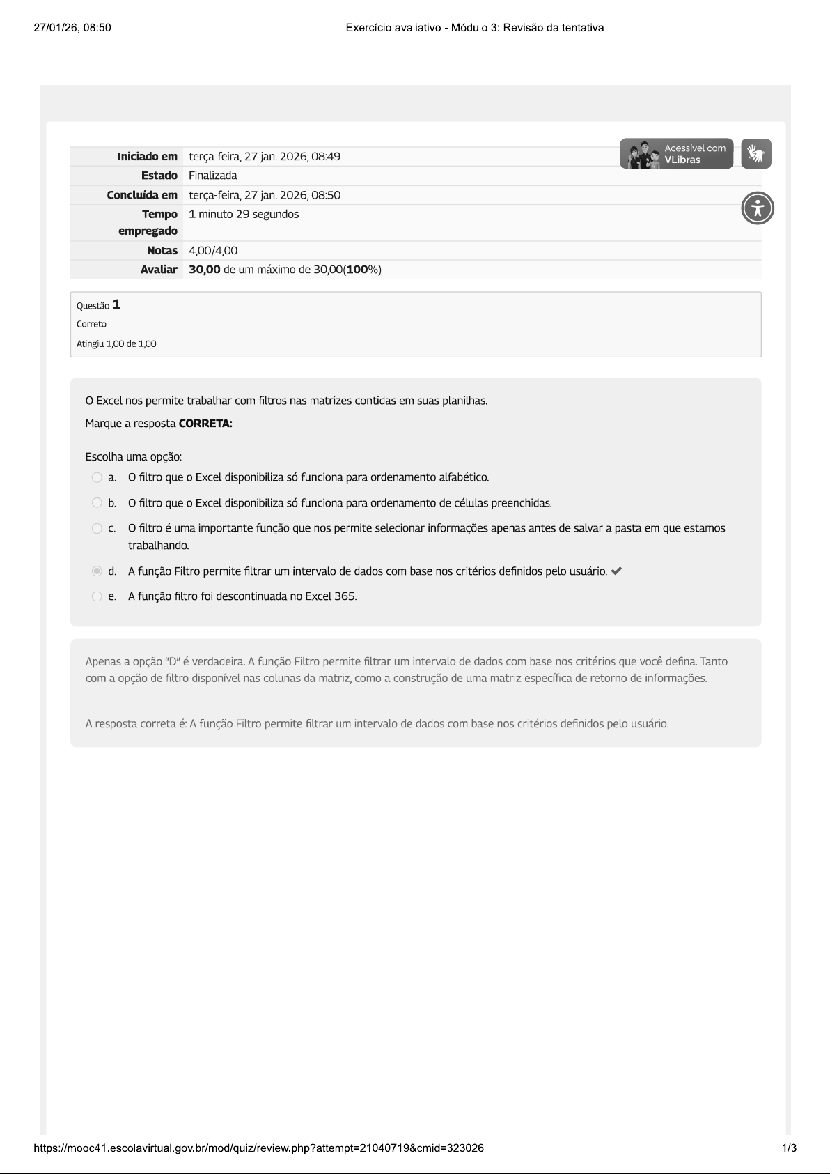 27/01/26, 08:50 Exercício avaliativo Módulo 3: Revisão da tentativa Acessível com Iniciado em terça-feira, 27 jan. 2026, 08:49 VLibras Estado Finalizada Concluída em terça-feira, 27 jan. 2026, 08:50 Tempo 1 minuto 29 segundos empregado Notas 4,00/4,00 Avaliar 30,00 de um máximo de 30,00(100%) Questão 1 Correto Atingiu 1,00 de 1,00 Excel nos permite trabalhar com filtros nas matrizes contidas em suas planilhas. Marque a resposta CORRETA: Escolha uma opção: a. filtro que 0 Excel disponibiliza só funciona para ordenamento alfabético. b. filtro que 0 Excel disponibiliza só funciona para ordenamento de células preenchidas. C. filtro é uma importante função que nos permite selecionar informações apenas antes de salvar a pasta em que estamos trabalhando. d. A função Filtro permite filtrar um intervalo de dados com base nos critérios definidos pelo usuário. e. A função filtro foi descontinuada no Excel 365. Apenas a opção "D" é verdadeira. A função Filtro permite filtrar um intervalo de dados com base nos critérios que você defina. Tanto com a opção de filtro disponível nas colunas da matriz, como a construção de uma matriz específica de retorno de informações. A resposta correta é: A função Filtro permite filtrar um intervalo de dados com base nos critérios definidos pelo usuário. 1/327/01/26, 08:50 Exercício avaliativo Módulo 3: Revisão da tentativa Questão 2 Correto Atingiu 1,00 de 1,00 A Tabela Dinâmica é uma poderosa ferramenta do Excel. Ela utiliza as informações de uma matriz de dados pa Acessível com escolhas do usuário, apresentar as informações organizadas em linhas e colunas. VLibras Quanto a Tabela Dinâmica, marque a resposta CORRETA: Escolha uma opção: a. Tabela Dinâmica só é usada para trabalhar com dados de matrizes que contenham, no máximo, 10 linhas e 10 colunas. b. A Tabela Dinâmica pode auxiliar usuário a organizar dados de uma matriz de acordo com a disposição que usuário preferir. C. A Tabela Dinâmica não pode auxiliar usuário a organizar dados de uma matriz de acordo com a disposição que usuário preferir, pois ela tem apenas 2 formatos de organização de dados. d. A Tabela Dinâmica não serve para trabalhar com valores financeiros, apenas valores em texto. e. A Tabela Dinâmica, diferentemente do que foi enunciado, não apresenta utilidade e, provavelmente, vai ser descontinuada no Excel. A Tabela Dinâmica é uma poderosa ferramenta disponibilizada no Excel. Por meio de sua estrutura e forma de apresentação dos dados originários de uma matriz, 0 usuário pode organizar os dados da matriz original em diferentes formatos, com diferentes disponibilizações gráficas entre colunas e linhas, além de permitir a apresentação das informações com diferentes operadores matemáticos, estatísticos e lógicos. A resposta correta é: A Tabela Dinâmica pode auxiliar 0 usuário a organizar os dados de uma matriz de acordo com a disposição que usuário preferir. Questão 3 Correto Atingiu 1,00 de 1,00 Ao usar as opções de gráficos que Excel disponibiliza, podemos ganhar muito tempo na construção de informações visuais. Por exemplo, gráfico de pizza é ótimo para: Marque a resposta que completa CORRETAMENTE enunciado: Escolha uma opção: a. Apresentar a evolução temporal de uma variável financeira. b. Apresentar a dispersão da cotação de uma ação do mercado financeiro. C. Apresentar uma proporção ou porcentagem do total de alunos de uma sala de aula. d. Nunca ser usado com proporções ou percentagens. e. Ser usado para demonstrar graficamente a pirâmide etária. Pois já apresenta essa forma. Excel exige, em sua sintaxe (fórmula), que textos a serem retornados como respostas às condições estabelecidas no teste lógico estejam entre aspas. Ao não colocar as aspas, 0 Excel tenta ler as palavras maior e menor como parte integrante da fórmula a ser executada e não como resposta do teste lógico SE a2>a3. A resposta correta é: Apresentar uma proporção ou porcentagem do total de alunos de uma sala de aula. 2/327/01/26, 08:50 Exercício avaliativo Módulo 3: Revisão da tentativa Questão 4 Correto Atingiu 1,00 de 1,00 Uma operação comum é construirmos gráficos no Excel, transportando-os para 0 Word (editor de textos). Qua Acessível com VLibras do Excel precisa para efetuar essa operação? Marque a resposta que completa CORRETAMENTE enunciado: Escolha uma opção: a. Não há preocupação, pois software sempre garantirá a visualização e correta disponibilização das informações no Word, mesmo que fique diferente do gráfico originado no Excel. b. É necessário que usuário se preocupe com layout e a qualidade visual das informações após gráfico ser colado no Word, pois nada adianta utilizarmos um gráfico que não apresente as informações corretas ou que esteja com a visualização imperfeita, já que os gráficos devem servir para melhor apresentar informações e conhecimento. C. usuário precisa se preocupar apenas com tamanho do gráfico no Word, pois no Excel não é necessário se preocupar com o layout dos dados nem com a qualidade da visualização das informações. d. Nunca se deve usar gráficos no Word, pois ele é um editor de textos. e. usuário precisa se preocupar apenas com a capacidade computacional de seu equipamento, pois essa operação de copiar um gráfico no Excel e levar para 0 Word exige demasiados recursos do computador. Sua resposta está correta. Apenas a opção "B" está correta. Ao utilizarmos informações gráficas, elas precisam significar algo para quem está produzindo a informação e necessita transmitir esse significado para quem está consultando essa informação gráfica (gráfico). Por exemplo, se colarmos um gráfico pizza em um relatório e nele não constar nenhuma legenda ou valores, 0 leitor do relatório logo descartará qualquer informação advinda desse gráfico, pois não haverá confiança sobre a infor