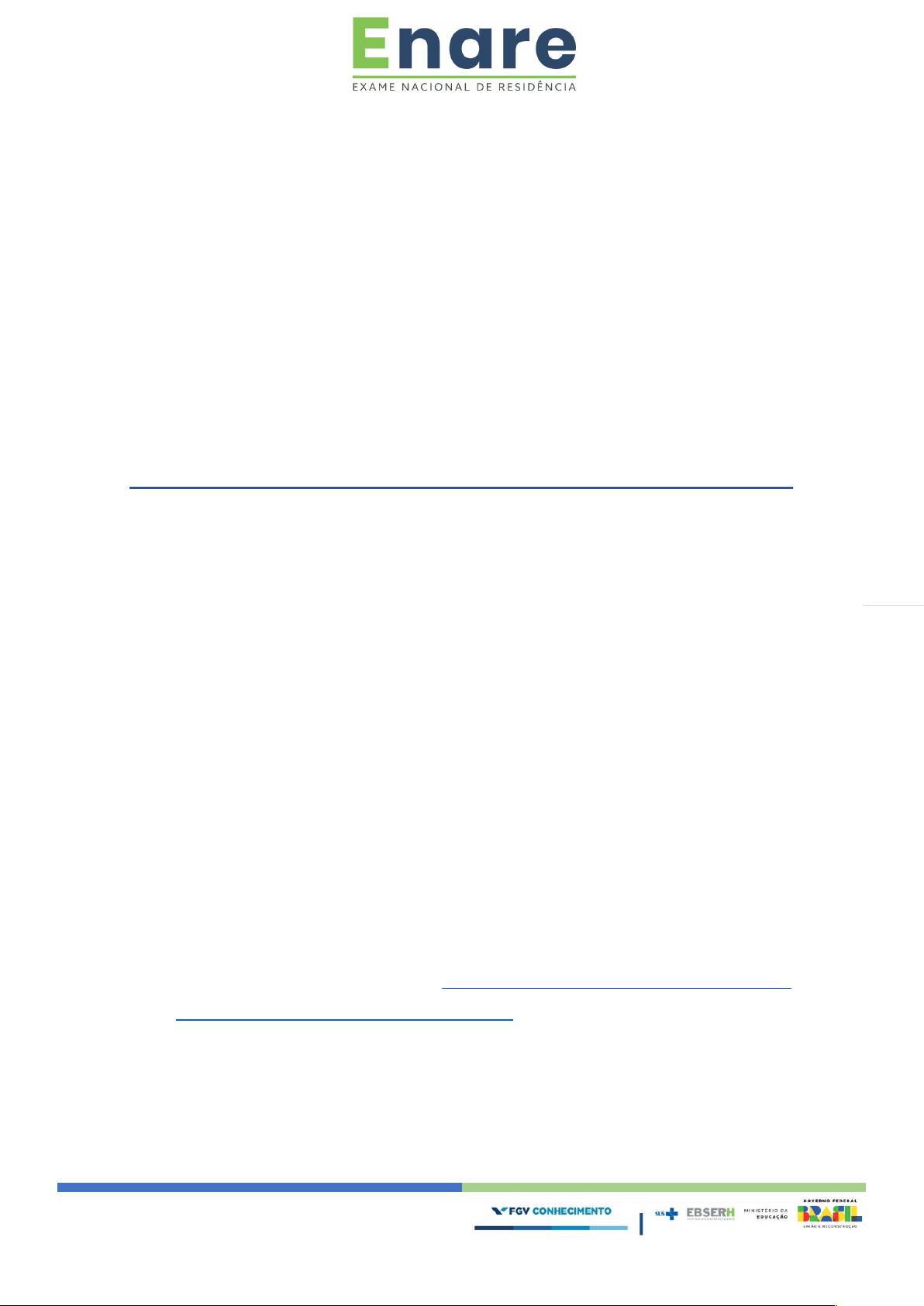 Edital nº 04/2025 – Enare 2025 (Residência Multiprofissional e em Área Profissional da Saúde) 1 MINISTÉRIO DA EDUCAÇÃO EMPRESA BRASILEIRA DE SERVIÇOS HOSPITALARES EXAME NACIONAL DE RESIDÊNCIA ENARE – EDIÇÃO 2025/2026 EDITAL Nº 04/2025 – RESIDÊNCIA MULTIPROFISSIONAL E EM ÁREA PROFISSIONAL DA SAÚDE RETIFICADO EM 15/07/2025 O Presidente da Empresa Brasileira de Serviços Hospitalares (Ebserh) no uso das suas atribuições legais, torna pública a realização da Edição 2025/2026 do Exame Nacional de Residência (Enare), destinado à seleção pública de candidatos ao preenchimento de vagas para residentes em Programas de Residência Multiprofissional e em Área Profissional da Saúde (Uniprofissional). 1. DAS DIPOSIÇÕES PRELIMINARES 1.1 O Enare é um processo seletivo unificado destinado ao preenchimento das vagas disponíveis nos programas de residência de Instituições Participantes, na modalidade de ensino de pós-graduação lato sensu. 1.2 A Ebserh é responsável pela organização do Enare, com o apoio da Fundação Getulio Vargas (FGV), entidade regularmente contratada para a condução desse processo de seleção. 1.3 Os Programas de Residência Multiprofissional e em Área Profissional da Saúde (Uniprofissional) destinados às profissões da saúde, excetuada a área médica, são organizados sob a forma de curso de especialização, caracterizado por ensino em serviço, em regime máximo de 60 (sessenta) horas semanais, duração mínima de 2 (dois) anos e em regime de dedicação exclusiva, com vagas ofertadas pelas Instituições Participantes. 1.3.1 A dedicação exclusiva impede a frequência de profissionais de saúde residentes em concomitância com qualquer outra atividade profissional ou de trabalho com recompensa indenizatória e é incompatível com a frequência a qualquer atividade formativa que exija dispensa da assiduidade integral às 60 (sessenta) horas semanais, incluindo programas de mestrado ou doutorado, conforme Despacho Orientador da Comissão Nacional de Residência Multiprofissional em Saúde (CNRMS). 1.4 O Enare não se destina a provimento de cargo ou emprego público, portanto, a aprovação e matrícula no Programa de Residência não enseja a formação de vínculo estatutário ou empregatício com a Ebserh e/ou com as Instituições Participantes. 1.5 O processo seletivo observará as normas da Comissão Nacional de Residência Edital nº 04/2025 – Enare 2025 (Residência Multiprofissional e em Área Profissional da Saúde) 2 Multiprofissional (CNRMS) do Ministério do Educação (MEC), e a legislação correlata. 1.6 Para participação no processo seletivo, os candidatos deverão ter diploma de graduação ou estar em processo de formação, desde que estejam cursando o último semestre e com conclusão (colação de grau) prevista até, no máximo, a data do início do programa ao qual estão concorrendo, sendo vedada a participação na seleção de estudantes que concluirão o curso após essa data, assim como de profissionais não habilitados. 1.7 Os horários mencionados no presente Edital obedecerão ao horário oficial de Brasília/DF. 1.8 Os candidatos arcarão com todas as despesas advindas de seus deslocamentos, obrigatórios ou voluntários, referentes à sua participação no certame. 1.9 Todas as informações do processo seletivo serão disponibilizadas no endereço eletrônico https://enare.ebserh.gov.br/, sendo de inteira responsabilidade do candidato o acompanhamento de tais publicações. 1.10 São parte integrante deste Edital os seguintes anexos: a) Anexo I – Instituições Participantes; b) Anexo II – Vagas Ofertadas; c) Anexo III – Prova Objetiva: Conhecimentos, Habilidades e Atitudes; d) Anexo IV – Cronograma Previsto. 2. DAS VAGAS E DAS INSTITUIÇÕES PARTICIPANTES 2.1. A lista das Instituições Participantes, os programas e respectivas vagas a serem ofertadas constam no Anexo I – Instituições Participantes e no Anexo II – Vagas Ofertadas. 2.2. Serão ofertadas exclusivamente vagas em Programas de Residência Multiprofissional e em Área Profissional da Saúde (Uniprofissional) autorizadas pelo Ministério da Educação (MEC). 2.3. As Instituições Participantes são exclusivamente responsáveis pela oferta dos programas, pelo quantitativo de vagas declarado no seu termo de adesão ao Enare e pelas obrigações nele contidas. 2.4. Nos prazos definido no Anexo IV – Cronograma Previsto, as Instituições Participantes poderão realizar a atualização dos programas e das vagas inicialmente disponibilizados. Edital nº 04/2025 – Enare 2025 (Residência Multiprofissional e em Área Profissional da Saúde) 3 3. DOS REQUISITOS MÍNIMOS PARA ADMISSÃO NO PROGRAMA DE RESIDÊNCIA 3.1. São requisitos mínimos para admissão nos Programas de Residência Multiprofissional e em Área Profissional da Saúde (Uniprofissional): a) ter diploma, certificado ou declaração de conclusão de curso de graduação em profissão da saúde, emitido por instituição de ensino superior reconhecida pelo Ministério da Educação (MEC); b) ter inscrição definitiva ou provisória nos respectivos conselhos de classe, quando aplicável; c) estar em dia com as obrigações eleitorais e no gozo dos direitos civis e políticos; d) apresentar certificado de reservista ou dispensa do serviço militar obrigatório, em caso de candidato do sexo masculino; e) para profissionais graduados ou pós-graduados em instituições estrangeiras, diploma revalidado, nos termos da legislação vigente; f) para estrangeiros, a exigência de comprovação de imigração regular no Brasil e Certificado de Proficiência em Língua Portuguesa (Celpe-Bras) emitido pelo Instituto Nacional de Estudos de Pesquisas Educacionais Anísio Teixeira (Inep). 3.1.1. Para admissão no Programa de Residência que oferta vaga para a área profissional de Educação Física é necessária a apresentação de diploma, certificado ou declara