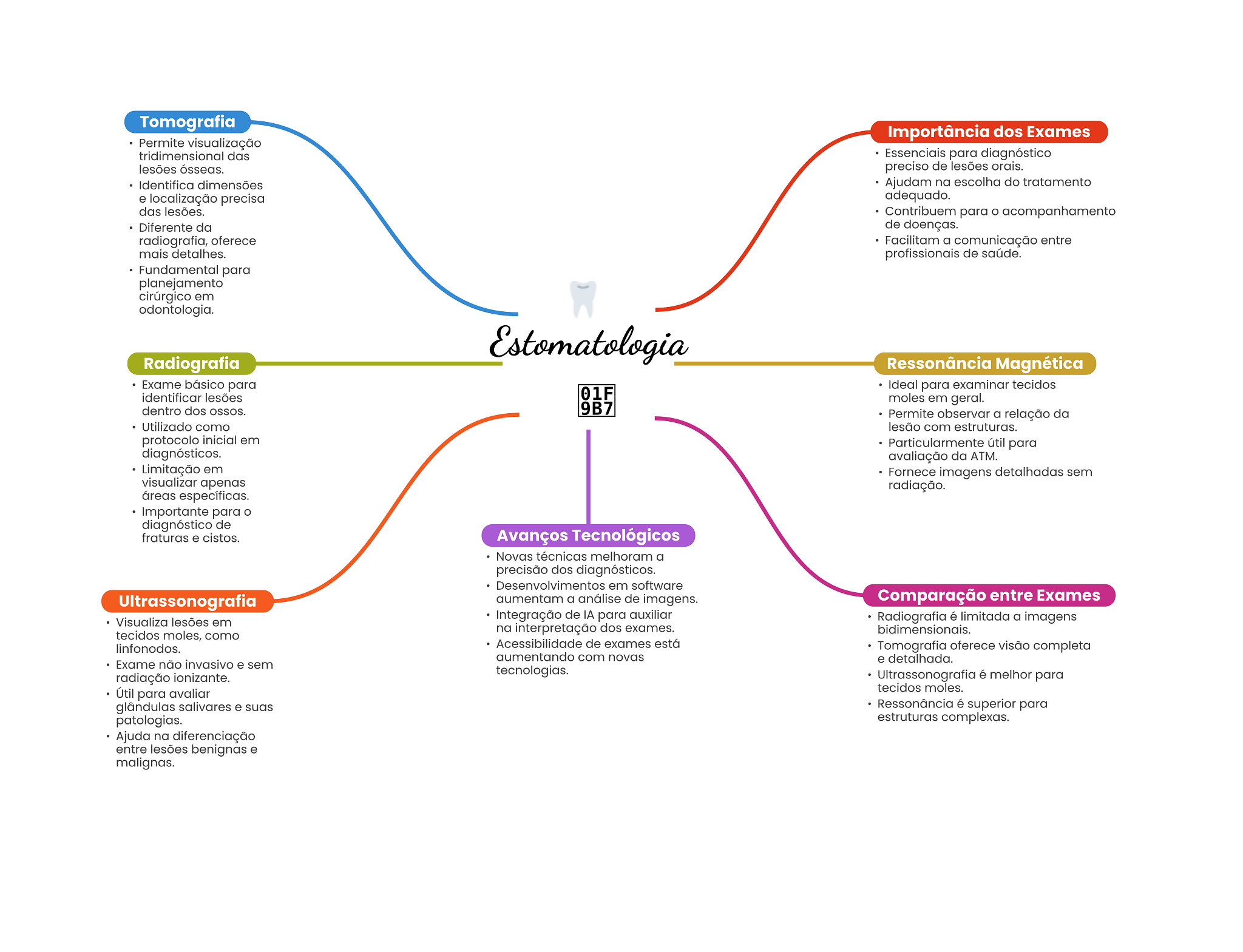 Tomografia Importância dos Exames Permite visualização tridimensional das Essenciais para diagnóstico lesões ósseas. preciso de lesões orais. Identifica dimensões Ajudam na escolha do tratamento e localização precisa adequado. das lesões. Contribuem para acompanhamento Diferente da de doenças. radiografia, oferece Facilitam a comunicação entre mais detalhes. profissionais de saúde. Fundamental para planejamento cirúrgico em odontologia. Estomatologia Radiografia Ressonância Magnética Exame básico para Ideal para examinar tecidos identificar lesões 01F moles em geral. dentro dos OSSOS. 9B7 Permite observar a relação da Utilizado como lesão com estruturas. protocolo inicial em Particularmente útil para diagnósticos. avaliação da ATM. Limitação em Fornece imagens detalhadas sem visualizar apenas radiação. áreas específicas. Importante para diagnóstico de fraturas e cistos. Avanços Tecnológicos Novas técnicas melhoram a precisão dos diagnósticos. Desenvolvimentos em software Ultrassonografia aumentam a análise de imagens. Comparação entre Exames Visualiza lesões em Integração de IA para auxiliar Radiografia é limitada a imagens na interpretação dos exames. bidimensionais. tecidos moles, como linfonodos. Acessibilidade de exames está Tomografia oferece visão completa aumentando com novas Exame não invasivo e sem e detalhada. tecnologias. radiação ionizante. Ultrassonografia é melhor para Útil para avaliar tecidos moles. glândulas salivares e suas Ressonância é superior para patologias. estruturas complexas. Ajuda na diferenciação entre lesões benignas e malignas.