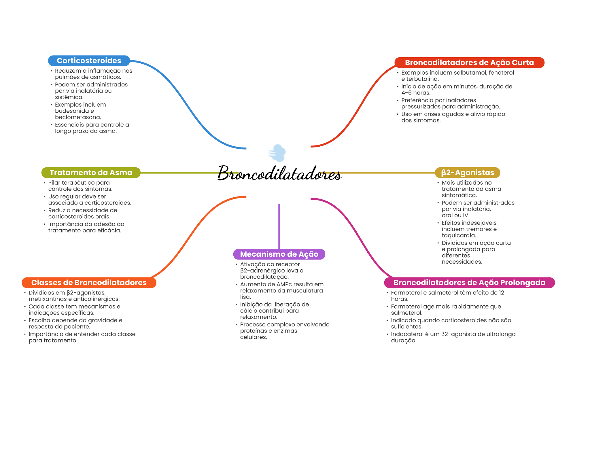 Corticosteroides Broncodilatadores de Ação Curta Reduzem a inflamação nos Exemplos incluem salbutamol, fenoterol pulmões de asmáticos. e terbutalina. Podem ser administrados Início de ação em minutos, duração de por via inalatória ou 4-6 horas. sistêmica. Preferência por inaladores Exemplos incluem pressurizados para administração. budesonida e Uso em crises agudas e alívio rápido dos sintomas. Essenciais para controle a longo prazo da asma. Tratamento da Asma Broncodilatadores ß2-Agonistas Pilar terapêutico para Mais utilizados no controle dos sintomas. tratamento da asma Uso regular deve ser sintomática. associado a corticosteroides. Podem ser administrados Reduz a necessidade de por via inalatória, corticosteroides orais. oral ou IV. Importância da adesão ao Efeitos indesejáveis tratamento para eficácia. incluem tremores e taquicardia. Divididos em ação curta e prolongada para Mecanismo de Ação diferentes Ativação do receptor necessidades. leva a broncodilatação. Classes de Broncodilatadores Aumento de AMPc resulta em Broncodilatadores de Ação Prolongada Divididos em relaxamento da musculatura Formoterol e salmeterol têm efeito de 12 metilxantinas e anticolinérgicos. lisa. horas. Cada classe tem mecanismos e Inibição da liberação de Formoterol age mais rapidamente que indicações específicas. cálcio contribui para salmeterol. relaxamento. Escolha depende da gravidade e Indicado quando corticosteroides não são resposta do paciente. Processo complexo envolvendo suficientes. proteínas e enzimas Importância de entender cada classe celulares. Indacaterol é um de ultralonga para tratamento. duração.