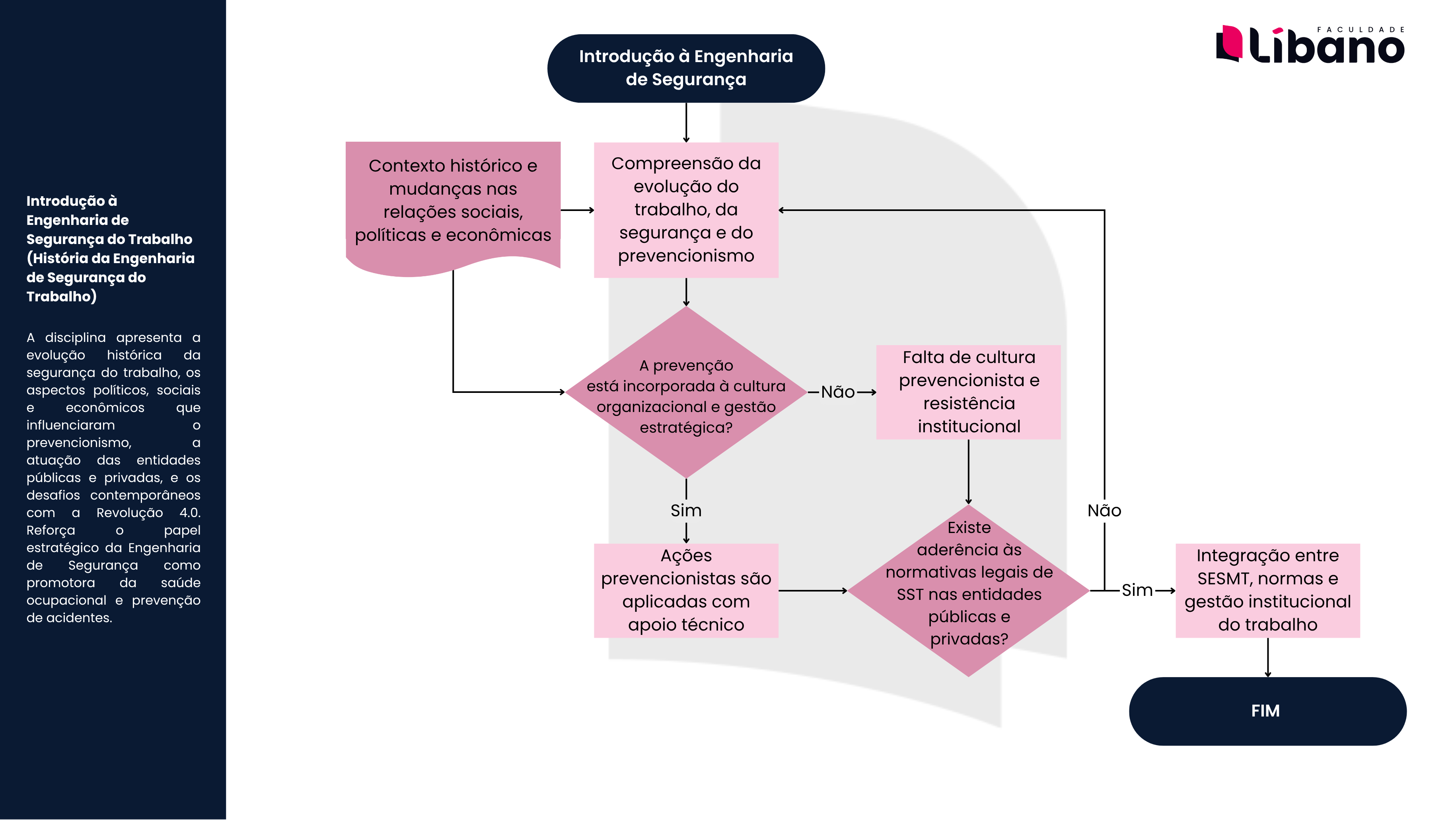 FACULDADE Introdução à Engenharia Libano de Segurança Contexto histórico e Compreensão da mudanças nas evolução do Introdução à relações sociais, trabalho, da Engenharia de Segurança do Trabalho políticas e econômicas segurança e do (História da Engenharia prevencionismo de Segurança do Trabalho) A disciplina apresenta a evolução histórica da Falta de cultura segurança do trabalho, A prevenção está incorporada à cultura prevencionista e aspectos políticos, sociais Não e econômicos que organizacional e gestão resistência influenciaram estratégica? institucional prevencionismo, a atuação das entidades públicas e privadas, e os desafios contemporâneos com a Revolução 4.0. Sim Não Reforça papel Existe estratégico da Engenharia Ações aderência às Integração entre de Segurança como prevencionistas são normativas legais de promotora da saúde SESMT, normas e ocupacional e prevenção aplicadas com SST nas entidades Sim gestão institucional de acidentes. apoio técnico públicas e do trabalho privadas? FIM