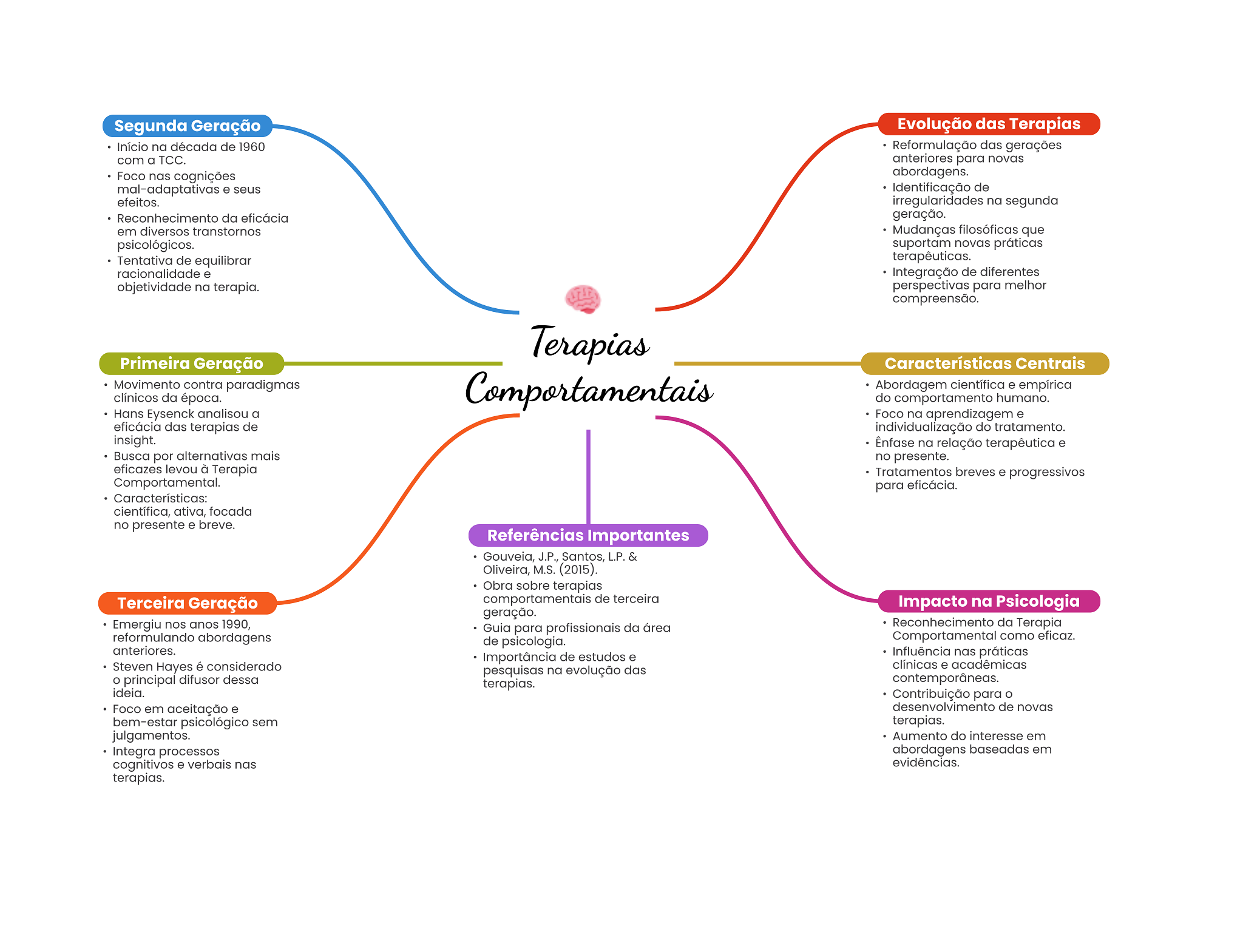 Segunda Geração Evolução das Terapias Início na década de 1960 Reformulação das gerações com a TCC. anteriores para novas Foco nas cognições abordagens. mal-adaptativas e seus Identificação de efeitos. irregularidades na segunda Reconhecimento da eficácia geração. em diversos transtornos Mudanças filosóficas que psicológicos. suportam novas práticas Tentativa de equilibrar terapêuticas. racionalidade e Integração de diferentes objetividade na terapia. perspectivas para melhor compreensão. Terapias Primeira Geração Características Centrais Movimento contra paradigmas clínicos da época. Comportamentais Abordagem científica e empírica do comportamento humano. Hans Eysenck analisou a Foco na aprendizagem e eficácia das terapias de individualização do tratamento. insight. Ênfase na relação terapêutica e Busca por alternativas mais no presente. eficazes levou à Terapia Tratamentos breves e progressivos Comportamental. para eficácia. Características: científica, ativa, focada no presente e breve. Referências Importantes Gouveia, J.P., Santos, L.P. & Oliveira, M.S. (2015). Obra sobre terapias Terceira Geração comportamentais de terceira Impacto na Psicologia geração. Emergiu nos anos 1990, Guia para profissionais da área Reconhecimento da Terapia reformulando abordagens de psicologia. Comportamental como eficaz. anteriores. Importância de estudos e Influência nas práticas Steven Hayes é considerado clínicas e acadêmicas pesquisas na evolução das principal difusor dessa terapias. ideia. Contribuição para Foco em aceitação e desenvolvimento de novas bem-estar psicológico sem terapias. julgamentos. Aumento do interesse em Integra processos abordagens baseadas em cognitivos e verbais nas evidências. terapias.