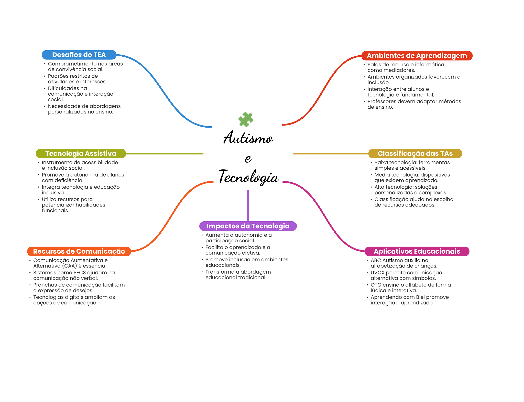 Desafios do TEA Ambientes de Aprendizagem Comprometimento nas áreas Salas de recurso e informática de convivência social. como mediadores. Padrões restritos de Ambientes organizados favorecem a atividades e interesses. inclusão. Dificuldades na Interação entre alunos e comunicação e interação tecnologia é fundamental. social. Professores devem adaptar métodos Necessidade de abordagens de ensino. personalizadas no ensino. Autismo Tecnologia Assistiva Classificação das TAs Instrumento de acessibilidade e Baixa tecnologia: ferramentas e inclusão social. simples e acessíveis. Promove a autonomia de alunos Tecnologia Média tecnologia: dispositivos com deficiência. que exigem aprendizado. Integra tecnologia e educação Alta tecnologia: soluções inclusiva. personalizadas e complexas. Utiliza recursos para Classificação ajuda na escolha potencializar habilidades de recursos adequados. funcionais. Impactos da Tecnologia Aumenta a autonomia e a participação social. Facilita aprendizado e a Recursos de Comunicação comunicação efetiva. Aplicativos Educacionais Comunicação Aumentativa e Promove inclusão em ambientes ABC Autismo auxilia na Alternativa (CAA) é essencial. educacionais. alfabetização de crianças. Sistemas como PECS ajudam na Transforma a abordagem LIVOX permite comunicação comunicação não verbal. educacional tradicional. alternativa com símbolos. Pranchas de comunicação facilitam OTO ensina O alfabeto de forma a expressão de desejos. lúdica e interativa. Tecnologias digitais ampliam as Aprendendo com Biel promove opções de comunicação. interação e aprendizado.