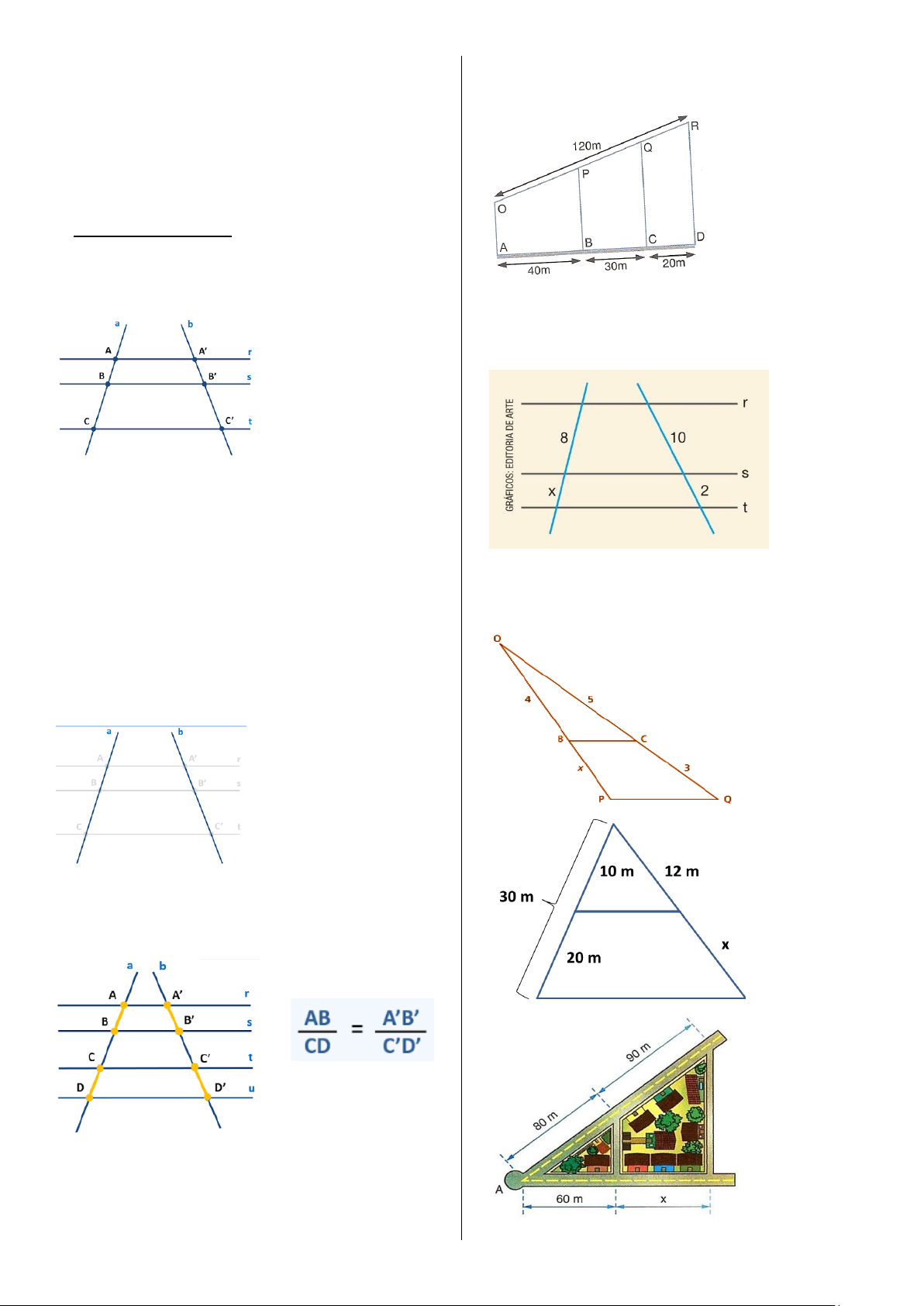 AULA 66 (9º ANO) TEOREMA DE TALES razões, proporções e segmentos proporcionais O Teorema de Tales leva em conta a proporcionalidade entre medidas. A PROPORCIONALIDADE é a base do TEOREMA DE TALES, um dos teoremas mais famosos da Matemática. CONSIDERE O FEIXE DE RETAS PARALELAS A SEGUIR: Um feixe de retas paralelas é um conjunto de retas distintas de um plano, e que são paralelas entre si. Na figura a seguir, o feixe de retas paralelas está representado pelas retas r, s e t. RETAS TRANSVERSAIS Retas transversais ao feixe de retas paralelas são retas do plano do feixe que cortam todas as retas do feixe. Na figura, as retas transversais estão representadas pelas retas a e b. Feixes de retas paralelas intersectadas por segmentos transversais formam segmentos de retas proporcionalmente correspondentes. Assim, podemos concluir a seguinte relação, que segue (de acordo com o Teorema de Tales) uma PROPORÇÃO: 1. PRATICANDO JUNTOS! Encontrar a medida do segmento PQ, em metros: 2. Na figura a seguir, temos r // s // t. Vamos determinar a medida x indicada, sabendo que os segmentos correspondentes são proporcionais. AULA 67 ( 9º ANO) Use o teorema de Tales