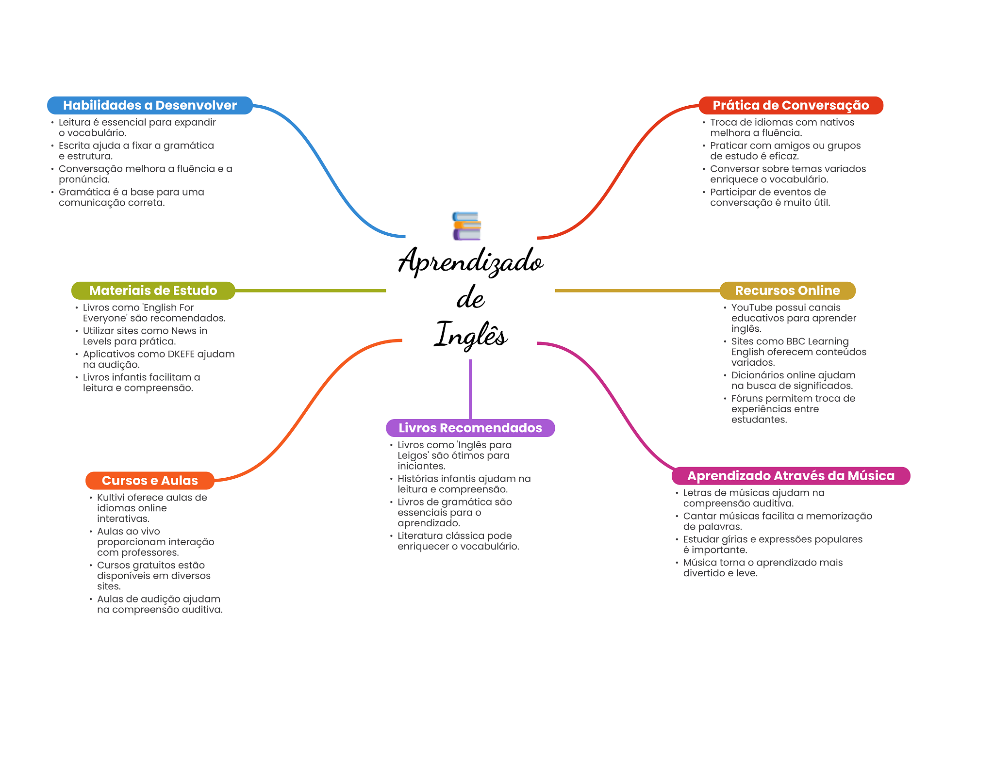 Habilidades a Desenvolver Prática de Conversação Leitura é essencial para expandir Troca de idiomas com nativos vocabulário. melhora a fluência. Escrita ajuda a fixar a gramática Praticar com amigos ou grupos e estrutura. de estudo é eficaz. Conversação melhora a fluência e a Conversar sobre temas variados pronúncia. enriquece vocabulário. Gramática é a base para uma Participar de eventos de comunicação correta. conversação é muito útil. Aprendizado Materiais de Estudo de Recursos Online Livros como 'English For YouTube possui canais Everyone' são recomendados. educativos para aprender Utilizar sites como News in Inglês inglês. Levels para prática. Sites como BBC Learning Aplicativos como DKEFE ajudam English oferecem conteúdos na audição. variados. Livros infantis facilitam a Dicionários online ajudam leitura e compreensão. na busca de significados. Fóruns permitem troca de experiências entre estudantes. Livros Recomendados Livros como para Leigos' são ótimos para iniciantes. Cursos e Aulas Histórias infantis ajudam na Aprendizado Através da Música leitura e compreensão. Kultivi oferece aulas de Letras de músicas ajudam na idiomas online Livros de gramática são compreensão auditiva. essenciais para O interativas. Cantar músicas facilita a memorização aprendizado. Aulas ao vivo de palavras. Literatura clássica pode proporcionam interação Estudar gírias e expressões populares enriquecer vocabulário. com professores. é importante. Cursos gratuitos estão Música torna aprendizado mais disponíveis em diversos divertido e leve. sites. Aulas de audição ajudam na compreensão auditiva.