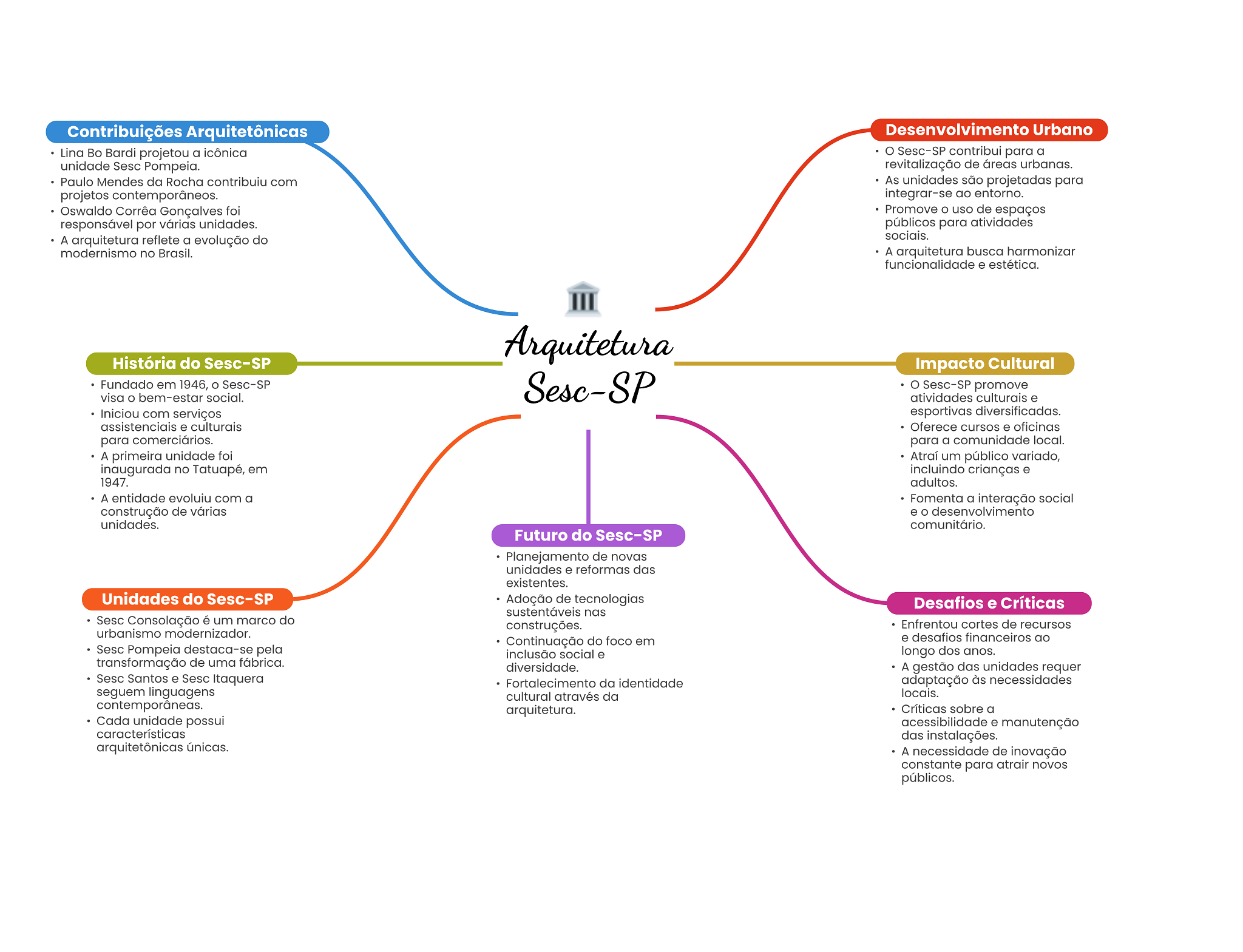 Contribuições Arquitetônicas Desenvolvimento Urbano Lina Bo Bardi projetou a icônica Sesc-SP contribui para a unidade Sesc Pompeia. revitalização de áreas urbanas. Paulo Mendes da Rocha contribuiu com As unidades são projetadas para projetos contemporâneos. integrar-se ao entorno. Oswaldo Corrêa Gonçalves foi Promove O uso de espaços responsável por várias unidades. públicos para atividades A arquitetura reflete a evolução do sociais. modernismo no Brasil. A arquitetura busca harmonizar funcionalidade e estética. Arquitetura História do Sesc-SP Impacto Cultural Fundado em 1946, O Sesc-SP visa bem-estar social. Sesc-SP Sesc-SP promove atividades culturais e Iniciou com serviços esportivas diversificadas. assistenciais e culturais Oferece cursos e oficinas para comerciários. para a comunidade local. A primeira unidade foi Atraí um público variado, inaugurada no Tatuapé, em incluindo crianças e 1947. adultos. A entidade evoluiu com a Fomenta a interação social construção de várias e O desenvolvimento unidades. comunitário. Futuro do Sesc-SP Planejamento de novas unidades e reformas das existentes. Unidades do Sesc-SP Adoção de tecnologias Desafios e Críticas sustentáveis nas Sesc Consolação é um marco do construções. Enfrentou cortes de recursos urbanismo modernizador. Continuação do foco em e desafios financeiros ao Sesc Pompeia destaca-se pela inclusão social e longo dos anos. transformação de uma fábrica. diversidade. A gestão das unidades requer Sesc Santos e Sesc Itaquera Fortalecimento da identidade adaptação às necessidades seguem linguagens cultural através da locais. contemporâneas. arquitetura. Críticas sobre a Cada unidade possui acessibilidade e manutenção características das instalações. arquitetônicas únicas. A necessidade de inovação constante para atrair novos públicos.