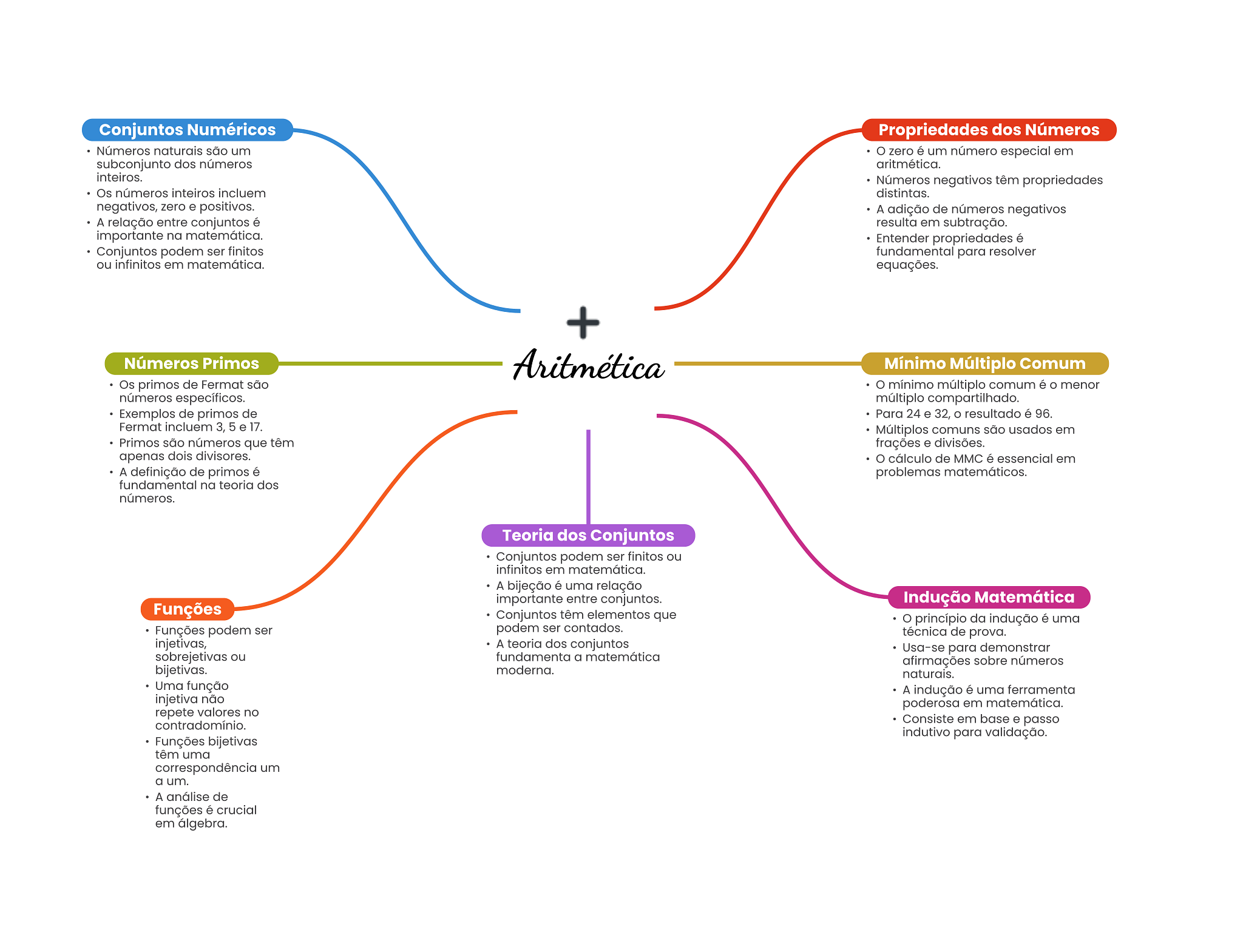 Conjuntos Numéricos Propriedades dos Números Números naturais são um zero é um número especial em subconjunto dos números aritmética. inteiros. Números negativos têm propriedades Os números inteiros incluem distintas. negativos, zero e positivos. A adição de números negativos A relação entre conjuntos é resulta em subtração. importante na matemática. Entender propriedades é Conjuntos podem ser finitos fundamental para resolver ou infinitos em matemática. equações. + Números Primos Aritmética Mínimo Múltiplo Comum Os primos de Fermat são mínimo múltiplo comum é O menor números específicos. múltiplo compartilhado. Exemplos de primos de Para 24 e 32, O resultado é 96. Fermat incluem 3, 5 e 17. Múltiplos comuns são usados em Primos são números que têm frações e divisões. apenas dois divisores. cálculo de MMC é essencial em A definição de primos é problemas matemáticos. fundamental na teoria dos números. Teoria dos Conjuntos Conjuntos podem ser finitos ou infinitos em matemática. A bijeção é uma relação importante entre conjuntos. Indução Matemática Funções Conjuntos têm elementos que princípio da indução é uma Funções podem ser podem ser contados. técnica de prova. injetivas, A teoria dos conjuntos Usa-se para demonstrar sobrejetivas ou fundamenta a matemática afirmações sobre números bijetivas. moderna. naturais. Uma função A indução é uma ferramenta injetiva não poderosa em matemática. repete valores no contradomínio. Consiste em base e passo indutivo para validação. Funções bijetivas têm uma correspondência um a um. A análise de funções é crucial em álgebra.