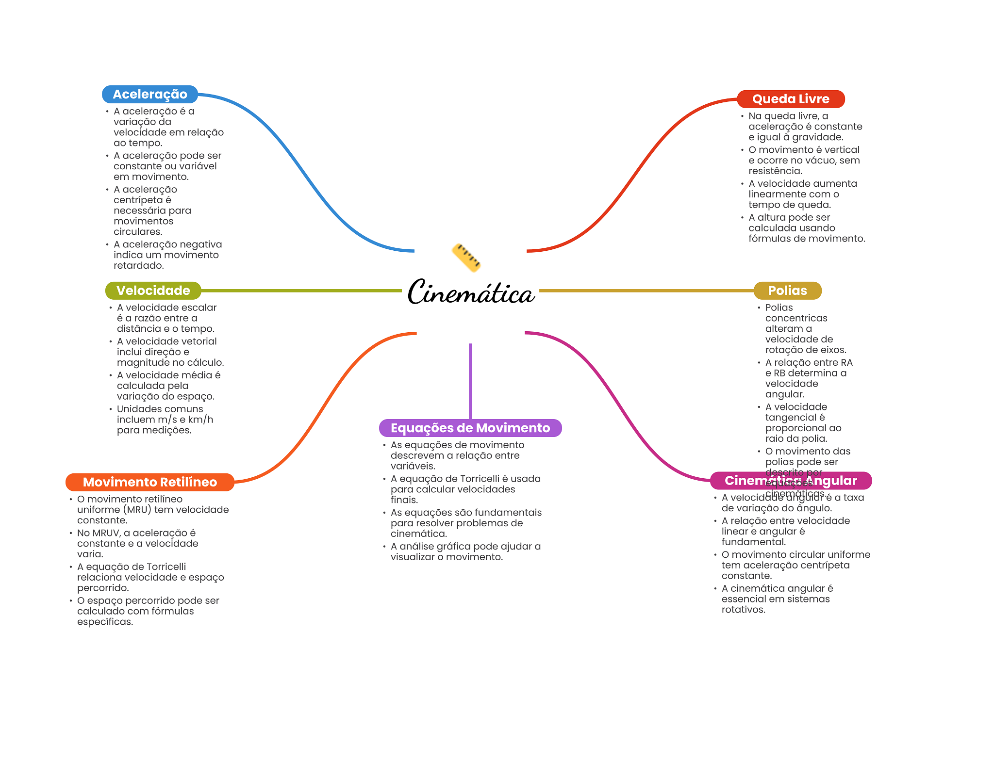 Aceleração Queda Livre A aceleração é a Na queda livre, a variação da aceleração é constante velocidade em relação e igual à gravidade. ao tempo. movimento é vertical A aceleração pode ser e ocorre no vácuo, sem constante ou variável resistência. em movimento. A velocidade aumenta A aceleração linearmente com centrípeta é tempo de queda. necessária para movimentos A altura pode ser circulares. calculada usando fórmulas de movimento. A aceleração negativa indica um movimento retardado. Velocidade Cinemática Polias A velocidade escalar Polias é a razão entre a concentricas distância e tempo. alteram a A velocidade vetorial velocidade de inclui direção e rotação de eixos. magnitude no cálculo. A relação entre RA A velocidade média é e RB determina a calculada pela velocidade variação do espaço. angular. Unidades comuns A velocidade incluem m/s e km/h tangencial é para medições. Equações de Movimento proporcional ao raio da polia. As equações de movimento O movimento das descrevem a relação entre variáveis. polias pode ser descrito Movimento Retilíneo A equação de Torricelli é usada Cinemática Angular para calcular velocidades movimento retilíneo finais. A a taxa uniforme (MRU) tem velocidade As equações são fundamentais de variação do ângulo. constante. para resolver problemas de A relação entre velocidade No MRUV, a aceleração é cinemática. linear e angular é constante e a velocidade fundamental. A análise gráfica pode ajudar a varia. visualizar O movimento. movimento circular uniforme A equação de Torricelli tem aceleração centrípeta relaciona velocidade e espaço constante. percorrido. A cinemática angular é espaço percorrido pode ser essencial em sistemas calculado com fórmulas rotativos. específicas.