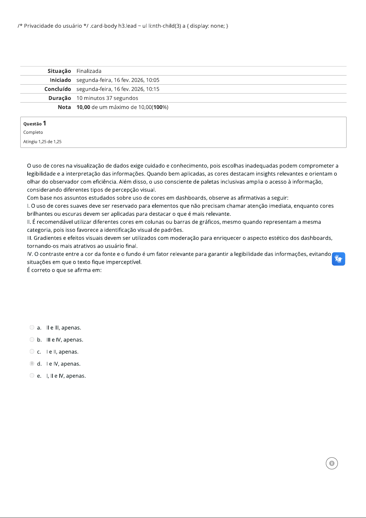 /* Privacidade do usuário .card-body h3.lead ul li:nth-child(3) a { display: none; } Situação Finalizada Iniciado segunda-feira, 16 fev. 2026, 10:05 Concluído segunda-feira, 16 fev. 2026, 10:15 Duração 10 minutos 37 segundos Nota 10,00 de um máximo de 10,00(100%) Questão 1 Completo Atingiu 1,25 de 1,25 uso de cores na visualização de dados exige cuidado e conhecimento, pois escolhas inadequadas podem comprometer a legibilidade e a interpretação das informações. Quando bem aplicadas, as cores destacam insights relevantes e orientam o olhar do observador com eficiência. Além disso, o uso consciente de paletas inclusivas amplia o acesso à informação, considerando diferentes tipos de percepção visual. Com base nos assuntos estudados sobre uso de cores em dashboards, observe as afirmativas a seguir: I. uso de cores suaves deve ser reservado para elementos que não precisam chamar atenção imediata, enquanto cores brilhantes ou escuras devem ser aplicadas para destacar que é mais relevante. II. É recomendável utilizar diferentes cores em colunas ou barras de gráficos, mesmo quando representam a mesma categoria, pois isso favorece a identificação visual de padrões. III. Gradientes e efeitos visuais devem ser utilizados com moderação para enriquecer aspecto estético dos dashboards, tornando-os mais atrativos ao usuário final. IV. contraste entre a cor da fonte e o fundo é um fator relevante para garantir a legibilidade das informações, evitando situações em que o texto fique imperceptível. É correto o que se afirma em: a. e III, apenas. b. III e IV, apenas. C. le II, apenas. d. le IV, apenas. e. I, e IV, apenas.Questão 2 Completo Atingiu 1,25 de 1,25 Leia o trecho a seguir: Combinar e escolher cores no design gráfico é essencial para criar uma identidade visual impactante e atrativa. As cores exercem influência sobre as emoções e percepções do público, sendo decisivas para a imagem que uma marca deseja transmitir. uso do [preencher1] é uma das principais ferramentas para esse processo, permitindo a identificação de cores primárias, secundárias e terciárias, bem como suas possíveis combinações. Dentre as combinações possíveis, destacam-se as [preencher2], que estão em lados opostos e geram contraste e energia. Nesse sentido, identifique os termos [preencher1] e [preencher2] que são substituídos por: a. 1 esquema estrutural; 2 cores opacas. b. 1 círculo cromático; 2 cores complementares. C. 1 sistema radial; 2 nuances secundárias. d. 1 painel geométrico; 2 matizes neutras. e. 1 diagrama vetorial; 2 tonalidades suaves. Questão 3 Completo Atingiu 1,25 de 1,25 A acuidade visual, a estética e o engajamento são aspectos fundamentais na construção de visualizações eficazes. Quand bem equilibrados, contribuem para que a informação seja percebida com clareza, apresentada de forma atrativa e capaz de manter o interesse do público. Esses elementos fortalecem a comunicação e ampliam impacto das mensagens transmitidas por meio dos dados. Com relação a este contexto e ao conteúdo estudado sobre a acuidade visual, a estética e o engajamento, analise as asserções a seguir e a relação proposta entre elas: I. A construção de representações visuais eficazes exige a consideração da acuidade visual dos espectadores, da estética da composição e do engajamento gerado pela imagem, uma vez que aspectos como detalhamento, iluminação, distância e clareza influenciam diretamente na legibilidade e na atenção do observador. PORQUE II. Elementos estéticos como simetria, equilíbrio e contraste são fundamentais para promover o engajamento com a visualização, pois aumentam a atratividade da imagem, estimulam o tempo de contato e facilitam a leitura progressiva das informações apresentadas. A respeito dessas asserções assinale a alternativa correta: a. A asserção lé uma proposição verdadeira, e a é uma proposição falsa. b. As asserções le são proposições verdadeiras, e a é uma justificativa da I. C. As asserções le são falsas. d. A asserção lé uma proposição falsa, e a é uma proposição verdadeira. e. As asserções le são proposições verdadeiras, mas a não é uma justificativa daQuestão 4 Completo Atingiu 1,25 de 1,25 A utilização de propriedades perceptivas como cor, textura e movimento na visualização de dados tem se consolidado como um dos principais pilares na construção de gráficos, mapas e representações visuais que buscam não apenas transmitir informações, mas também facilitar sua interpretação. A eficácia dessas estratégias depende da correta escolha e aplicação das propriedades perceptivas de acordo com os objetivos do projeto, tipo de dado e o perfil do usuário final. Com relação a este contexto e ao conteúdo estudado sobre propriedades perceptivas na visualização de dados, analise as asserções a seguir e a relação proposta entre elas: I. As propriedades perceptivas da cor, como tonalidade, brilho e saturação, devem ser manipuladas com cautela em projetos de visualização, pois seu uso inadequado pode gerar ambiguidades interpretativas que comprometem a leitura dos dados representados, principalmente quando se utiliza um modelo de cor aditivo como o RGB. PORQUE II. modelo de cores RGB, por ser um sistema aditivo baseado na combinação de luzes vermelha, verde e azul, garante uma percepção uniforme das cores para qualquer tipo de dado visualizado, sendo ideal para manter a distinção e o equilíbrio perceptivo mesmo quando usado em representações complexas de dados contínuos ou discretos. A respeito dessas asserções assinale a alternativa correta: a. As asserções le são proposições verdadeiras, e a é uma justificativa da I. b. A asserção lé uma proposição falsa, e a é uma proposição verdadeira. As asserções le são falsas. d. A asserção lé uma proposição verdadeira, e a é uma proposição falsa. e. As asserções le são 