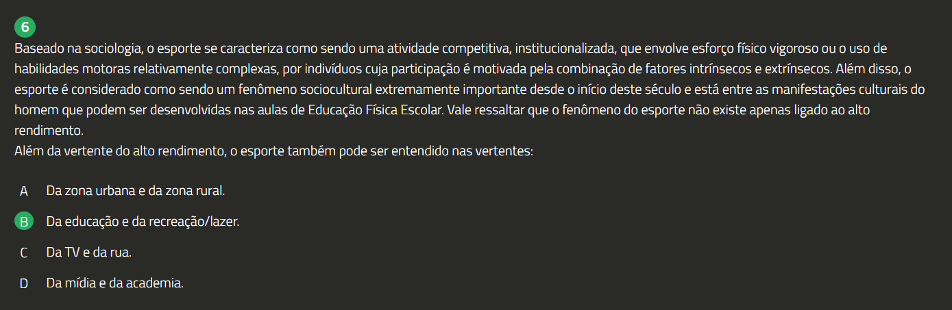 6 Baseado na sociologia, 0 esporte se caracteriza como sendo uma atividade competitiva, institucionalizada, que envolve esforço físico vigoroso ou 0 uso de habilidades motoras relativamente complexas, por indivíduos cuja participação é motivada pela combinação de fatores intrínsecos e extrínsecos. Além disso, 0 esporte é considerado como sendo um fenômeno sociocultural extremamente importante desde 0 início deste século e está entre as manifestações culturais do homem que podem ser desenvolvidas nas aulas de Educação Física Escolar. Vale ressaltar que 0 fenômeno do esporte não existe apenas ligado ao alto rendimento. Além da vertente do alto rendimento, esporte também pode ser entendido nas vertentes: A Da zona urbana e da zona rural. Da educação e da recreação/lazer. Da TV e da rua. D Da mídia e da academia.