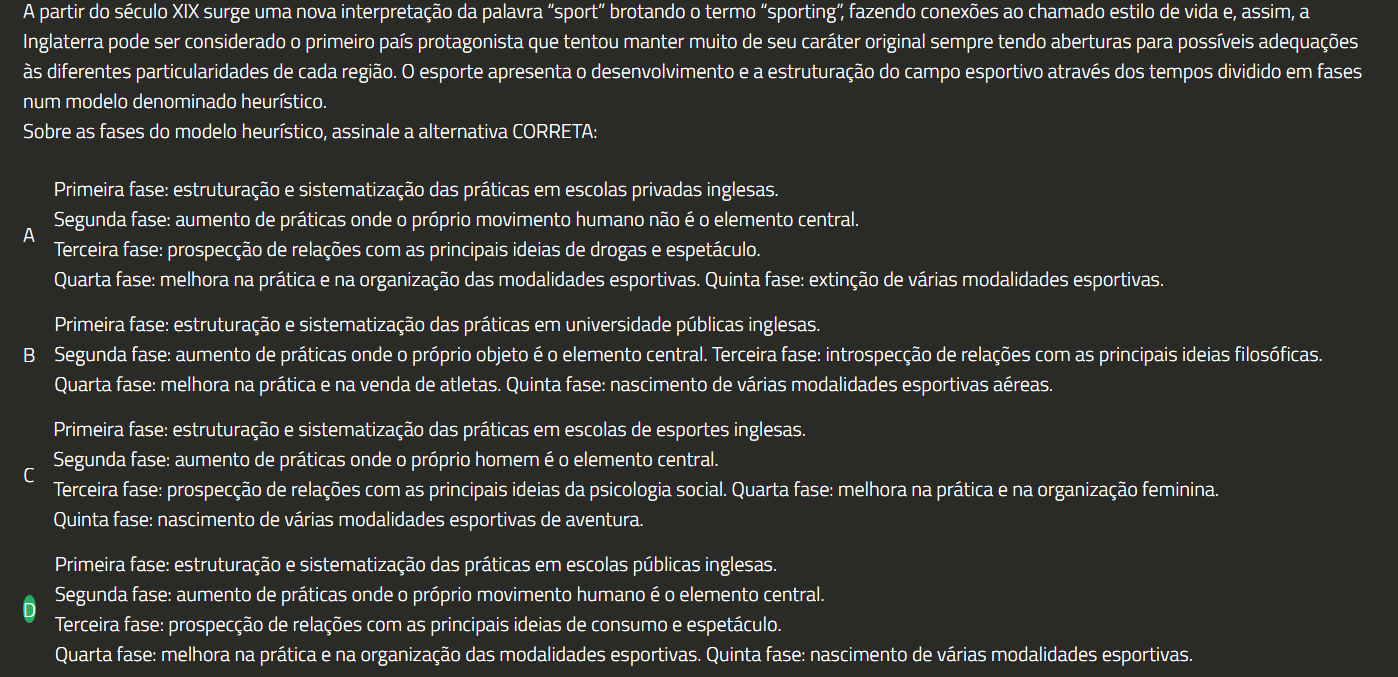A partir do século XIX surge uma nova interpretação da palavra "sport" brotando 0 termo "sporting", fazendo conexões ao chamado estilo de vida e, assim, a Inglaterra pode ser considerado 0 primeiro país protagonista que tentou manter muito de seu caráter original sempre tendo aberturas para possíveis adequações às diferentes particularidades de cada região. 0 esporte apresenta 0 desenvolvimento e a estruturação do campo esportivo através dos tempos dividido em fases num modelo denominado heurístico. Sobre as fases do modelo heurístico, assinale a alternativa CORRETA: Primeira fase: estruturação e sistematização das práticas em escolas privadas inglesas. Segunda fase: aumento de práticas onde 0 próprio movimento humano não é 0 elemento central. A Terceira fase: prospecção de relações com as principais ideias de drogas e espetáculo. Quarta fase: melhora na prática e na organização das modalidades esportivas. Quinta fase: extinção de várias modalidades esportivas. Primeira fase: estruturação e sistematização das práticas em universidade públicas inglesas. Segunda fase: aumento de práticas onde 0 próprio objeto é 0 elemento central. Terceira fase: introspecção de relações com as principais ideias filosóficas. Quarta fase: melhora na prática e na venda de atletas. Quinta fase: nascimento de várias modalidades esportivas aéreas. Primeira fase: estruturação e sistematização das práticas em escolas de esportes inglesas. Segunda fase: aumento de práticas onde 0 próprio homem é 0 elemento central. Terceira fase: prospecção de relações com as principais ideias da psicologia social. Quarta fase: melhora na prática e na organização feminina. Quinta fase: nascimento de várias modalidades esportivas de aventura. Primeira fase: estruturação e sistematização das práticas em escolas públicas inglesas. Segunda fase: aumento de práticas onde 0 próprio movimento humano é 0 elemento central. Terceira fase: prospecção de relações com as principais ideias de consumo e espetáculo. Quarta fase: melhora na prática e na organização das modalidades esportivas. Quinta fase: nascimento de várias modalidades esportivas.