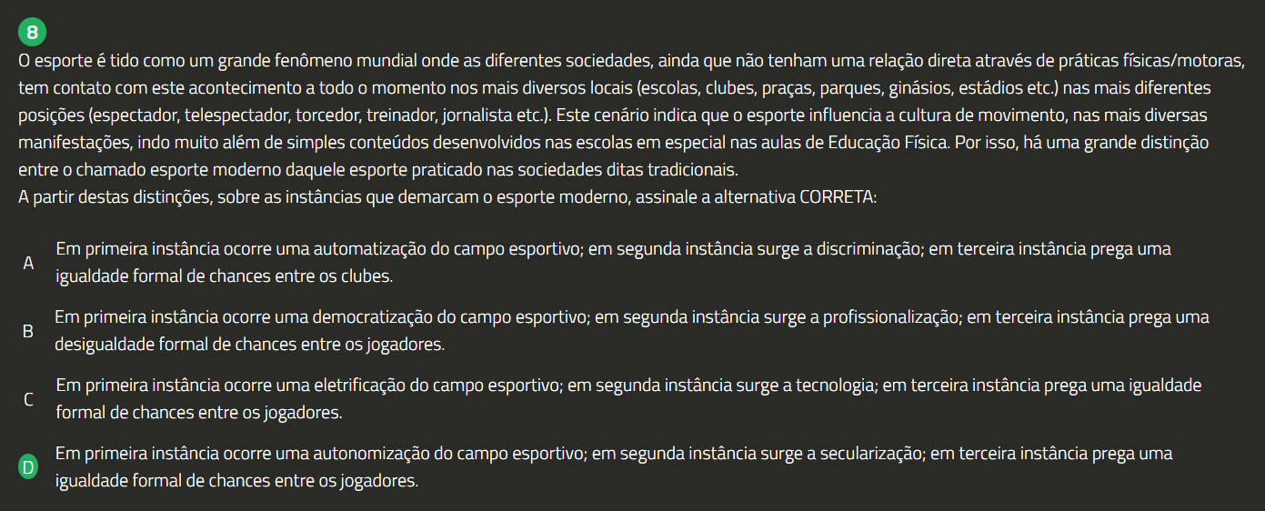 8 0 esporte é tido como um grande fenômeno mundial onde as diferentes sociedades, ainda que não tenham uma relação direta através de práticas físicas/motoras, tem contato com este acontecimento a todo 0 momento nos mais diversos locais (escolas, clubes, praças, parques, ginásios, estádios etc.) nas mais diferentes posições (espectador, telespectador, torcedor, treinador, jornalista etc.). Este cenário indica que 0 esporte influencia a cultura de movimento, nas mais diversas manifestações, indo muito além de simples conteúdos desenvolvidos nas escolas em especial nas aulas de Educação Física. Por isso, há uma grande distinção entre chamado esporte moderno daquele esporte praticado nas sociedades ditas tradicionais. A partir destas distinções, sobre as instâncias que demarcam 0 esporte moderno, assinale a alternativa CORRETA: Em primeira instância ocorre uma automatização do campo esportivo; em segunda instância surge a discriminação; em terceira instância prega uma A igualdade formal de chances entre clubes. Em primeira instância ocorre uma democratização do campo esportivo; em segunda instância surge a profissionalização; em terceira instância prega uma B desigualdade formal de chances entre jogadores. Em primeira instância ocorre uma eletrificação do campo esportivo; em segunda instância surge a tecnologia; em terceira instância prega uma igualdade formal de chances entre jogadores. Em primeira instância ocorre uma autonomização do campo esportivo; em segunda instância surge a secularização; em terceira instância prega uma D igualdade formal de chances entre jogadores.