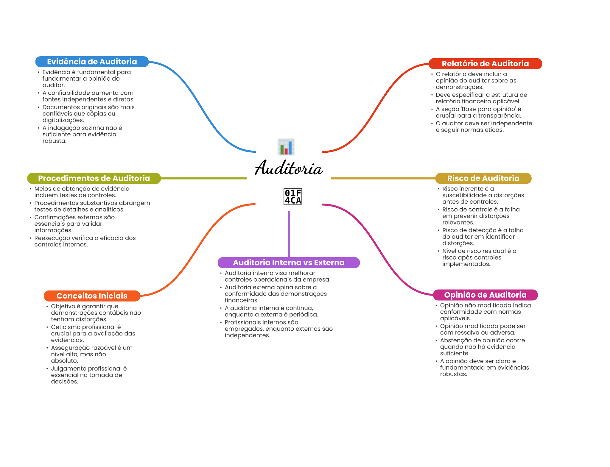 Evidência de Auditoria Relatório de Auditoria Evidência é fundamental para relatório deve incluir a fundamentar a opinião do opinião do auditor sobre as auditor. demonstrações. A confiabilidade aumenta com Deve especificar a estrutura de fontes independentes e diretas. relatório financeiro aplicável. Documentos originais são mais A seção 'Base para é confiáveis que cópias ou crucial para a transparência. digitalizações. auditor deve ser independente A indagação sozinha não é e seguir normas éticas. suficiente para evidência robusta. Auditoria Procedimentos de Auditoria Risco de Auditoria Meios de obtenção de evidência Risco inerente é a incluem testes de controles. 01F suscetibilidade a distorções Procedimentos substantivos abrangem 4CA antes de controles. testes de detalhes e analíticos. Risco de controle é a falha Confirmações externas são em prevenir distorções essenciais para validar relevantes. informações. Risco de detecção é a falha Reexecução verifica a eficácia dos do auditor em identificar controles internos. distorções. Nível de risco residual é O risco após controles Auditoria Interna vs Externa implementados. Auditoria interna visa melhorar controles operacionais da empresa. Auditoria externa opina sobre a Conceitos Iniciais conformidade das demonstrações Opinião de Auditoria financeiras. Objetivo é garantir que A auditoria interna é contínua, Opinião não modificada indica demonstrações contábeis não enquanto a externa é periódica. conformidade com normas tenham distorções. aplicáveis. Profissionais internos são Ceticismo profissional é empregados, enquanto externos são Opinião modificada pode ser crucial para a avaliação das com ressalva ou adversa. independentes. evidências. Abstenção de opinião ocorre Asseguração razoável é um quando não há evidência nível alto, mas não suficiente. absoluto. A opinião deve ser clara e Julgamento profissional é fundamentada em evidências essencial na tomada de robustas. decisões.