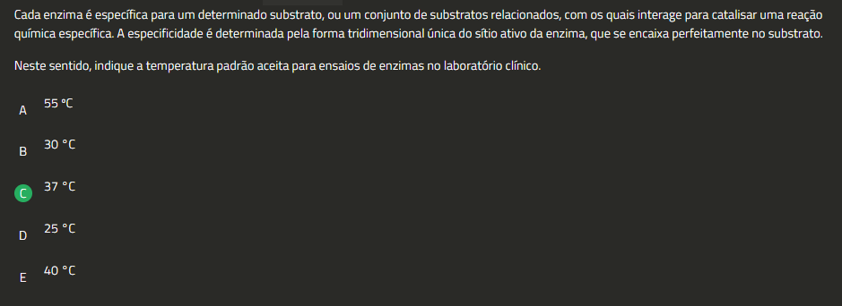 Cada enzima é específica para um determinado substrato, ou um conjunto de substratos relacionados, com quais interage para catalisar uma reação química específica. A especificidade é determinada pela forma tridimensional única do sítio ativo da enzima, que se encaixa perfeitamente no substrato. Neste sentido, indique a temperatura padrão aceita para ensaios de enzimas no laboratório clínico. A 30 °C 37 °C 25 °C D 40 °C E