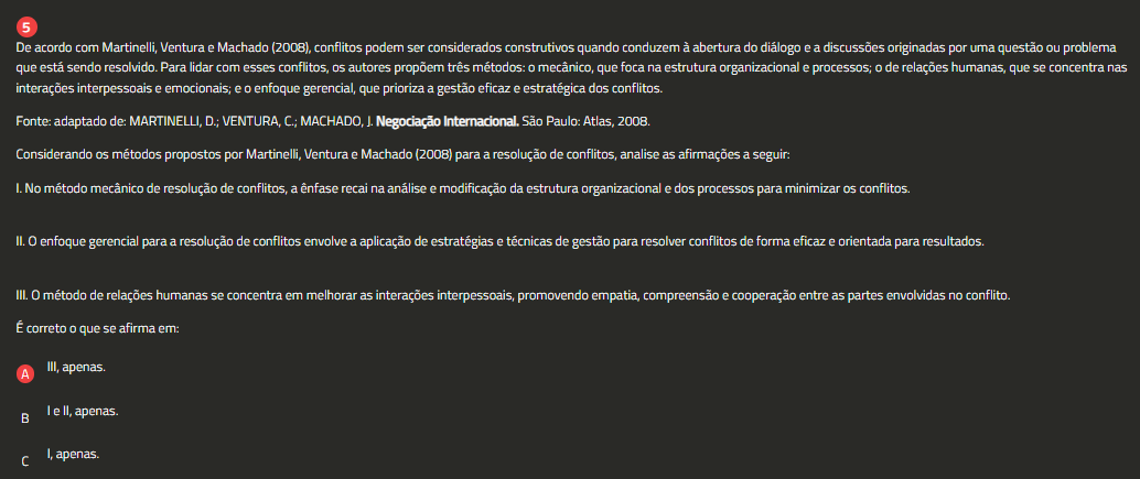 5 De acordo com Martinelli, Ventura e Machado (2008), conflitos podem ser considerados construtivos quando conduzem à abertura do e a discussões originadas por uma questão ou problema que está sendo resolvido. Para lidar com esses conflitos, autores propõem três métodos: 0 mecânico, que foca na estrutura organizacional e processos; 0 de relações humanas, que se concentra nas interações interpessoais e emocionais; e 0 enfoque gerencial, que prioriza a gestão eficaz e estratégica dos conflitos. Fonte: adaptado de: MARTINELLI, D.; VENTURA, C.; MACHADO, Negociação Internacional. São Paulo: Atlas, 2008. Considerando métodos propostos por Martinelli, Ventura e Machado (2008) para a resolução de conflitos, analise as afirmações a seguir: No método mecânico de resolução de conflitos, a ênfase recai na análise e modificação da estrutura organizacional e dos processos para minimizar conflitos. enfoque gerencial para a resolução de conflitos envolve a aplicação de estratégias e técnicas de gestão para resolver conflitos de forma eficaz e orientada para resultados. III. método de relações humanas se concentra em melhorar as interações interpessoais, promovendo empatia, compreensão e cooperação entre as partes envolvidas no conflito. E correto que se afirma em: III, apenas. B le II, apenas. C I, apenas.
