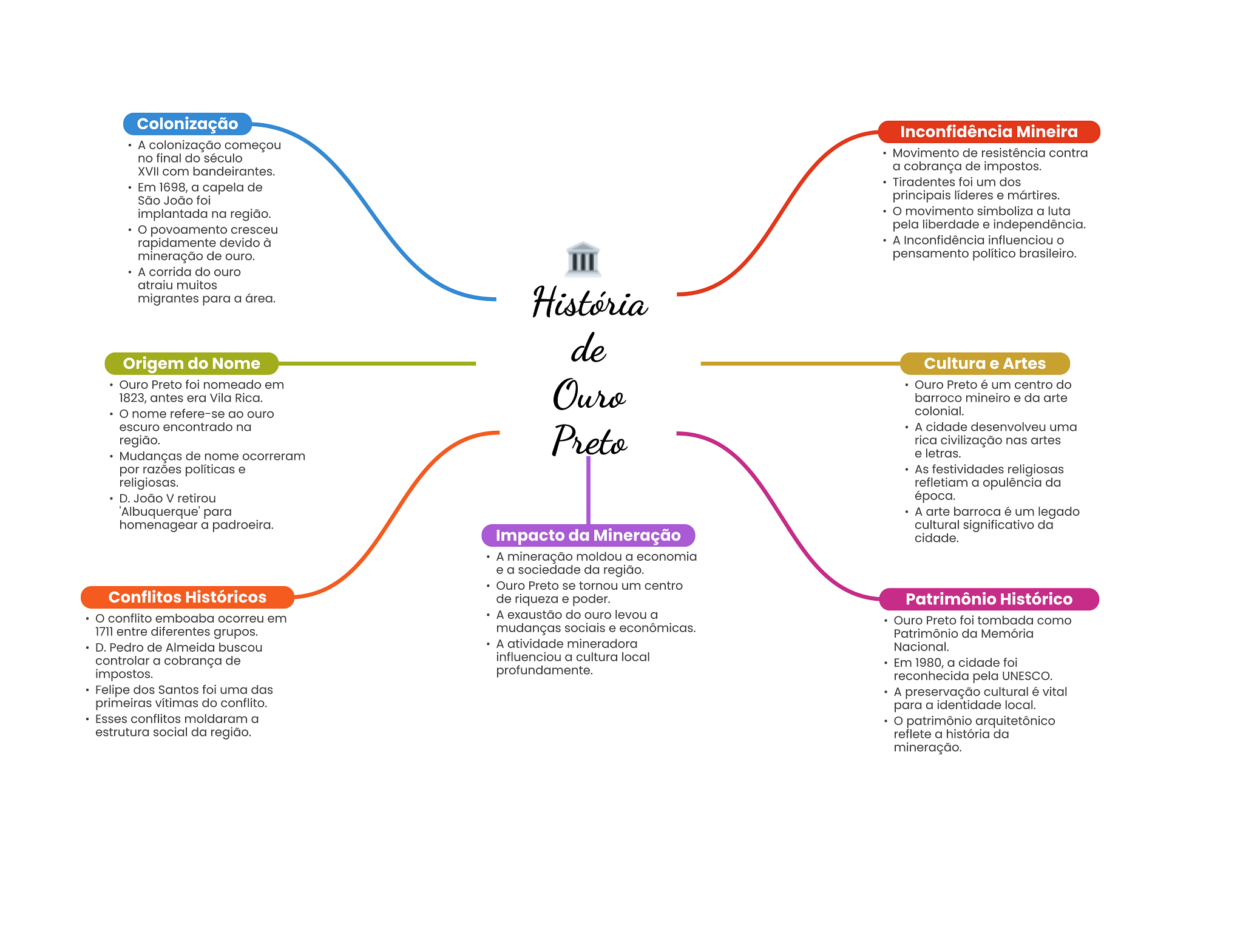 Colonização Inconfidência Mineira A colonização começou no final do século Movimento de resistência contra XVII com bandeirantes. a cobrança de impostos. Tiradentes foi um dos Em 1698, a capela de São João foi principais líderes e mártires. implantada na região. O movimento simboliza a luta povoamento cresceu pela liberdade e independência. rapidamente devido à A Inconfidência influenciou mineração de ouro. pensamento político brasileiro. A corrida do ouro atraiu muitos migrantes para a área. História de Origem do Nome Cultura e Artes Ouro Preto foi nomeado em 1823, antes era Vila Rica. Ouro Ouro Preto é um centro do barroco mineiro e da arte nome refere-se ao ouro colonial. escuro encontrado na A cidade desenvolveu uma região. Preto rica civilização nas artes Mudanças de nome ocorreram e letras. por razões políticas e As festividades religiosas religiosas. refletiam a opulência da D. João V retirou época. para A arte barroca é um legado homenagear a padroeira. cultural significativo da Impacto da Mineração cidade. A mineração moldou a economia e a sociedade da região. Ouro Preto se tornou um centro Conflitos Históricos de riqueza e poder. Patrimônio Histórico conflito emboaba ocorreu em A exaustão do ouro levou a Ouro Preto foi tombada como 1711 entre diferentes grupos. mudanças sociais e econômicas. Patrimônio da Memória D. Pedro de Almeida buscou A atividade mineradora Nacional. controlar a cobrança de influenciou a cultura local Em 1980, a cidade foi impostos. profundamente. reconhecida pela UNESCO. Felipe dos Santos foi uma das A preservação cultural é vital primeiras vítimas do conflito. para a identidade local. Esses conflitos moldaram a O patrimônio arquitetônico estrutura social da região. reflete a história da mineração.