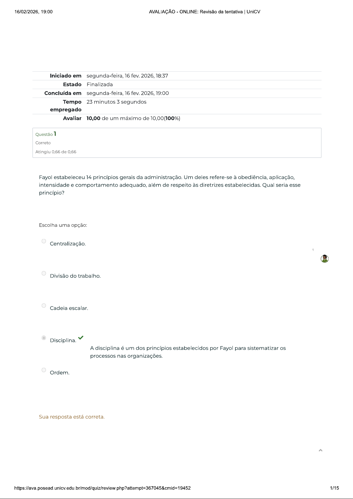 16/02/2026, 19:00 AVALIAÇÃO ONLINE: Revisão da tentativa UniCV Iniciado em segunda-feira, 16 fev. 2026, 18:37 Estado Finalizada Concluída em segunda-feira, 16 fev. 2026, 19:00 Tempo 23 minutos 3 segundos empregado Avaliar 10,00 de um máximo de 10,00(100%) Questão 1 Correto Atingiu 0,66 de 0,66 Fayol estabeleceu 14 princípios gerais da administração. Um deles refere-se à obediência, aplicação, intensidade e comportamento adequado, além de respeito às diretrizes estabelecidas. Qual seria esse princípio? Escolha uma opção: Centralização. Divisão do trabalho. Cadeia escalar. Disciplina. A disciplina é um dos princípios estabelecidos por Fayol para sistematizar os processos nas organizações. Ordem. Sua resposta está correta. 1/1516/02/2026, 19:00 AVALIAÇÃO ONLINE: Revisão da tentativa UniCV Questão 2 Correto Atingiu 0,67 de 0,67 (BNDES, 2012). Livros disseminam casos de sucesso, cursos ensinam executivos a inovar, eventos celebram tema e prêmios reconhecem os maiores talentos. [...] Oded Shenkar, professor de Ohio State University [], seguiu caminho contrário. Seu livro [...] celebra a cópia, e não original. pesquisador mostra como seguidores conseguem gerar valor copiando. [...] Copiar não é bom para ego dos executivos, mas pode ser ótimo para bolso dos acionistas. iPod não foi primeiro reprodutor de músicas. conceito de tablet foi criado muitos anos antes do lançamento do iPad. Isso não impediu a Apple de dominar mercado e capturar enorme valor. Não se pode negar a importância da inovação da empresa, mas seus lucros vêm de uma estratégia mais ampla, [...] Revista Carta Capital. 20 jun. 2012, Um argumento utilizado por aqueles que defendem a posição do pesquisador mencionado no texto está contido na seguinte afirmação: Escolha uma opção: Tanto a inovação quanto a imitação devem ser incentivadas porque ambas evidenciam na mesma proporção caráter da originalidade do produto no mercado. A imitação é aceitável porque permite economizar custos em pesquisa Um conjunto de estratégias de mercado pode fazer científica, em desenvolvimento e em com que a imitação amplie as potencialidades de um marketing. produto ou serviço e sua aderência ao mercado. A imitação é uma capacidade estratégica essencial porque as empresas devem priorizar os impulsos dos consumidores compulsivos. A velocidade da inovação está diminuindo porque desenvolvimento da pesquisa para novas tecnologias estagnou. A inovação reduz riscos no empreendimento porque há garantia de aceitação dos produtos pelos consumidores. Sua resposta está correta. 2/1516/02/2026, 19:00 AVALIAÇÃO ONLINE: Revisão da tentativa UniCV Questão 3 Correto Atingiu 0,66 de 0,66 organograma representa os cargos da empresa e a maneira como são organizados. Assim, oferece uma visão da estrutura de subordinação e também das diversas atividades realizadas por diferentes pessoas. Sobre as informações transmitidas por um organograma, é correto afirmar que: Escolha uma opção: formato do organograma não reflete que as empresas fazem na prática, é meramente ilustrativo. Um organograma não pode servir como base para tomada de decisões estratégicas. As relações de subordinação e autoridade são indicadas pelas linhas tracejadas que mostram ligações entre superior e subordinado. Os níveis de gestão são indicados pelas camadas horizontais do diagrama. Os funcionários de mesma hierarquia e que Níveis de gestão são respondem a uma mesma pessoa encontram-se no mesmo exatamente uma das nível. informações que organograma transmite. As caixas de um organograma representam diferentes tarefas, que não fazem relação com a hierarquia organizacional. Sua resposta está correta. 3/1516/02/2026, 19:00 AVALIAÇÃO ONLINE: Revisão da tentativa UniCV Questão 4 Correto Atingiu 0,67 de 0,67 Adaptado de TSE (2012). As organizações de aprendizagem compreendem organizações que se encontram em constante aprendizagem e seu desenvolvimento ocorre à medida que seus colaboradores adquirem novos conhecimentos. Nessas organizações, ocorre um fenômeno denominado Tensão Criativa, que é considerada motor da inovação nas organizações. Em relação à Tensão Criativa, assinale a alternativa que corresponde a uma de suas características. Escolha uma opção: Reflexão crítica. Essa é uma das habilidades para a aprendizagem que está relacionada ao momento de tensão criativa. Empatia. Empowerment. Administração participativa. Pensamento holístico. Sua resposta está correta. 4/1516/02/2026, 19:00 AVALIAÇÃO ONLINE: Revisão da tentativa UniCV Questão 5 Correto Atingiu 0,67 de 0,67 As teorias clássicas da administração ocuparam um papel decisivo na transformação da economia mundial, uma vez que esta introduziu métodos mais sofisticados para a produção. Acerca do processo administrativo, analise as afirmativas a seguir. I. Fayol introduziu a ideia de uma teoria administrativa focada na realização das tarefas. II. A teoria burocrática concebe a organização como um sistema, enfatizando a eficiência do trabalho. III. Um importante elemento que emergiu da teoria comportamental foi a concepção de "desenvolvimento organizacional", em que indivíduos atuam em prol de um objetivo comum. Está correto que se afirma em: Escolha uma opção: III, apenas. le III, apenas As alternativas que enfatizam ideários de Fayol, em torno da concepção da Administração como uma ciência aplicada a racionalização e ao planejamento das atividades operacionais; assim como na ideia da teoria comportamental e desenvolvimento organizacional, que põe luz sobre a influência do ambiente interno e externo organizacional no seu processo de tomada de decisões, são consideradas como corretas. Por outro lado, a alternativa que vincula a teoria burocrática a ideia de sistemas (teoria dos sistemas), não pode ser considerada correta, uma vez que a teoria burocrática faz uso da 