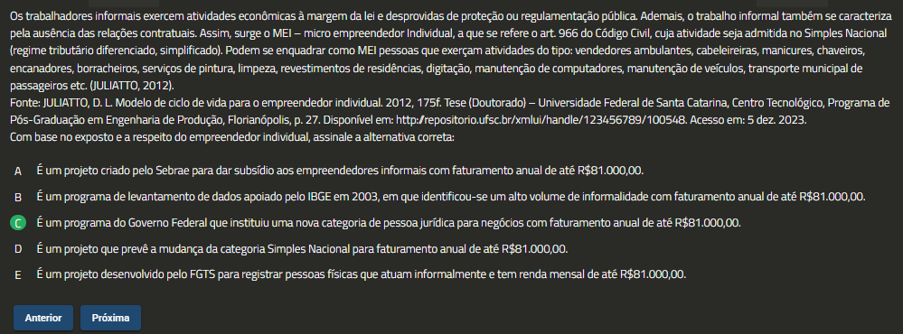 Os trabalhadores informais exercem atividades econômicas à margem da lei e desprovidas de proteção ou regulamentação pública. Ademais, 0 trabalho informal também se pela ausência das relações contratuais. Assim, surge 0 MEI micro empreendedor Individual, a que se refere 0 art. 966 do Código Civil, cuja atividade seja admitida no Simples Nacional (regime tributário diferenciado, simplificado). Podem se enquadrar como MEI pessoas que exerçam atividades do tipo: vendedores ambulantes, cabeleireiras, manicures, chaveiros, encanadores, borracheiros, serviços de pintura, limpeza, revestimentos de residências, digitação, manutenção de computadores, manutenção de veículos, transporte municipal de passageiros etc. (JULIATTO, 2012). Fonte: JULIATTO, D.L. Modelo de ciclo de vida para 0 empreendedor individual. 2012, 175f. Tese (Doutorado) Universidade Federal de Santa Catarina, Centro Tecnológico, Programa de Pós-Graduação em Engenharia de Produção, Florianópolis, p. 27. Disponível em: Acesso em: 5 dez. 2023. Com base no exposto ea respeito do empreendedor individual, assinale a alternativa correta: A É um projeto criado pelo Sebrae para dar subsídio aos empreendedores informais com faturamento anual de R$81.000,00. É um programa de levantamento de dados apoiado pelo IBGE em 2003, em que identificou-se um alto volume de informalidade com faturamento anual de até R$81.000,00. É um programa do Governo Federal que instituiu uma nova categoria de pessoa jurídica para negócios com faturamento anual de até R$81.000,00. D É um projeto que prevê a mudança da categoria Simples Nacional para faturamento anual de R$81.000,00. E É um projeto desenvolvido pelo FGTS para registrar pessoas físicas que atuam informalmente e tem renda mensal de R$81.000,00. Anterior