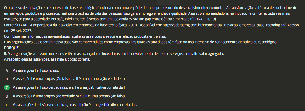 0 processo de inovação em empresas de base tecnológica funciona como uma espécie de mola propulsora do desenvolvimento econômico. A transformação sistêmica de conhecimento em serviços, produtos e processos, melhora 0 padrão de vida das pessoas. Isso gera emprego e renda de qualidade. Assim, 0 empreendedorismo inovador é um tema cada vez mais estratégico para a sociedade. No infelizmente, é senso comum que ainda exista um gap entre ciência e mercado (SEBRAE, 2018). Fonte: SEBRAE. A importância da inovação em empresas de base tecnológica. 2018. Disponível em: https:/sebraemg.com.br/importancia-inovacao-empresas-base-tecnologica/.Acesso em: 25 set. 2023. Com base nas informações apresentadas, avalie as asserções a seguir e a relação proposta entre elas: As organizações que operam nessa base são compreendidas como empresas nas quais as atividades têm foco no intensivo de conhecimento ou tecnológico. PORQUE II. As organizações utilizam processos e técnicas avançadas e inovadoras no desenvolvimento de bens e serviços, com alto valor agregado. A respeito dessas asserções, assinale a opção correta: A As asserções le são falsas. A asserção I é uma proposição falsa e a II é uma proposição verdadeira. As asserções le são verdadeiras, e a II uma justificativa correta da D A asserção I é uma proposição verdadeira e a II é uma proposição falsa. E As asserções le são verdadeiras, mas a II não é uma justificativa correta da