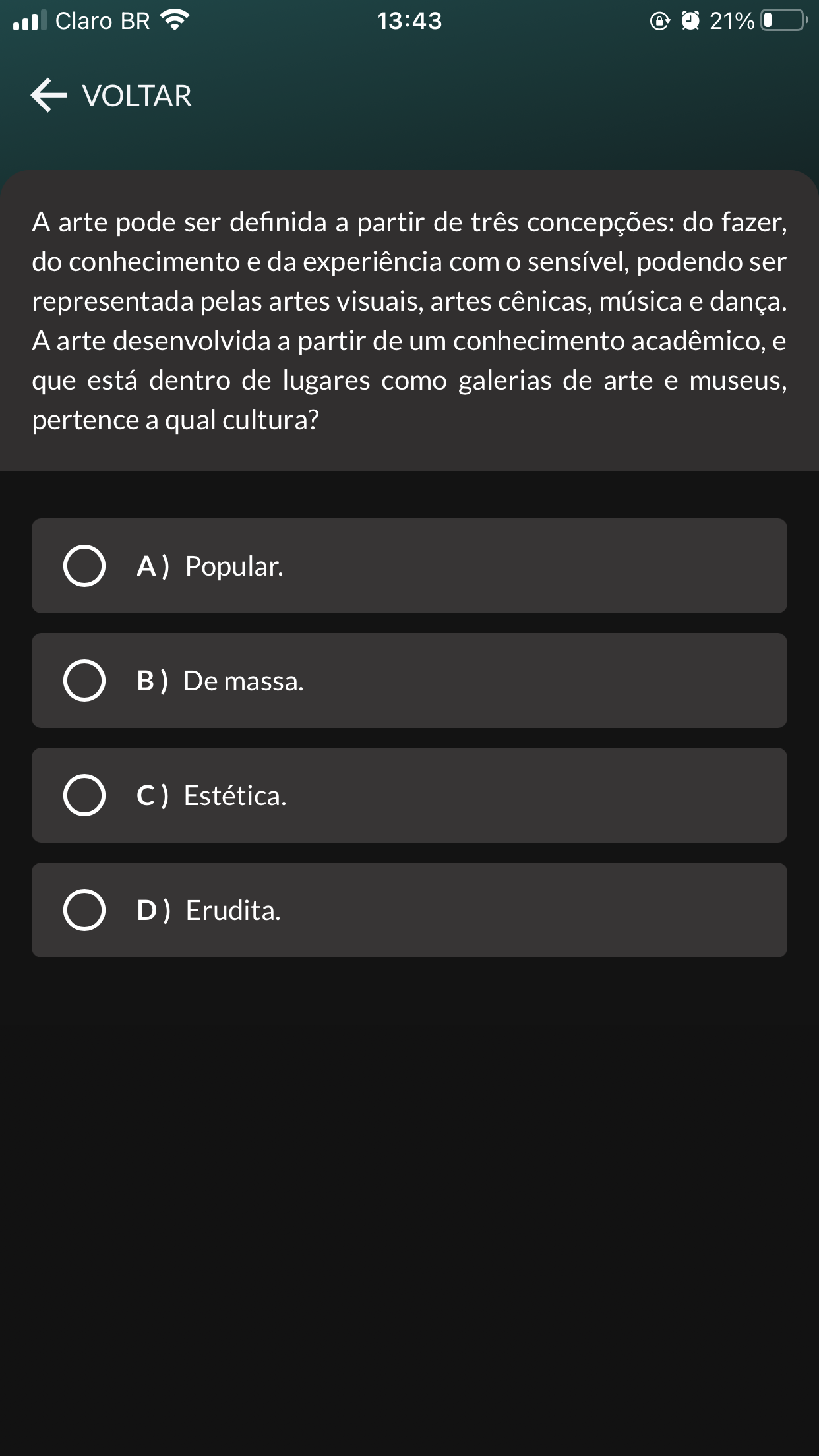 Claro BR 13:43 21% VOLTAR A arte pode ser definida a partir de três concepções: do fazer, do conhecimento e da experiência com sensível, podendo ser representada pelas artes visuais, artes cênicas, música e dança. A arte desenvolvida a partir de um conhecimento acadêmico, e que está dentro de lugares como galerias de arte e museus, pertence a qual cultura? A) Popular. B) De massa. C) Estética. D) Erudita.