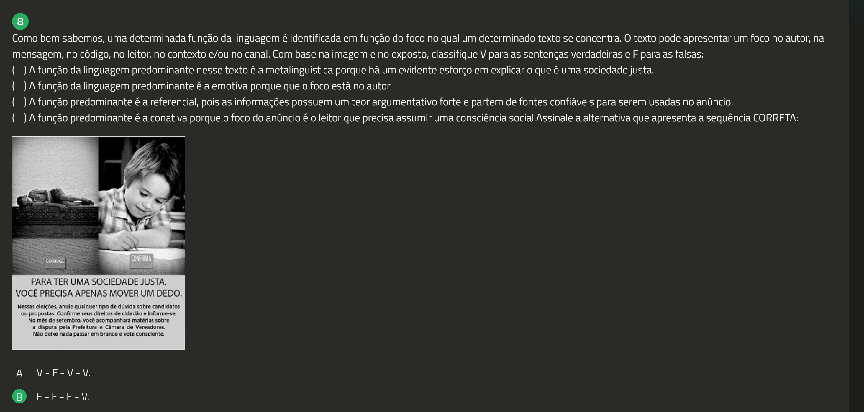 8 Como bem sabemos, uma determinada função da linguagem é identificada em função do foco no qual um determinado texto se concentra. 0 texto pode apresentar um foco no autor, na mensagem, no código, no leitor, no contexto e/ou no canal. Com base na imagem e no exposto, classifique V para as sentenças verdadeiras e F para as falsas: ( ) A função da linguagem predominante nesse texto é a metalinguística porque há um evidente esforço em explicar que é uma sociedade justa. ( ) função da linguagem predominante é a emotiva porque que foco está no autor. ( ) função predominante é a referencial, pois as informações possuem um teor argumentativo forte e partem de fontes confiáveis para serem usadas no anúncio. função predominante é a conativa porque foco do anúncio é leitor que precisa assumir uma consciência social.Assinale a alternativa que apresenta a sequência CORRETA: CORRIGE CONFIRMA PARA TER UMA SOCIEDADE JUSTA, VOCÊ PRECISA APENAS MOVER UM DEDO. Nessas anule qualquer tipo de dúvida sobre candidatos ou propostas. Confirme seus direitos de cidadão e No mês de setembro, você matérias sobre a disputa pela Prefeitura e Câmara de Vereadores. Não nada passar em branco e vote consciente. V F V V. B F-F-F-V.